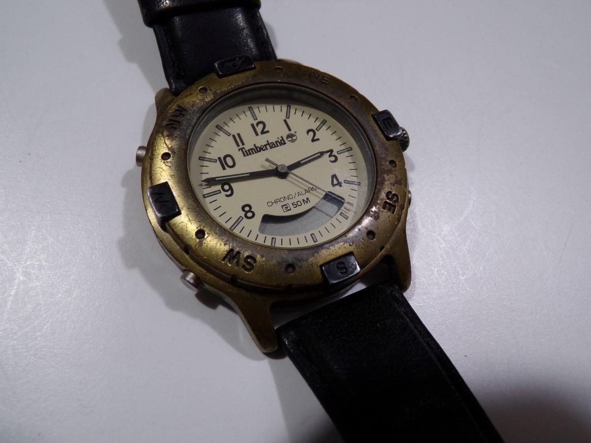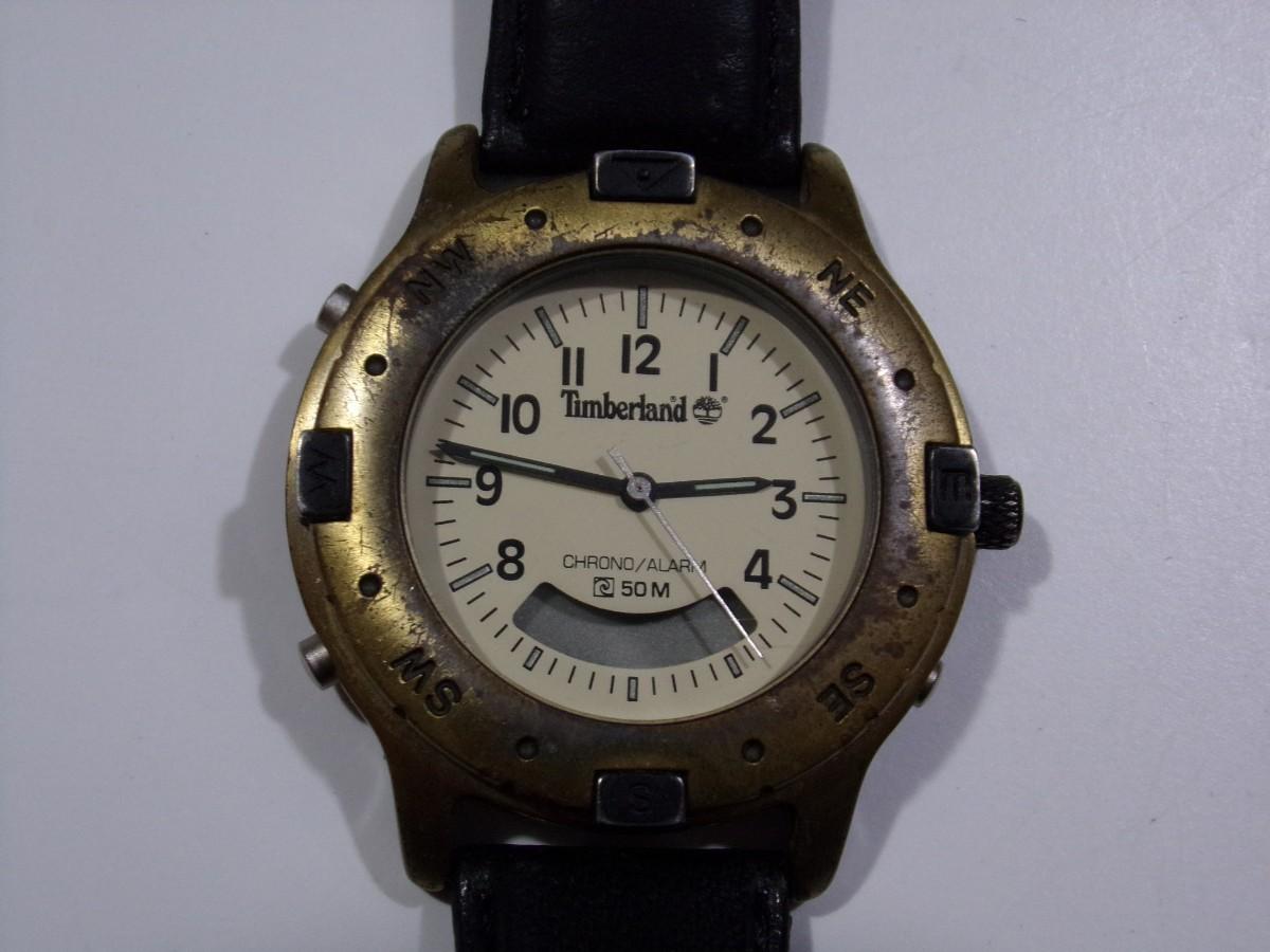 Outdoorsman's watch. Timberland chronograph & direction finding quartz movement watch with LCD chronograph display & rotating compass point dial. Leather band. You have to know/learn how to use this. It needs a new battery.. used