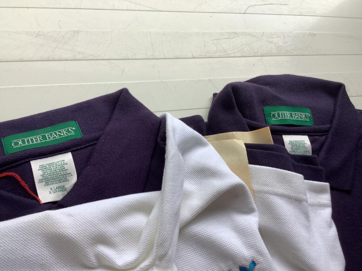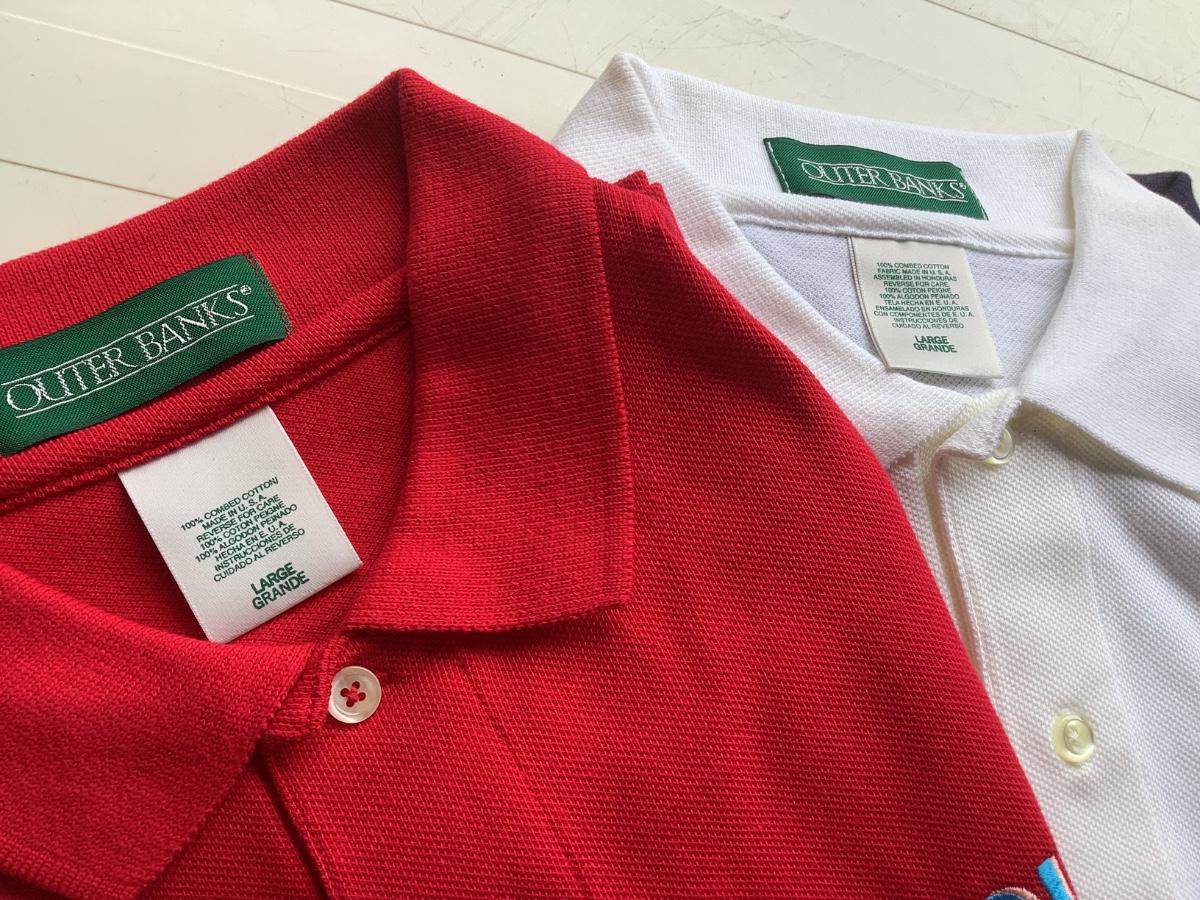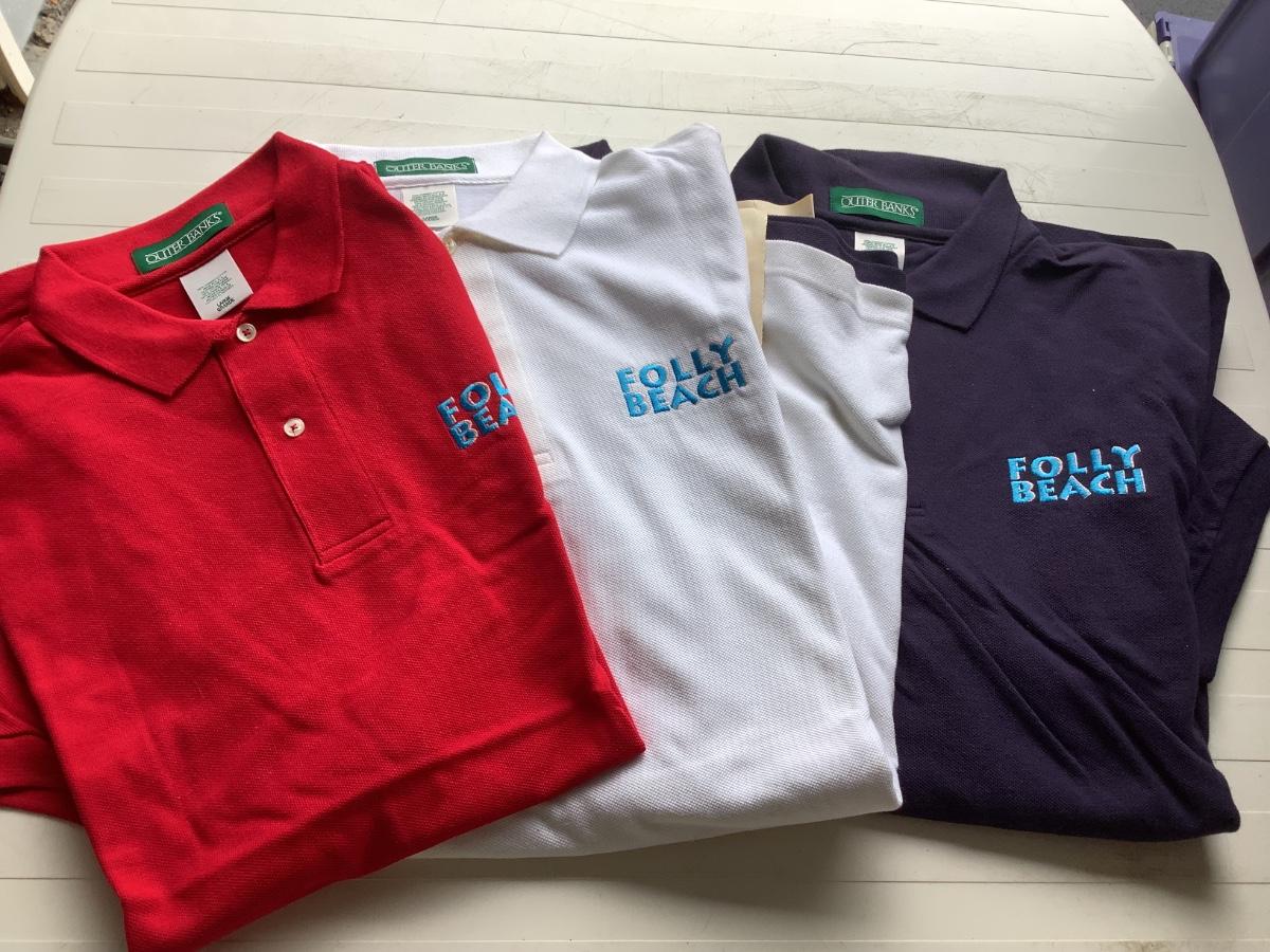 Outer Banks short sleeve men's polos with "Folly Beach", red & white large, 2 navy blue x-large