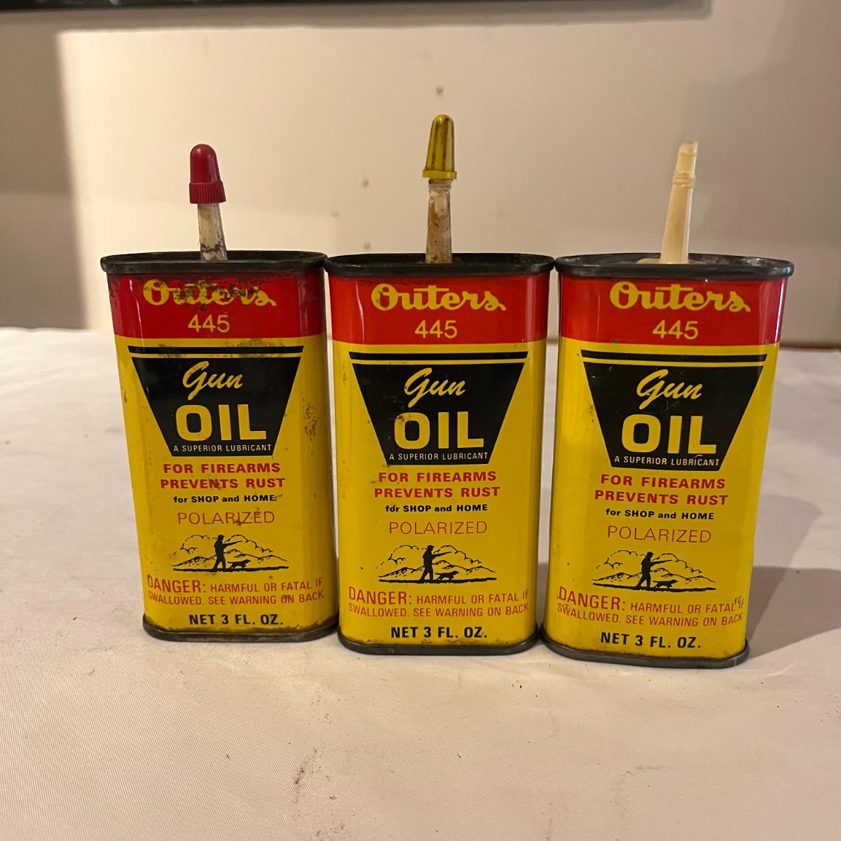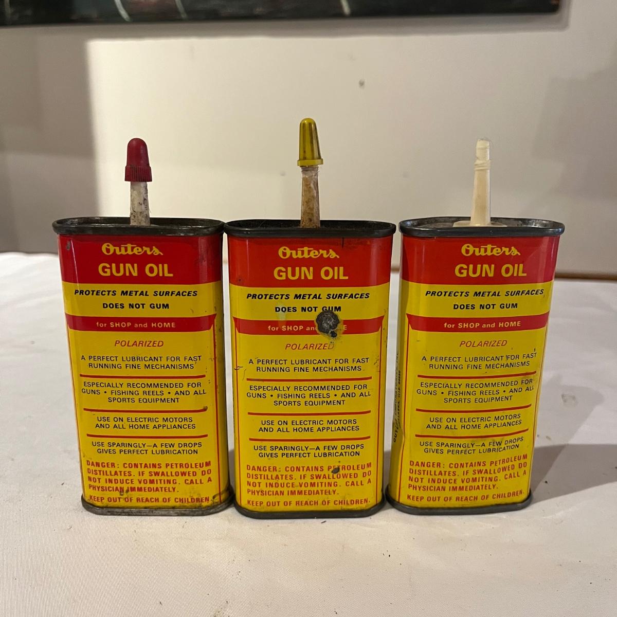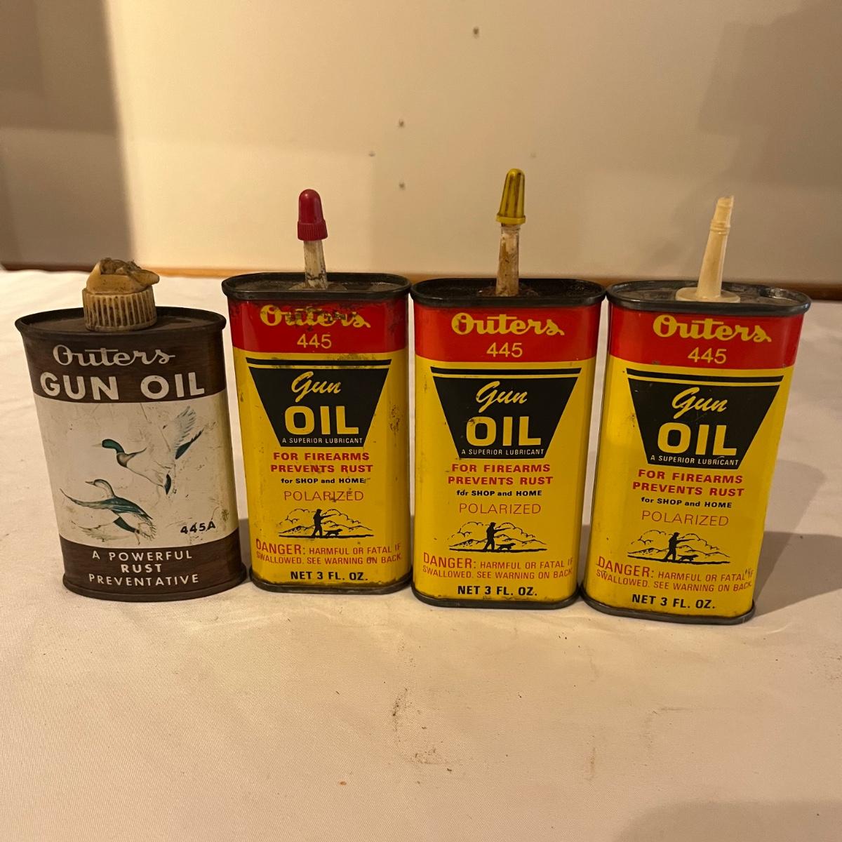 Lot includes three Outers yellow gun oil can and a Outers gun oil can in brown and white.