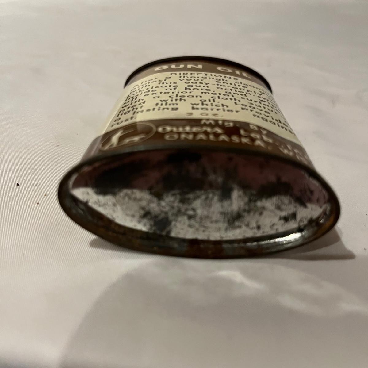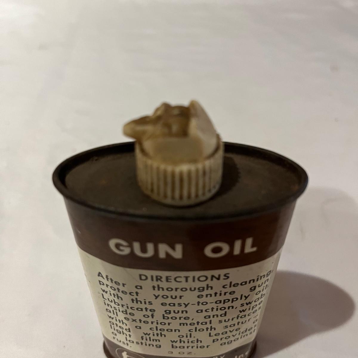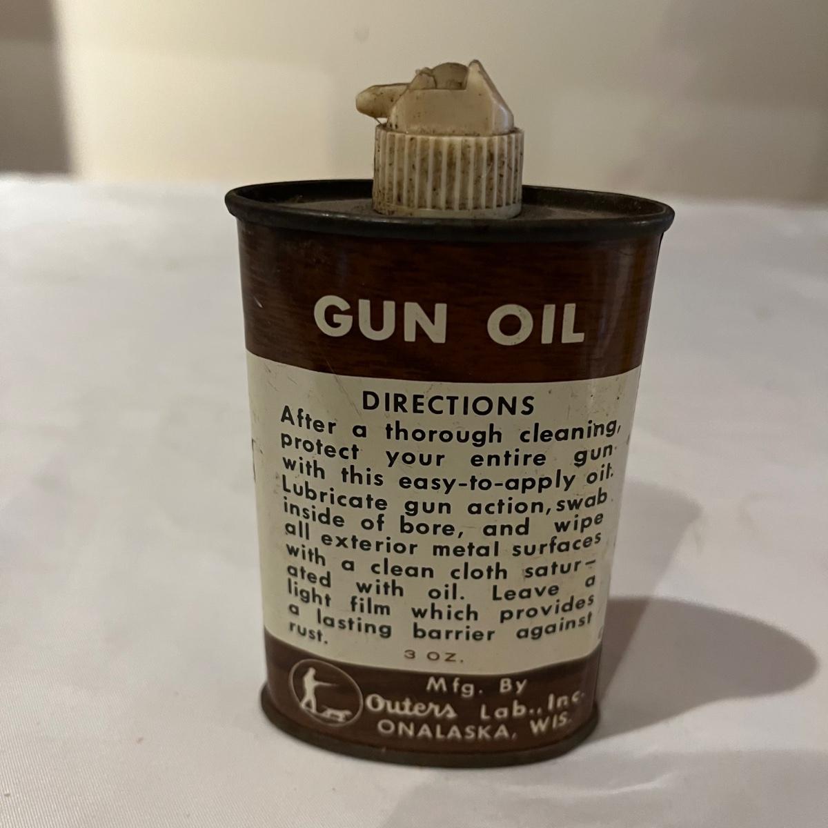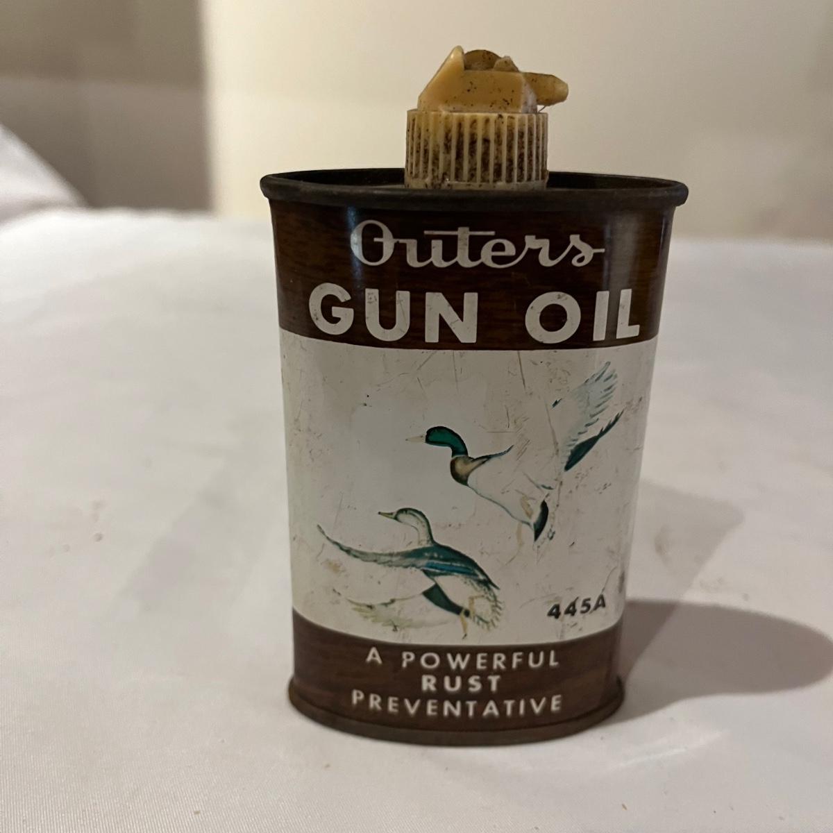 Lot includes three Outers yellow gun oil can and a Outers gun oil can in brown and white.
