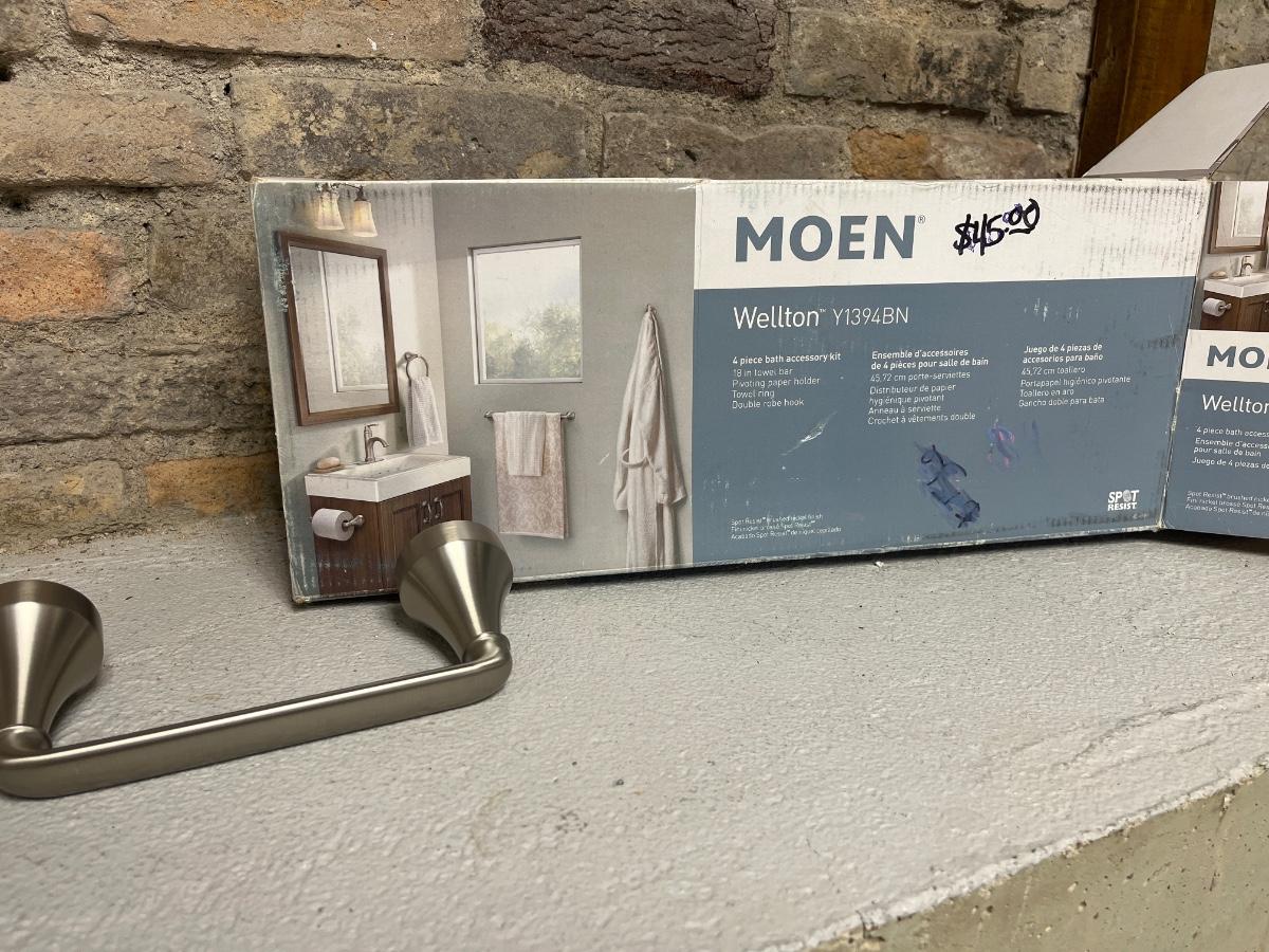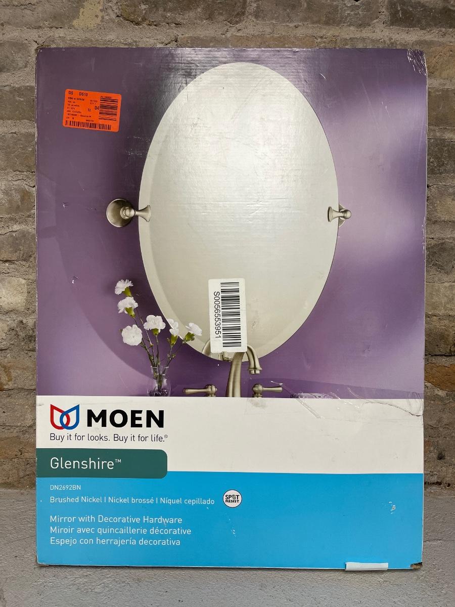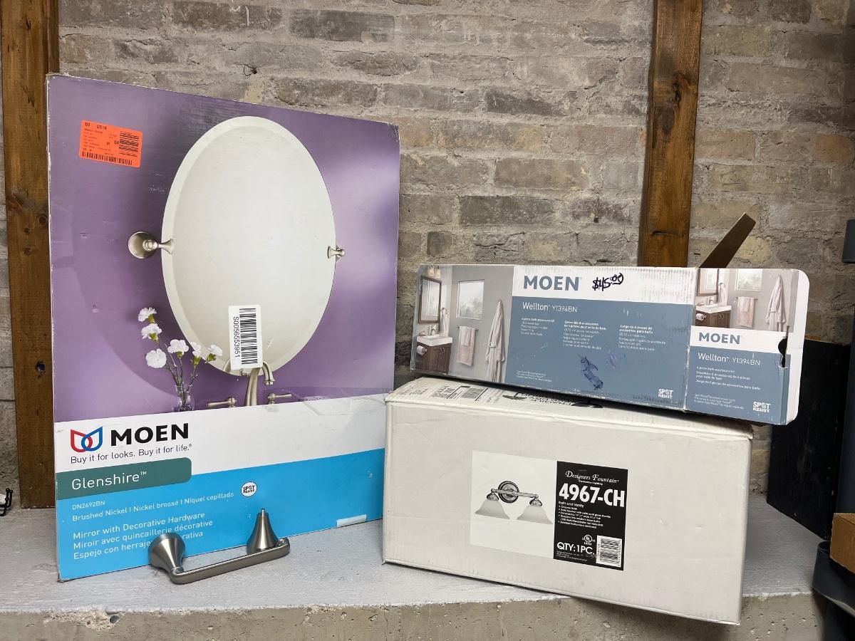 Moen oval mirror, vanity light fixture, 4 piece accessory kit and toilet tissue holder, all NIB
