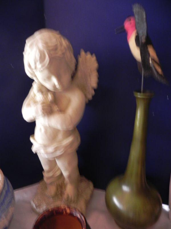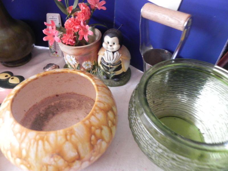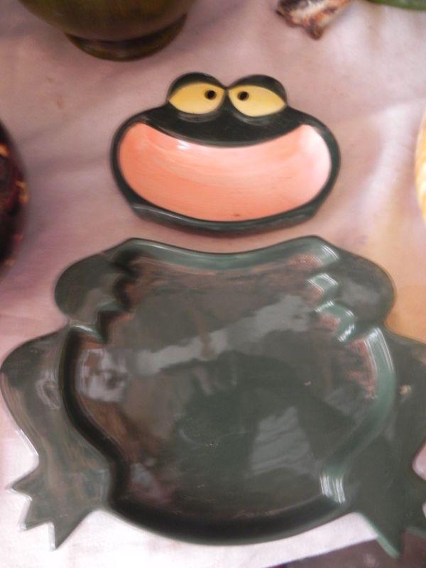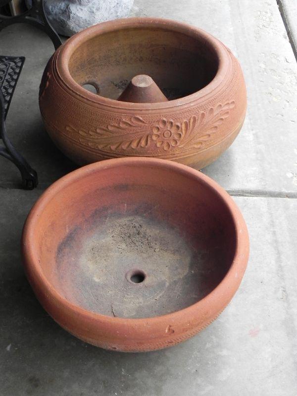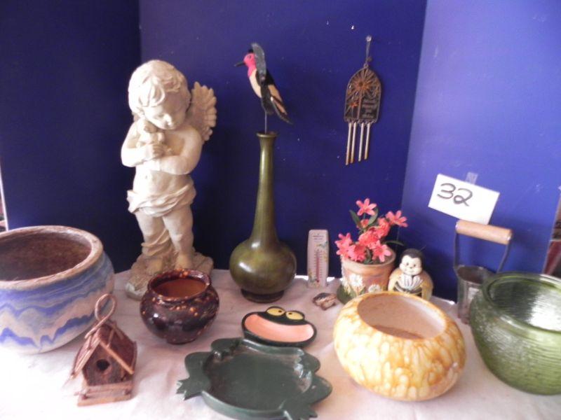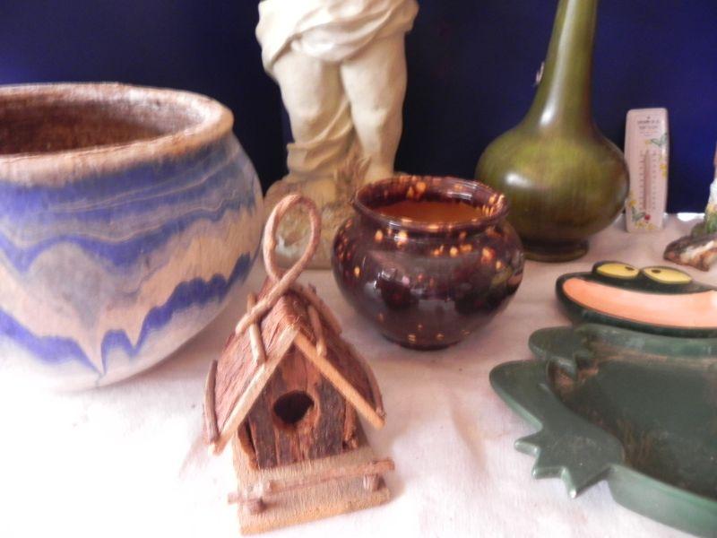 TERRACOTTA HOSE HOLDER, SEVERAL PLANTTING POTS, CHIP & DIP FROG PLATTER, STATUE MADE OF HARD PLASTIC, AND MORE