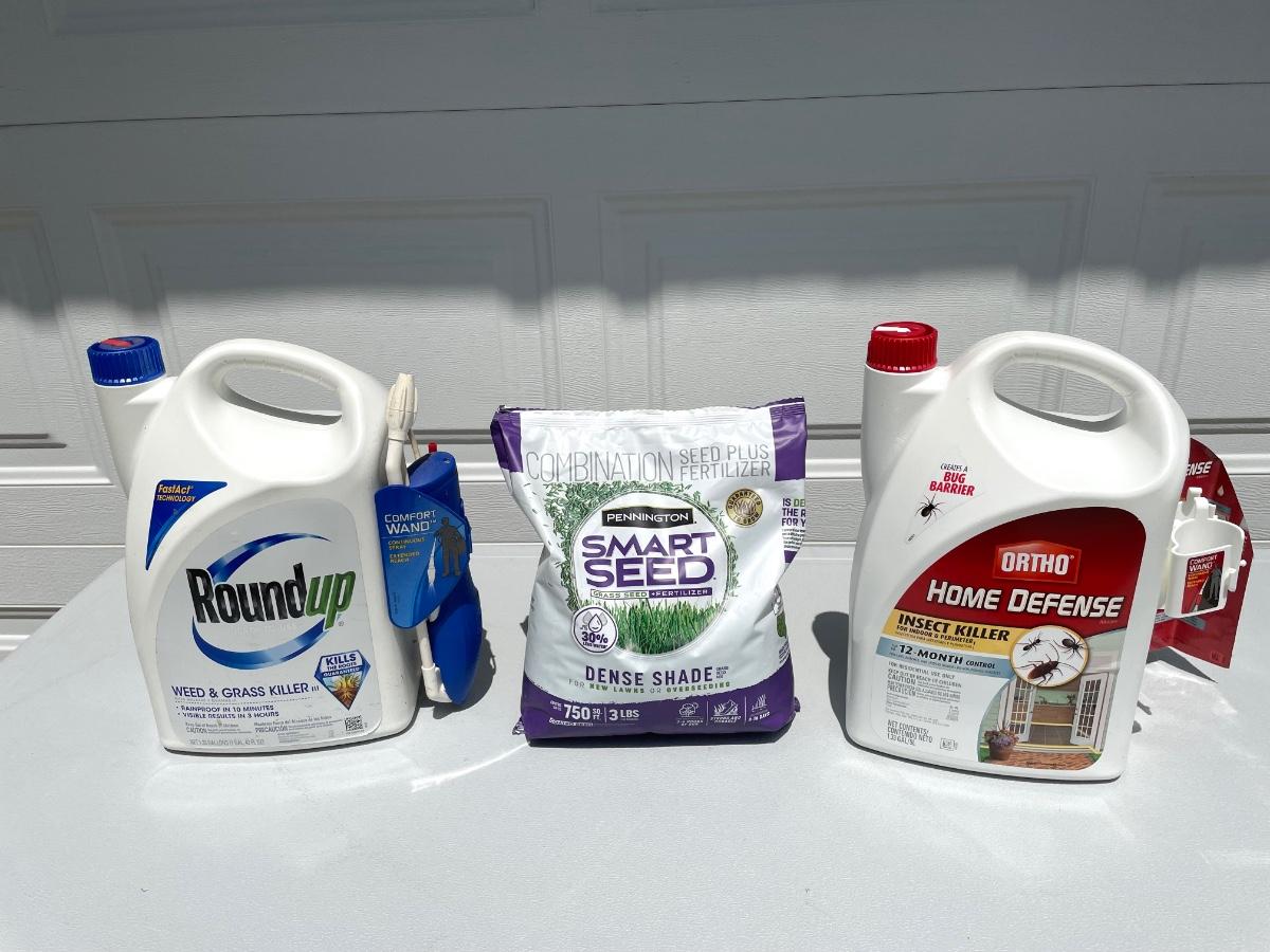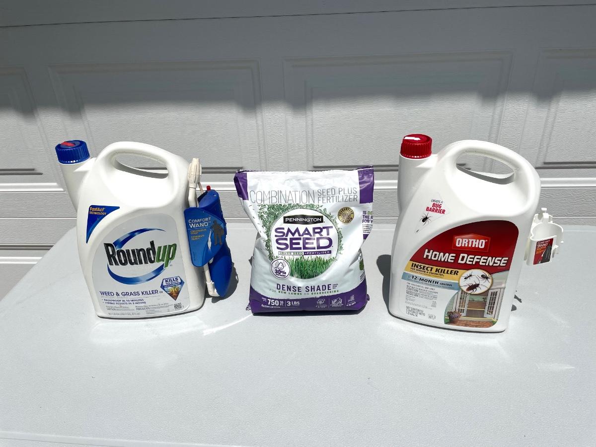 Outside Garden Lot. Round Up is full, Home Defense Is full and 3 pound Smart Seed bag is half full.