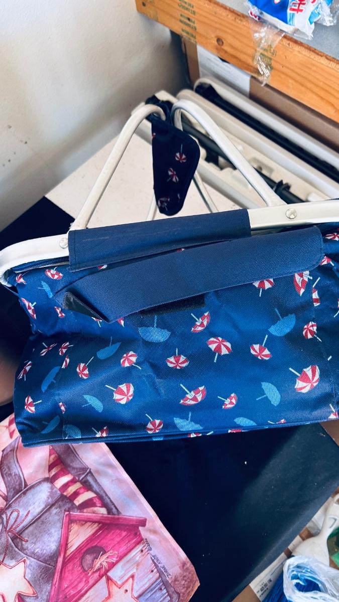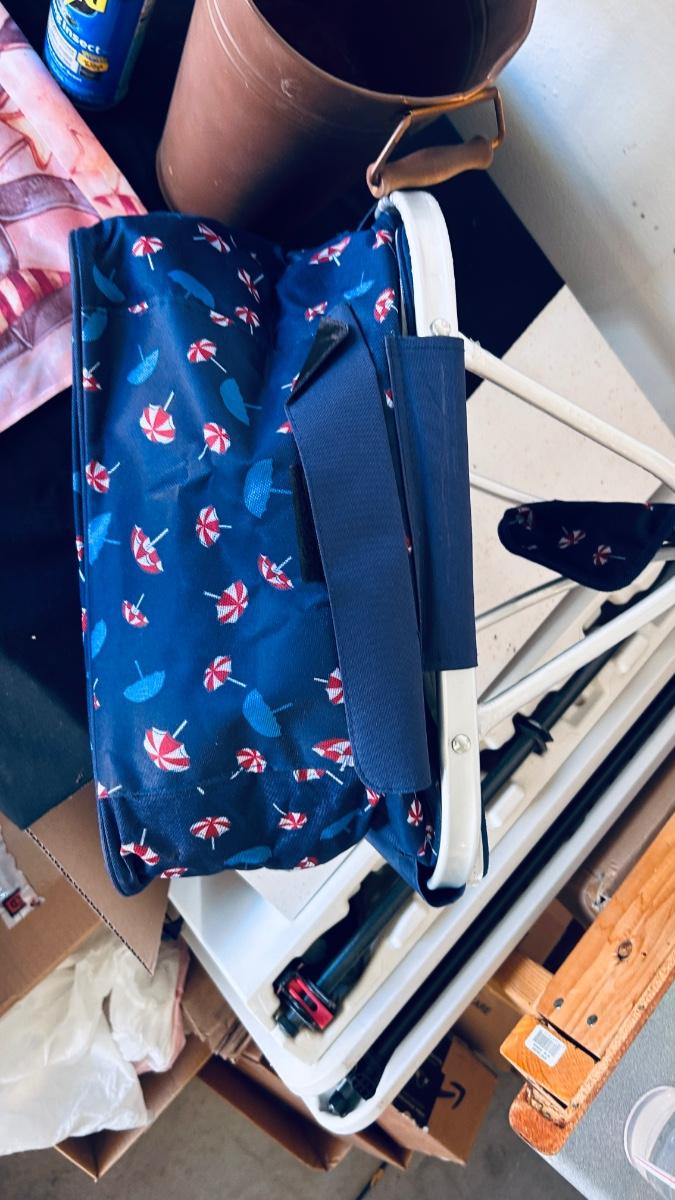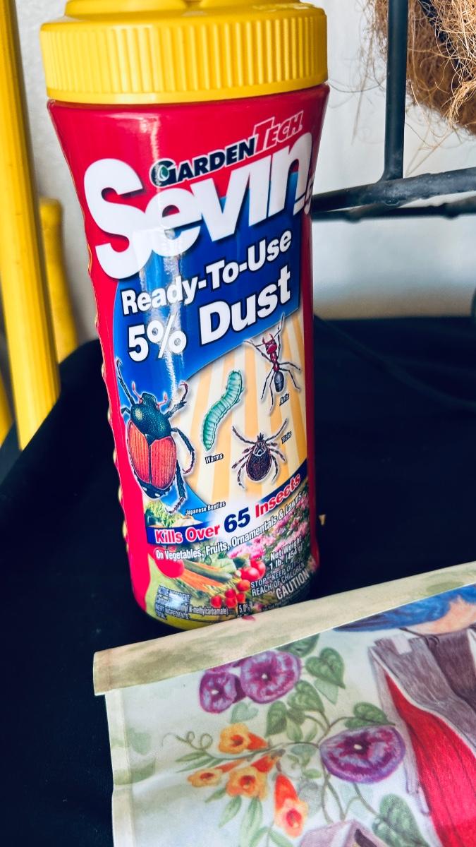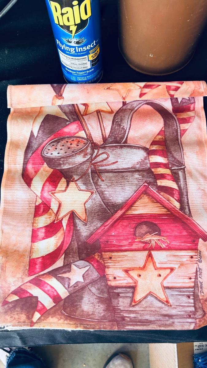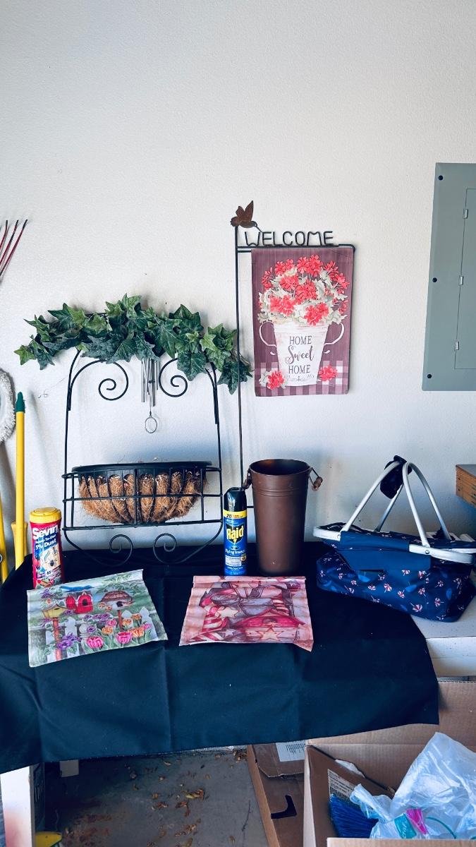 OUTSIDE SEASONAL WELCOME FLAGS, PICNIC BASKET, PESTICIDES, WALL PLANTER, AND WIND CHIME