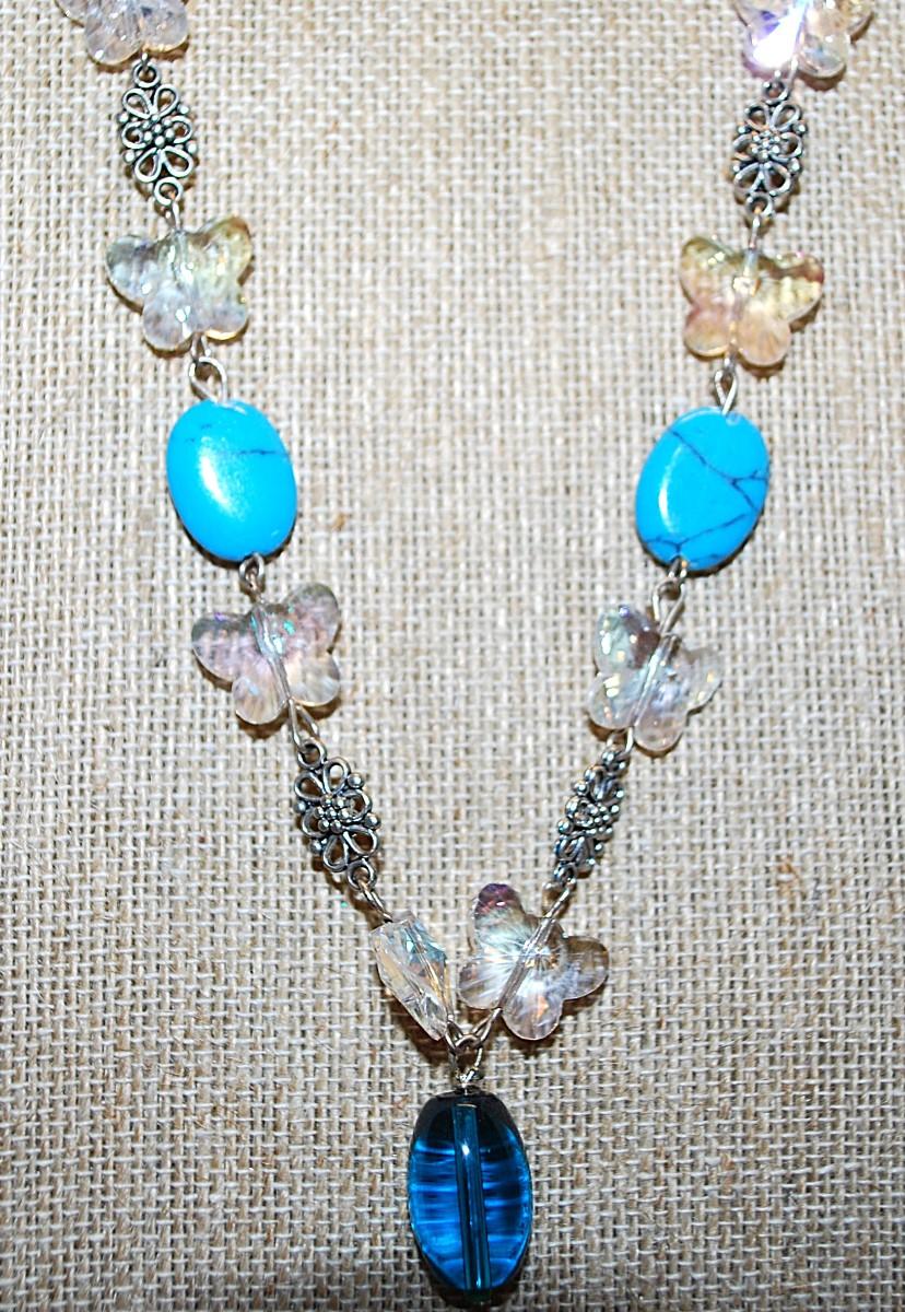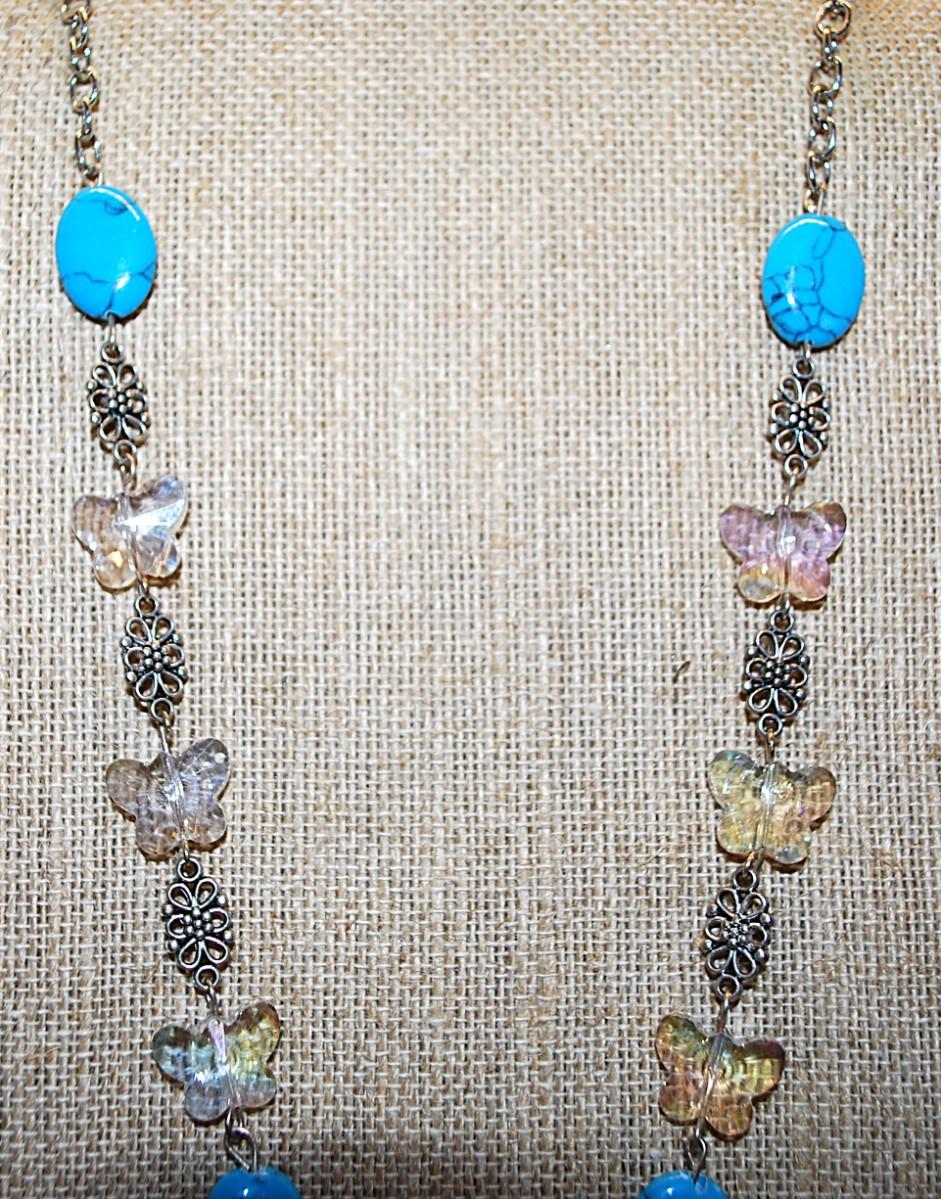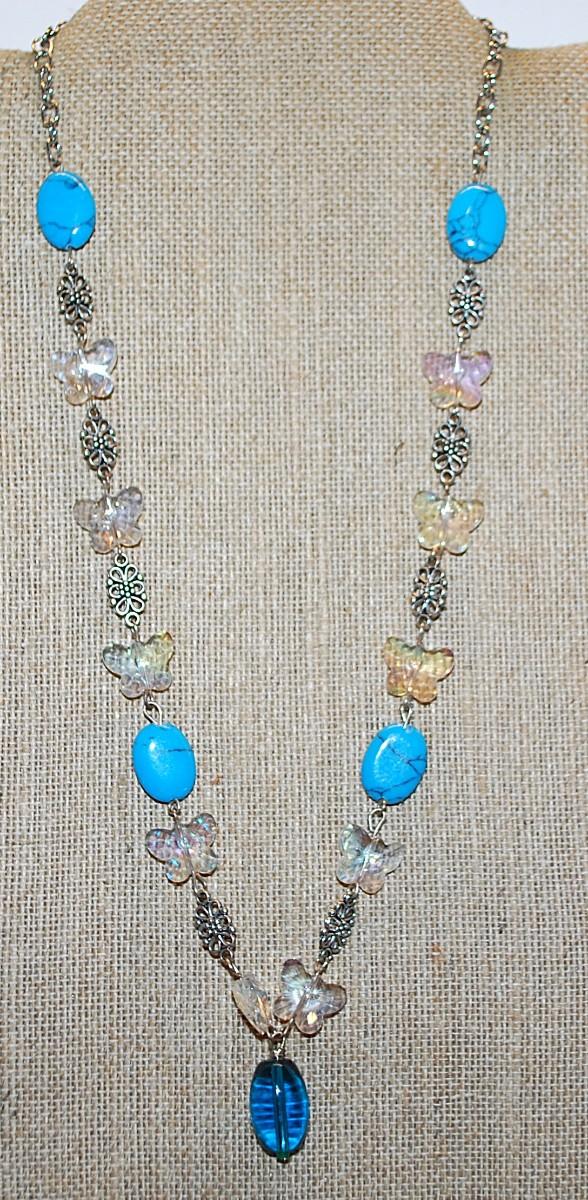 Oval Blue Crackled "Jade" Stones NECKLACE with Clear Acrylic BUTTERFLY Accents & Flower Spacers on a Silver Tone Chain and Lobster Clasp 20" L