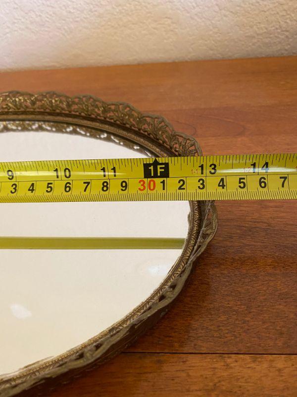 Brass rimmed mirror. Can sit on surface as a tray or hang on the wall. Good condition, about 13" size.