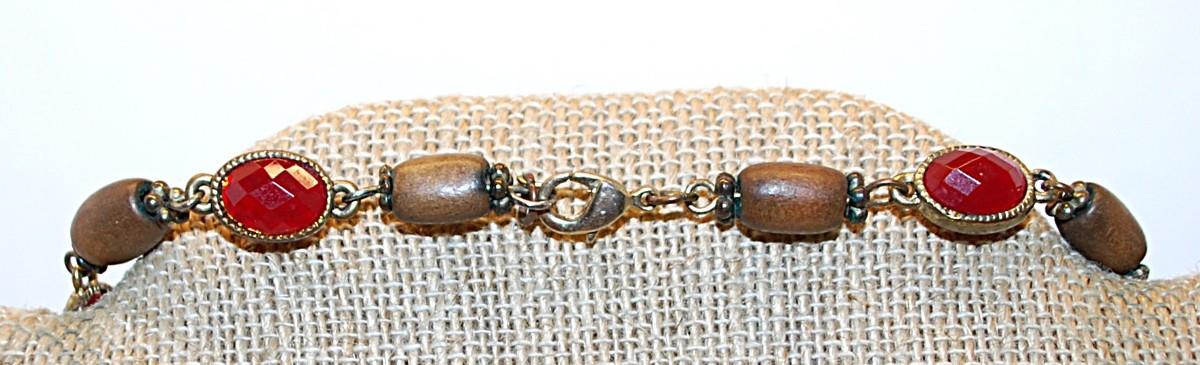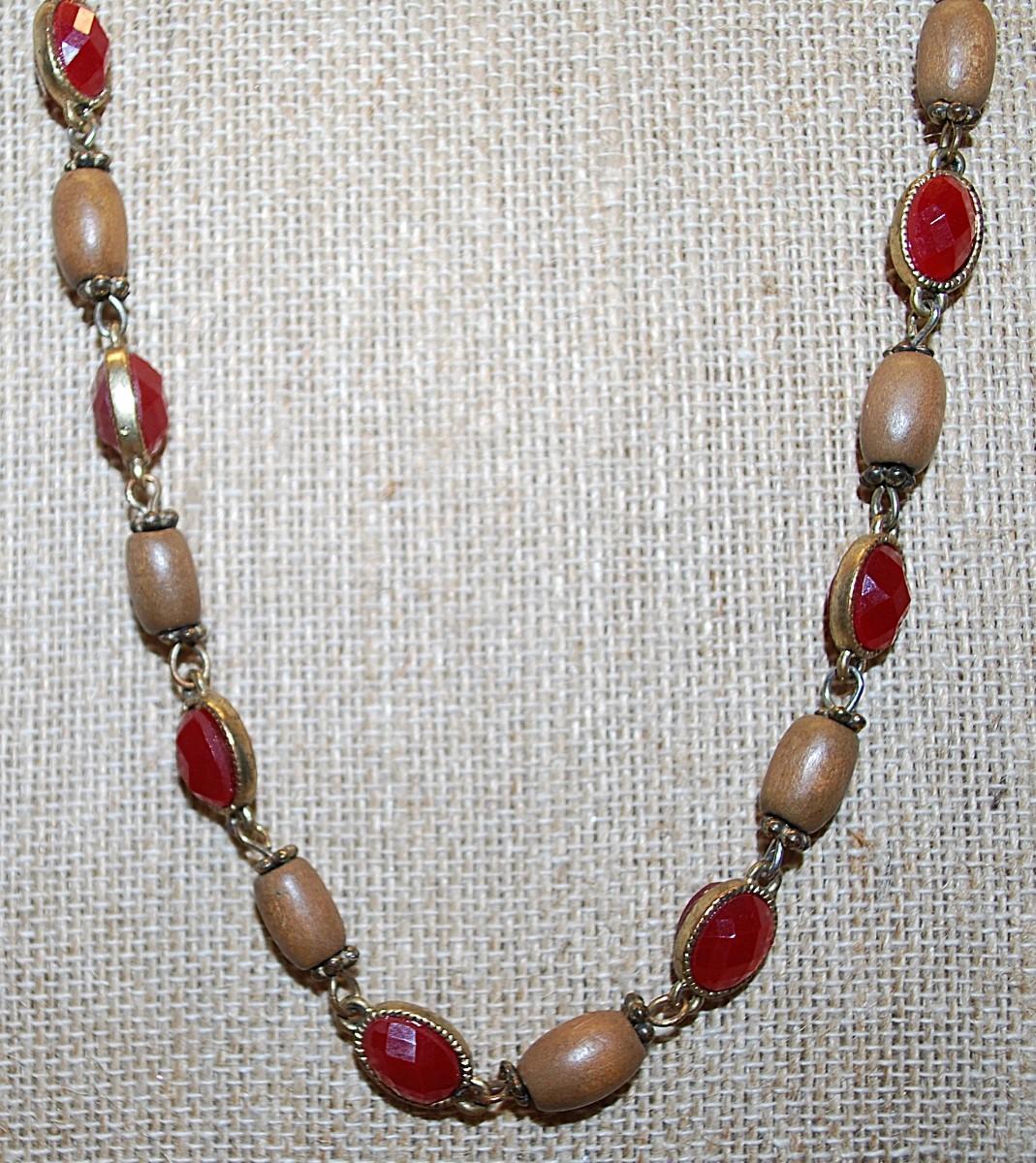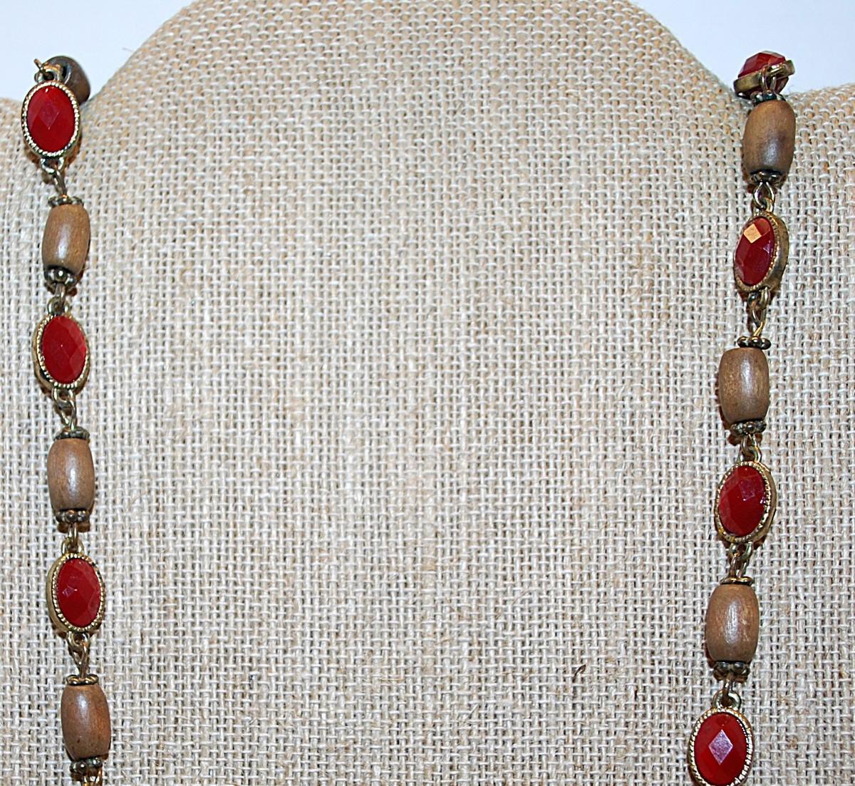 Oval Bright RED Beveled Beads Wrap-Around NECKLACE Intertwined with Wooden Beads and a Lobster Clasp 30" L