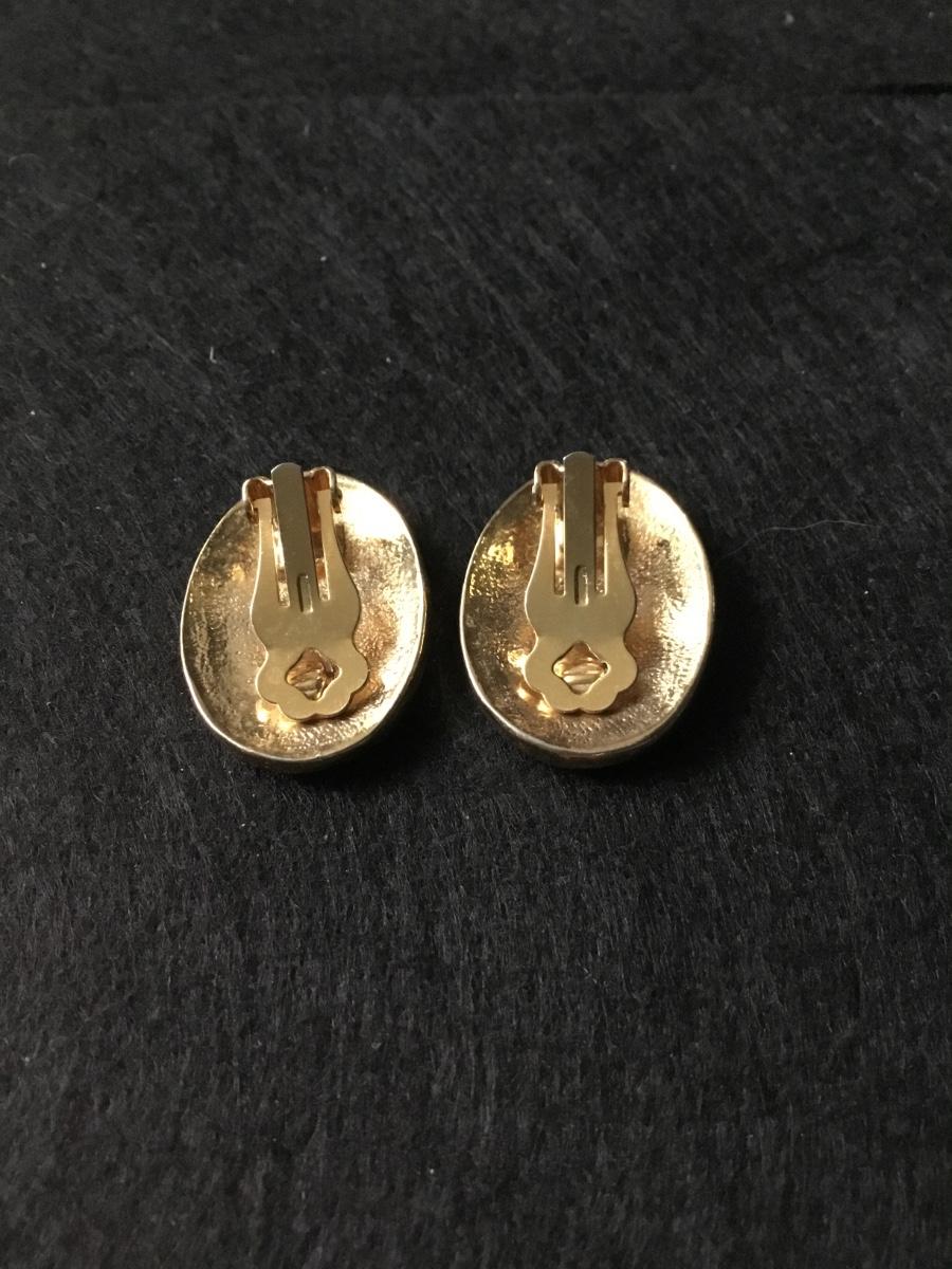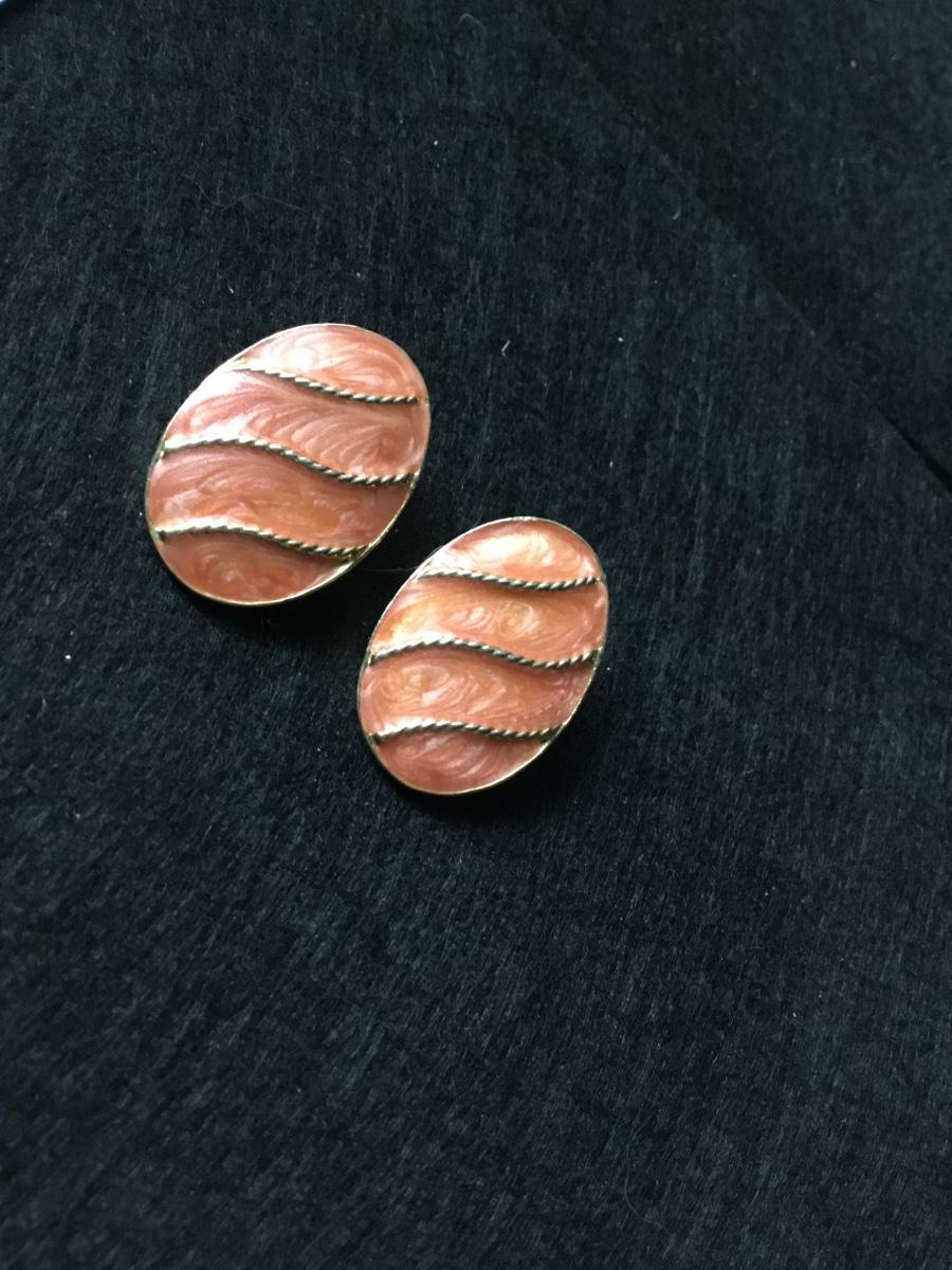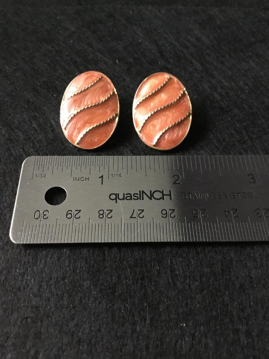 Oval clip on earrings with a coral colored enamel gold tone rope design