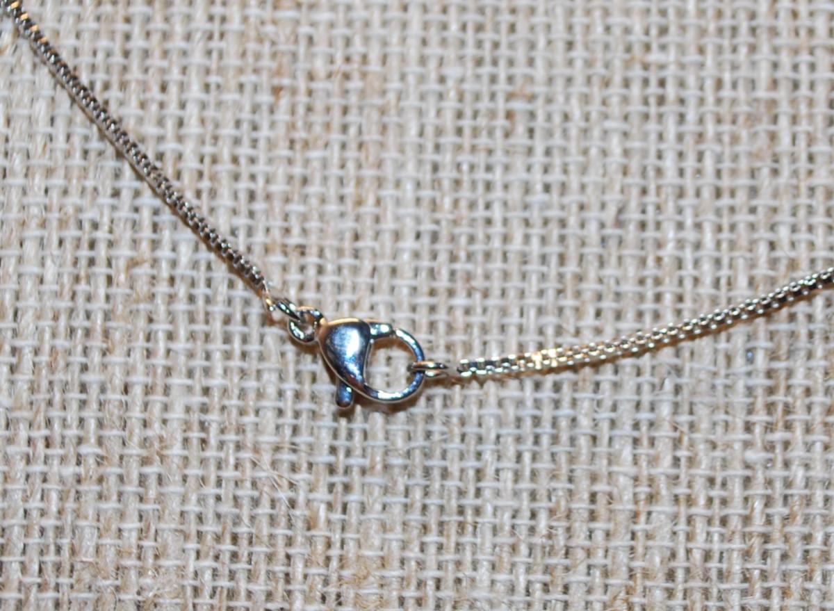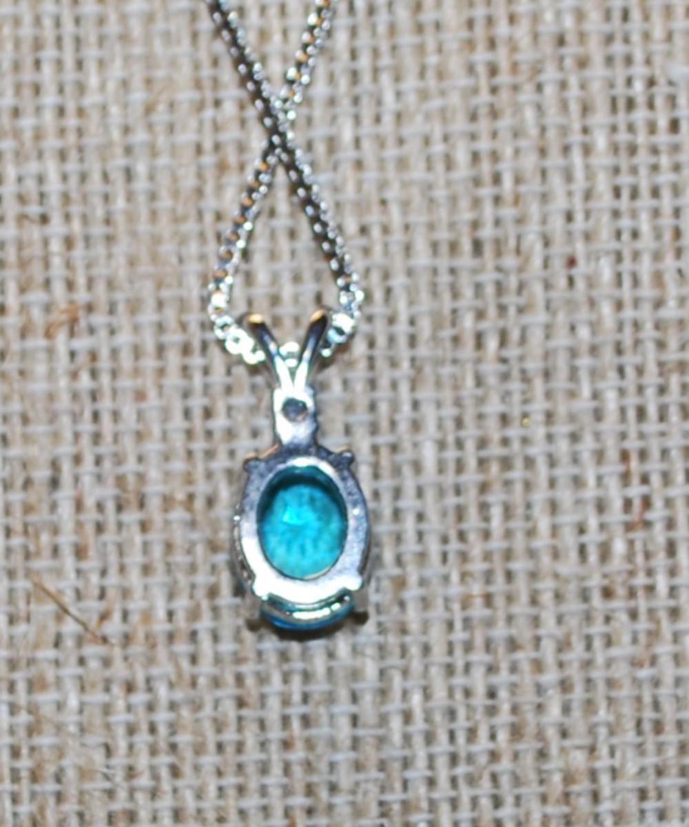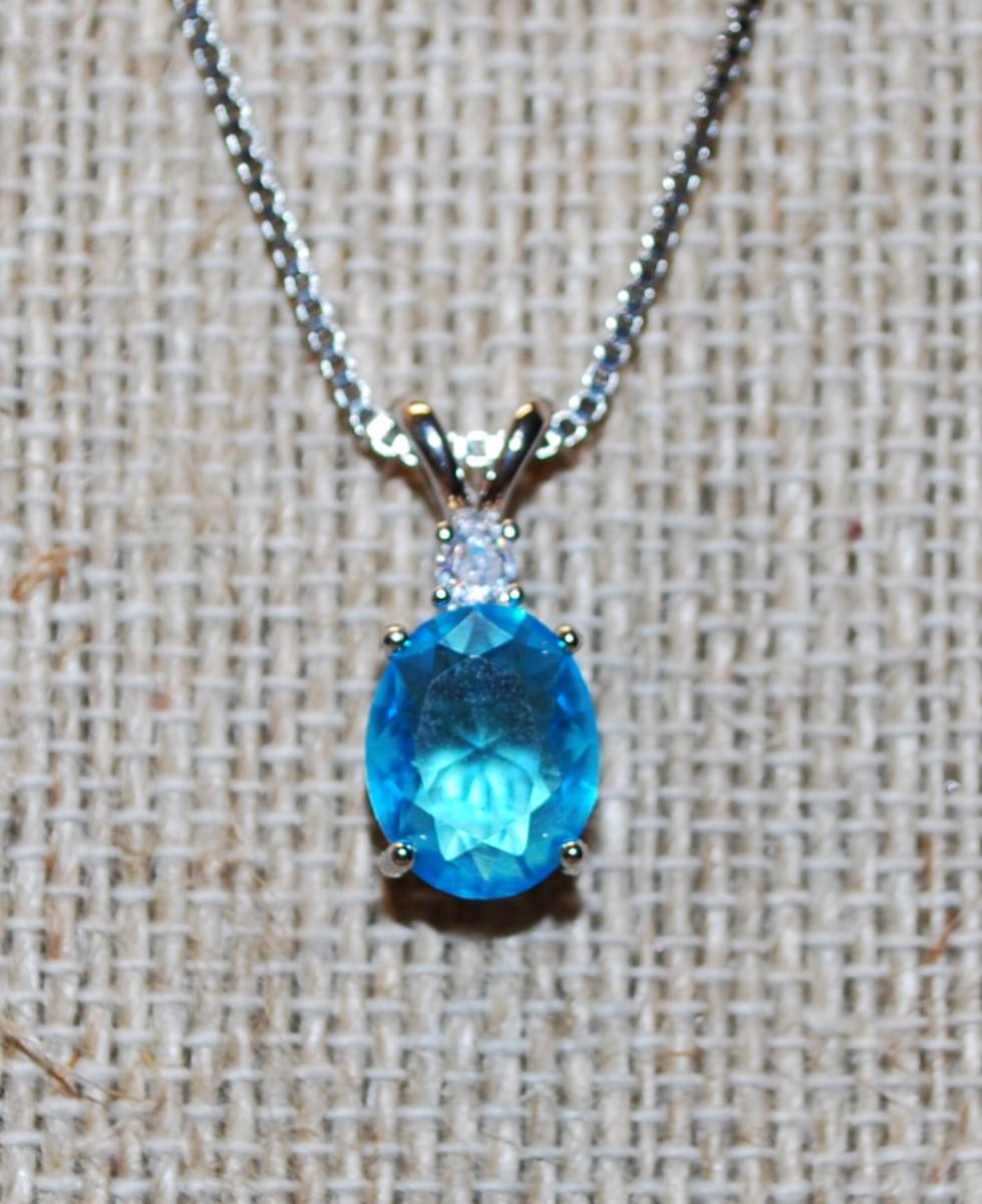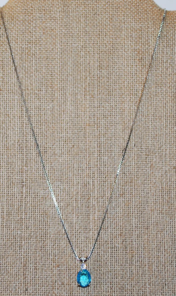 Oval Cut Sea Blue Stone with a Clear Stone on Top PENDANT (½" x ¼") and Double Hooks on a Silver Tone Necklace Chain 17" L