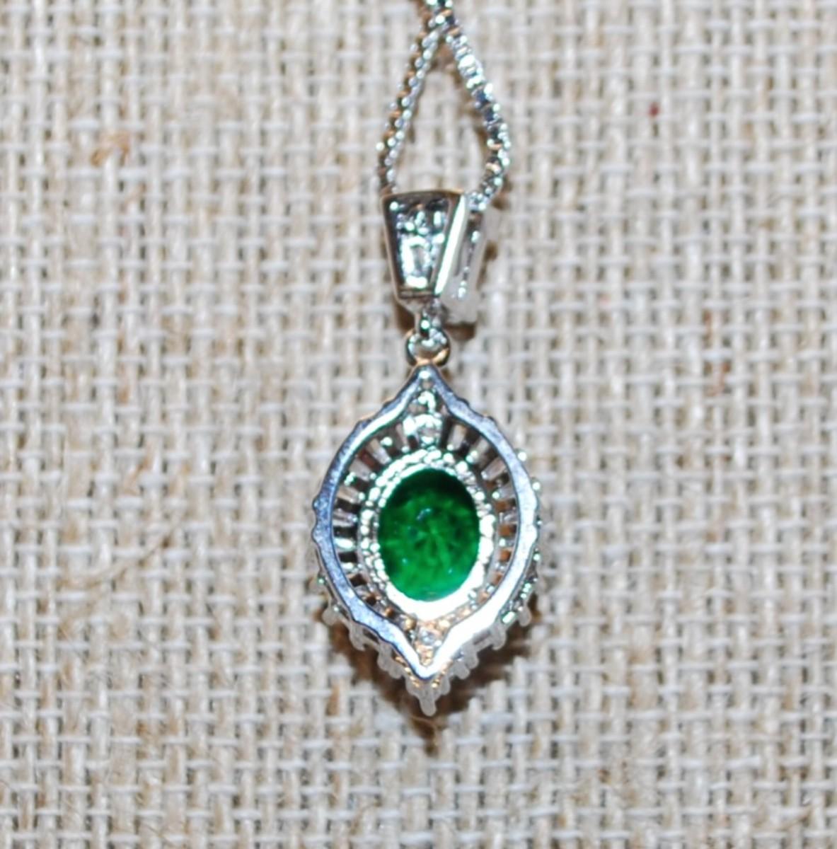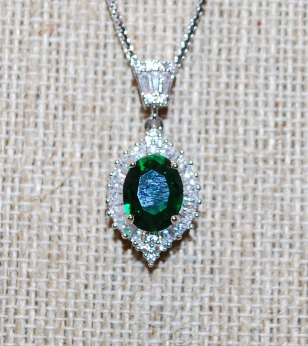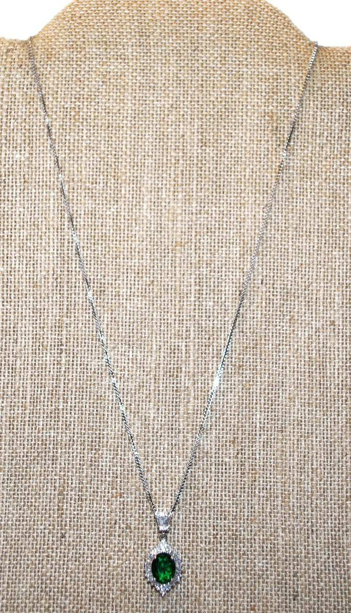 Oval Deep Green Stone PENDANT (1" x ¾") with Full Surrounds on a Silver Tone Necklace Chain 18" L