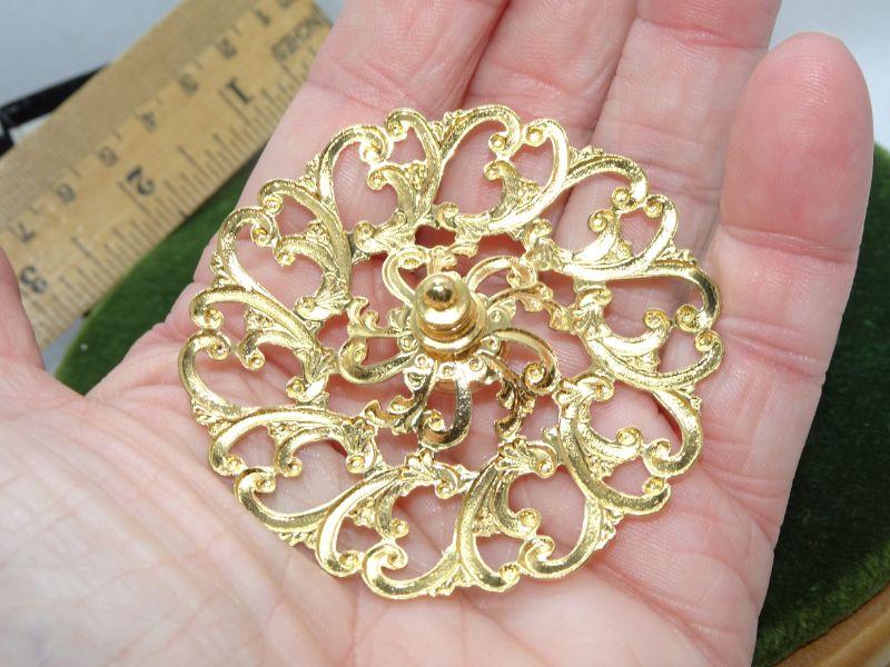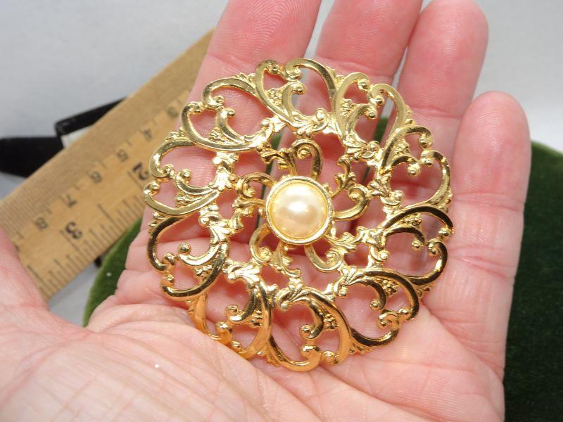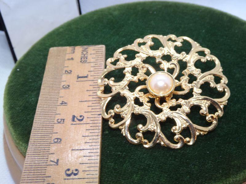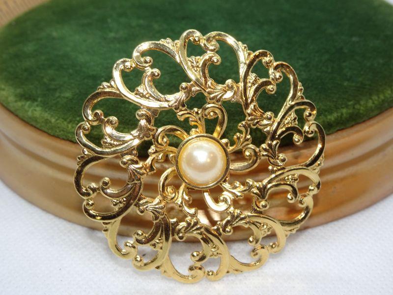 Oval Filigree Gold Tone Center Pearl Pin