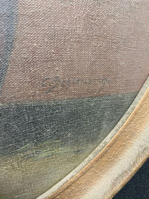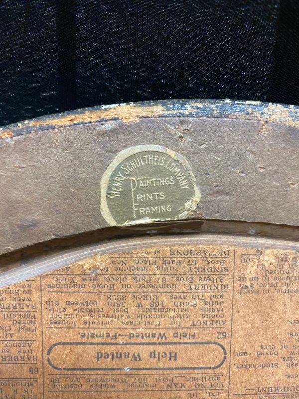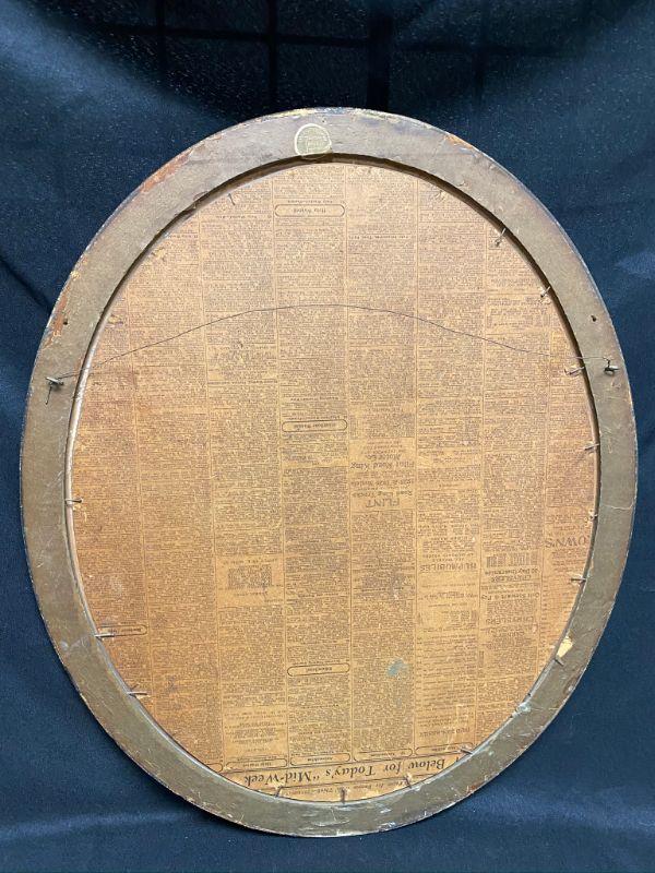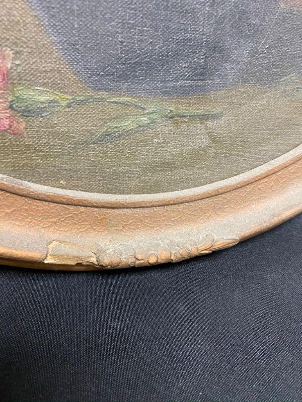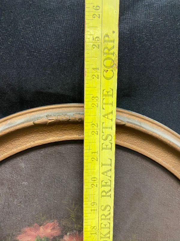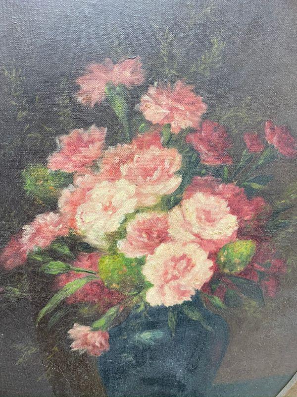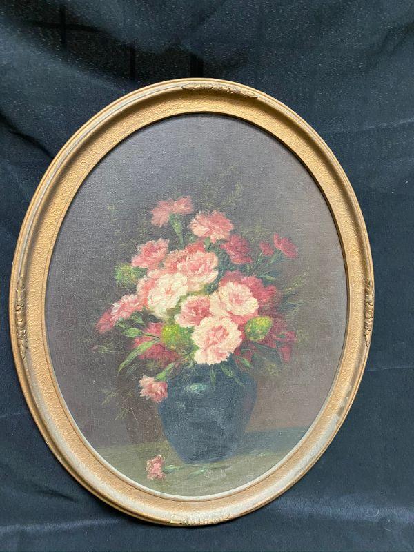 Pink carnations in a vase art. Oval wood frame has a simple floral design along the edges. 23" in height. It is dusty from storage.