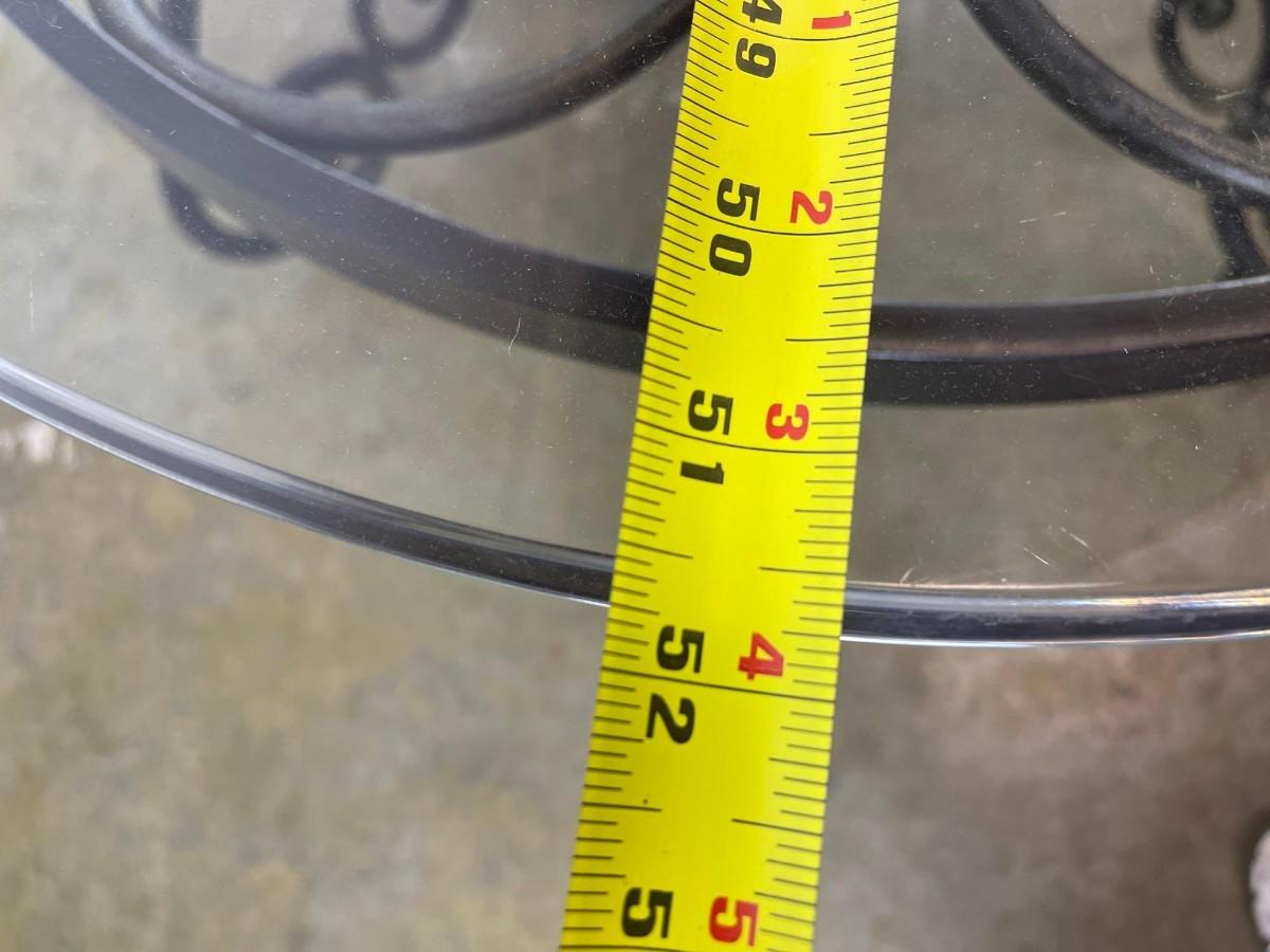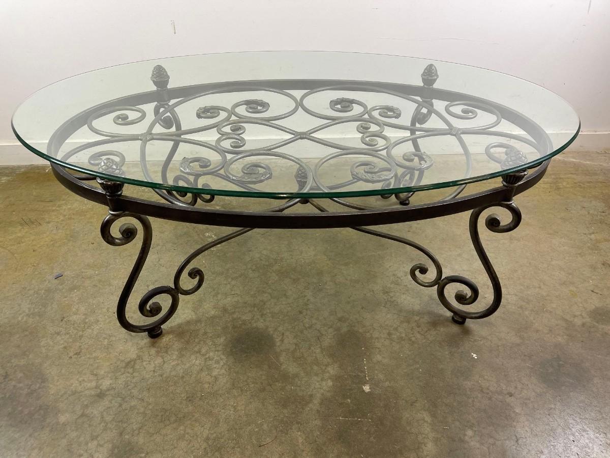 Oval Glass Top Coffee Table with Scrolling Metal Base. Very good condition. Minor scratches to surface glass but no chips or cracks.