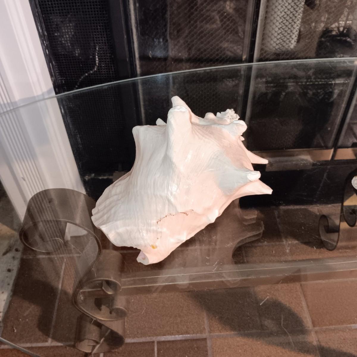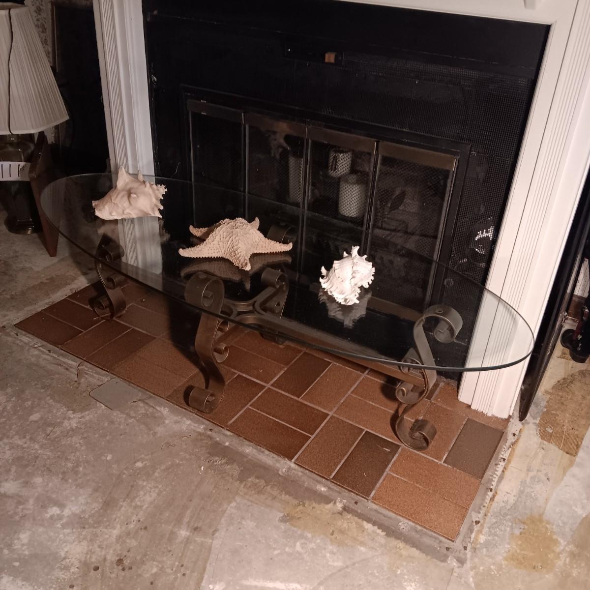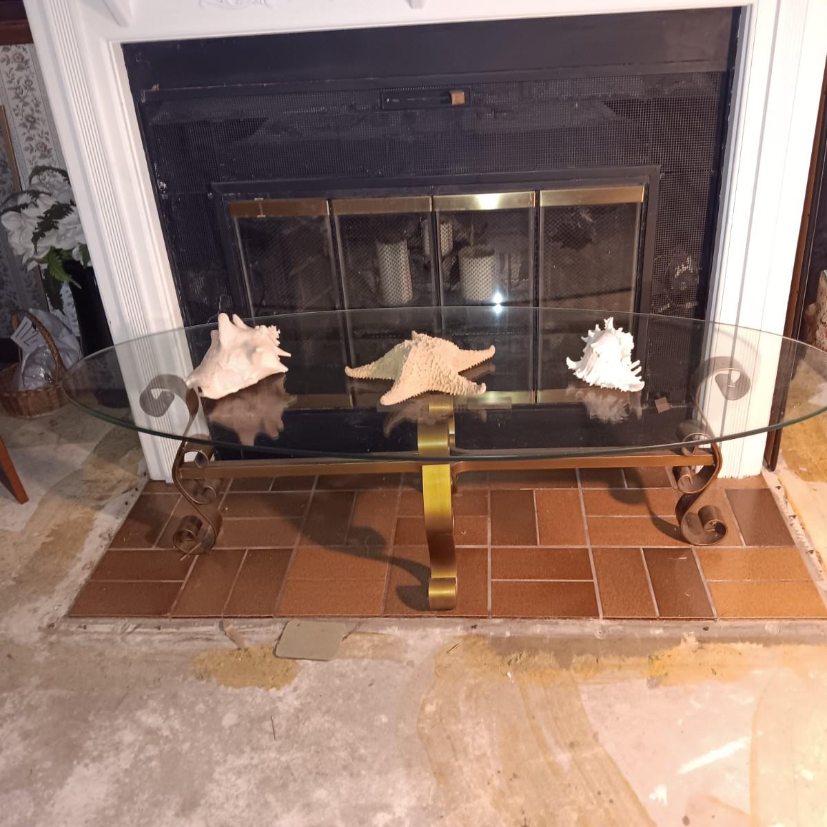 OVAL GLASS TOP COFFEE TABLE WITH IRON BASE PLUS 3 LARGE SEA SHELLS