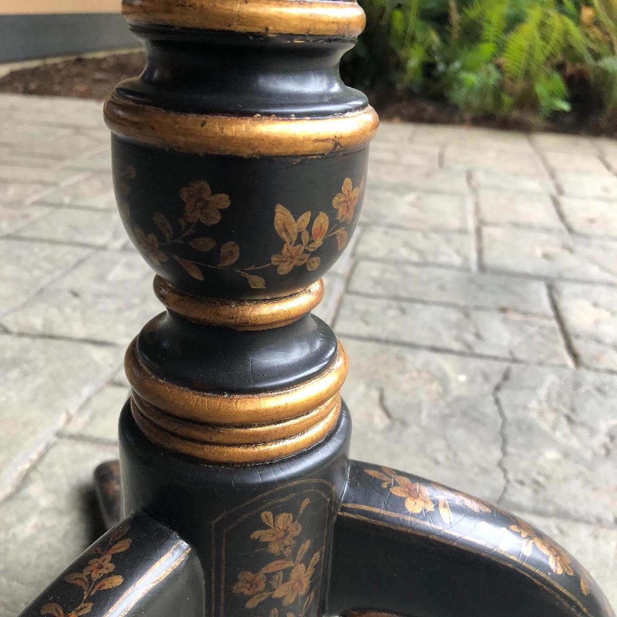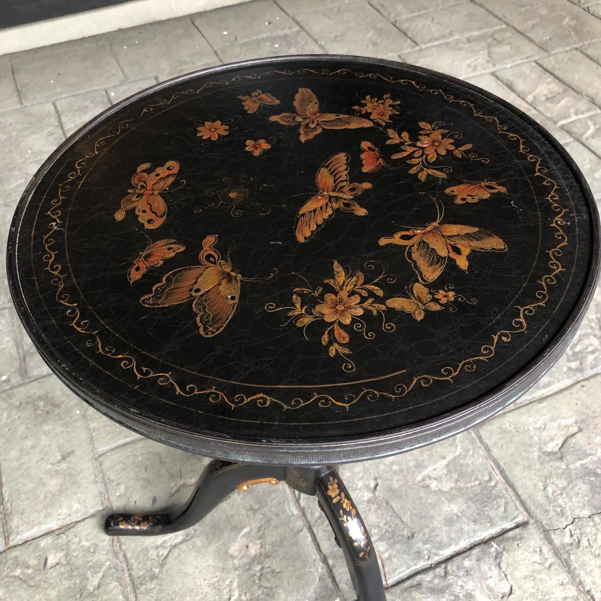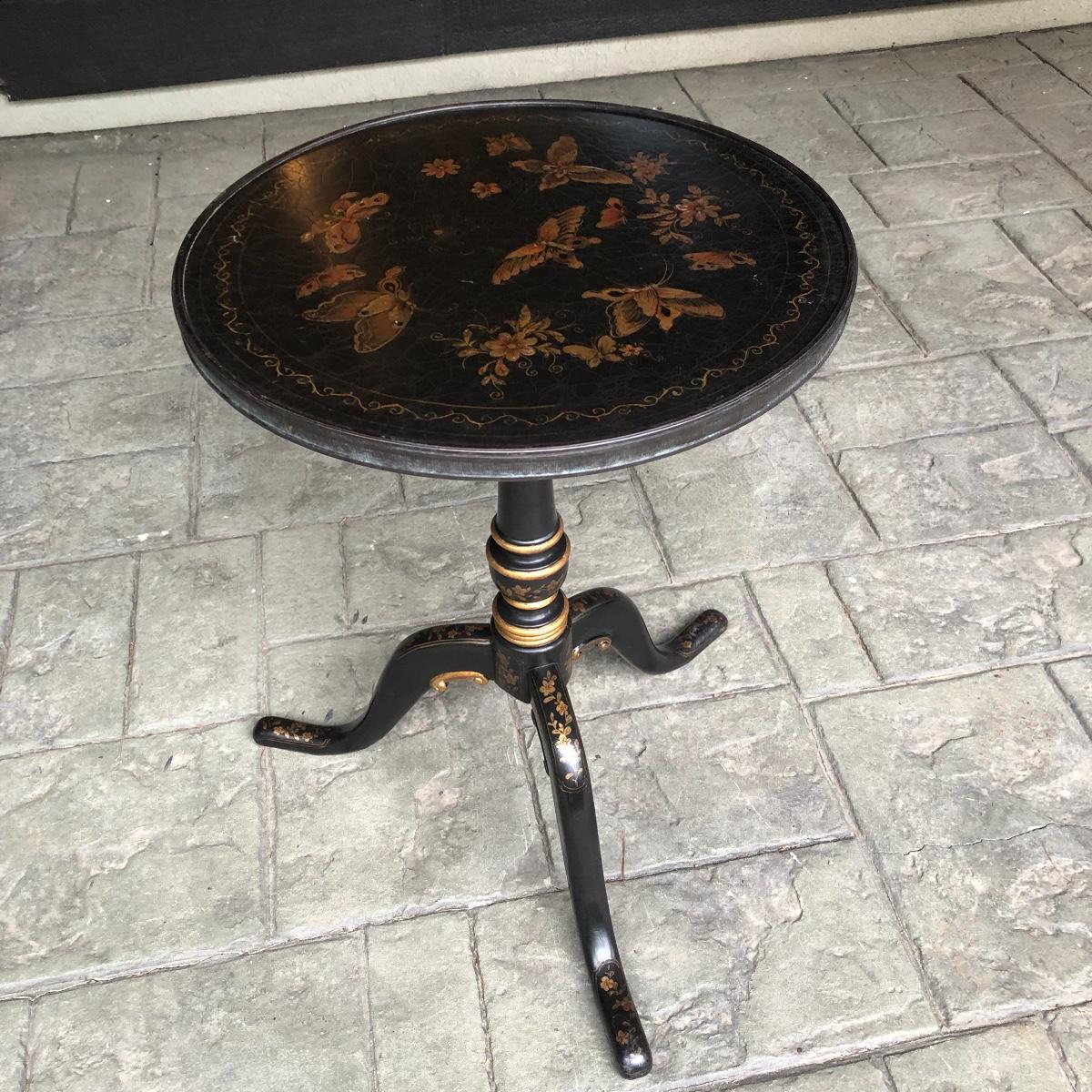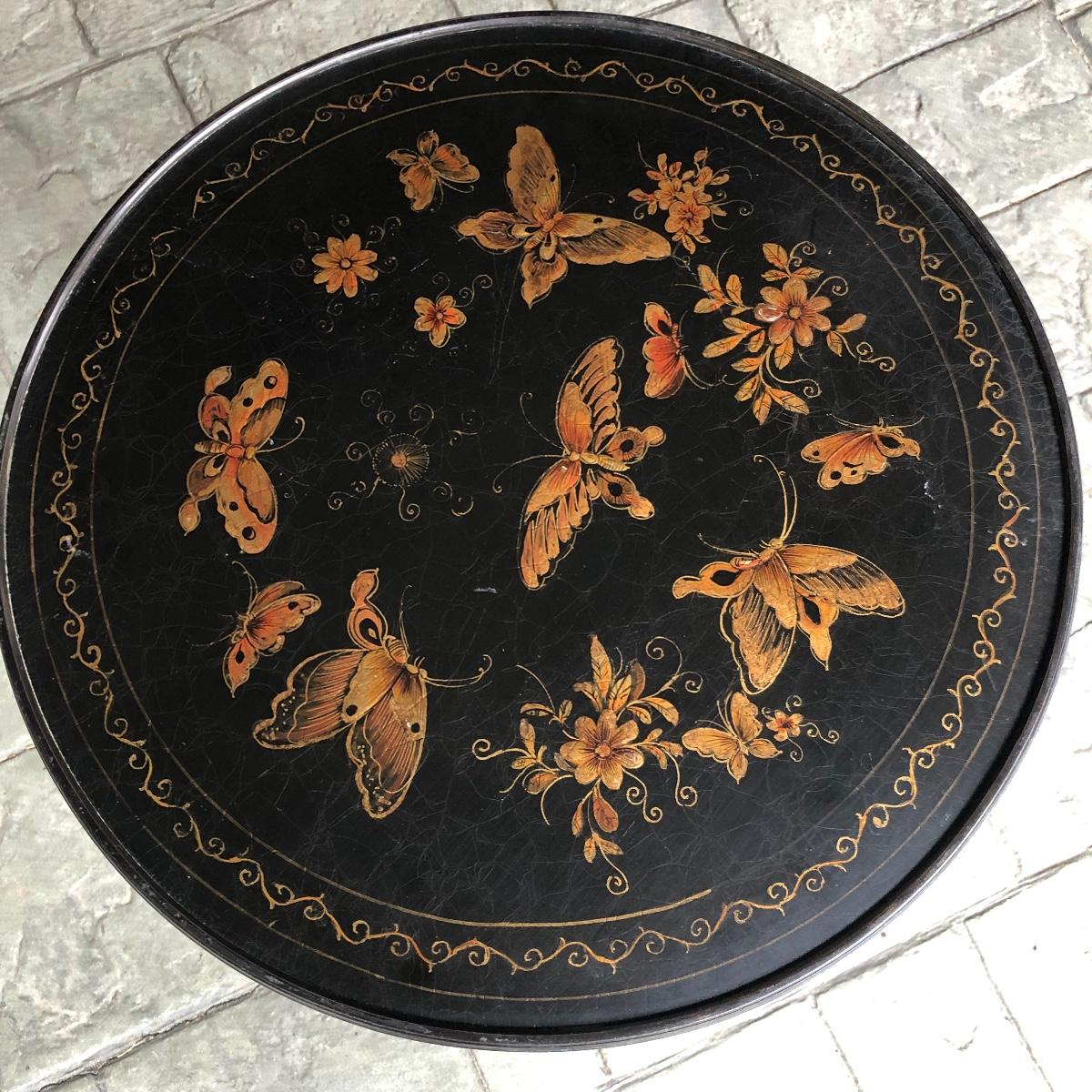 Wooden table with gold painted highlights and butterfly inlay top. The table top is 18” in diameter and is 26” tall. Local pick up only.