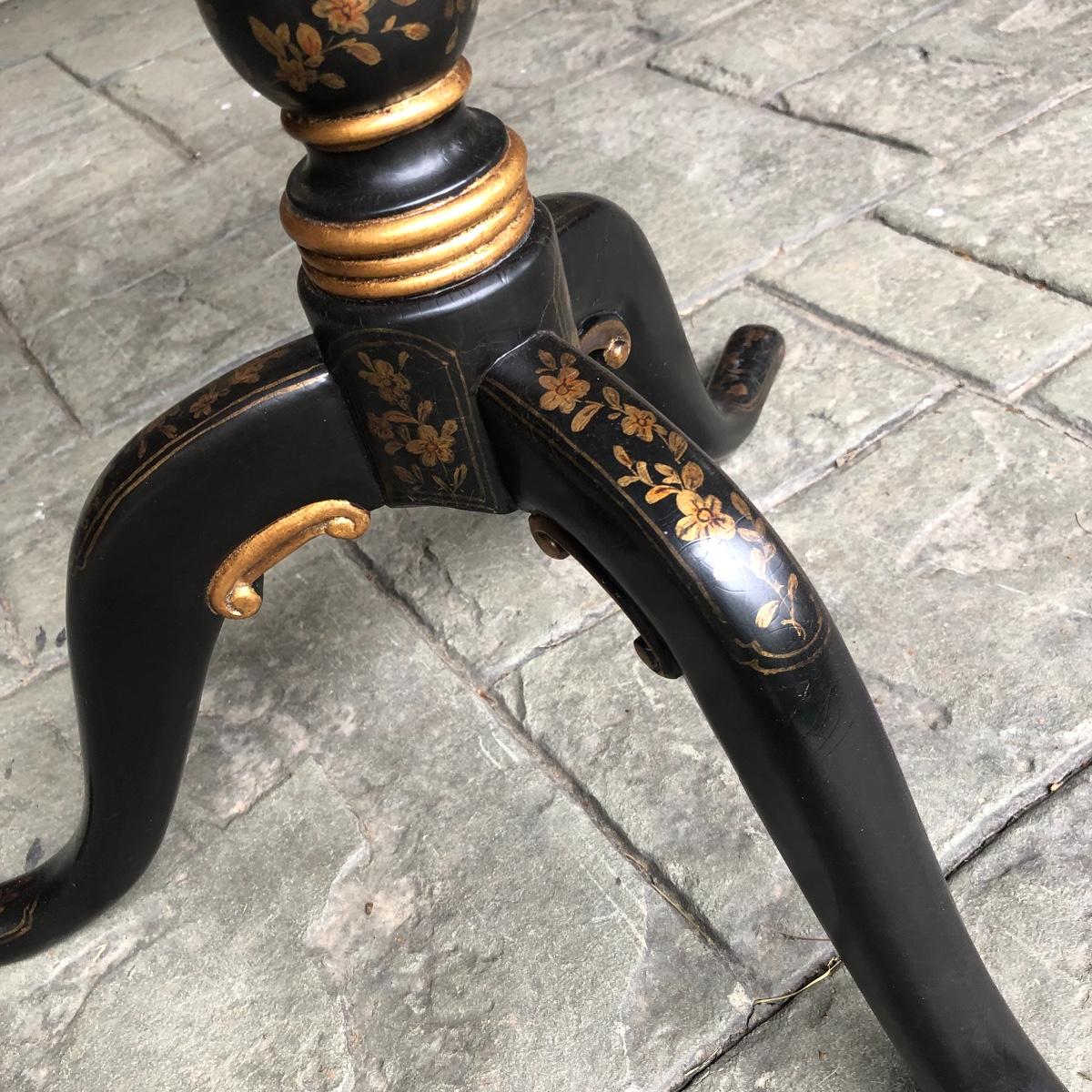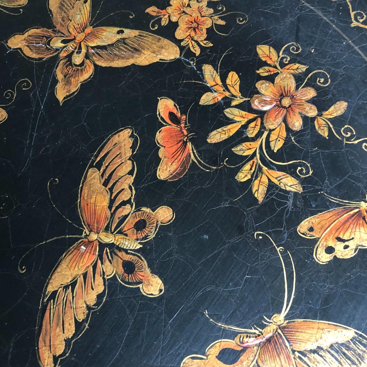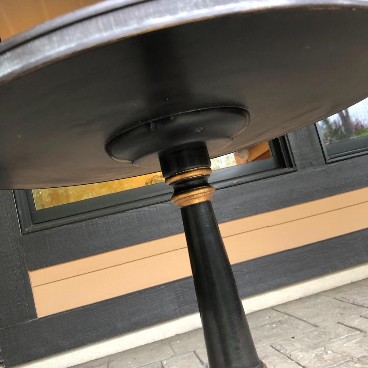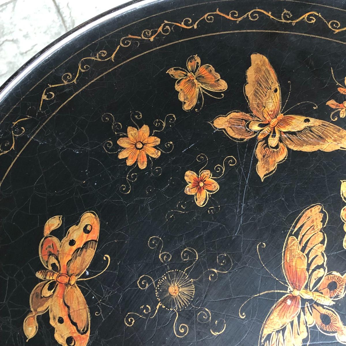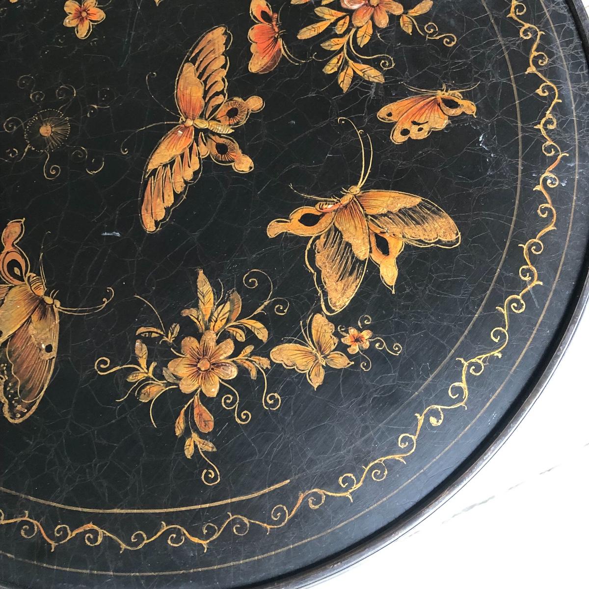 Wooden table with gold painted highlights and butterfly inlay top. The table top is 18” in diameter and is 26” tall. Local pick up only.