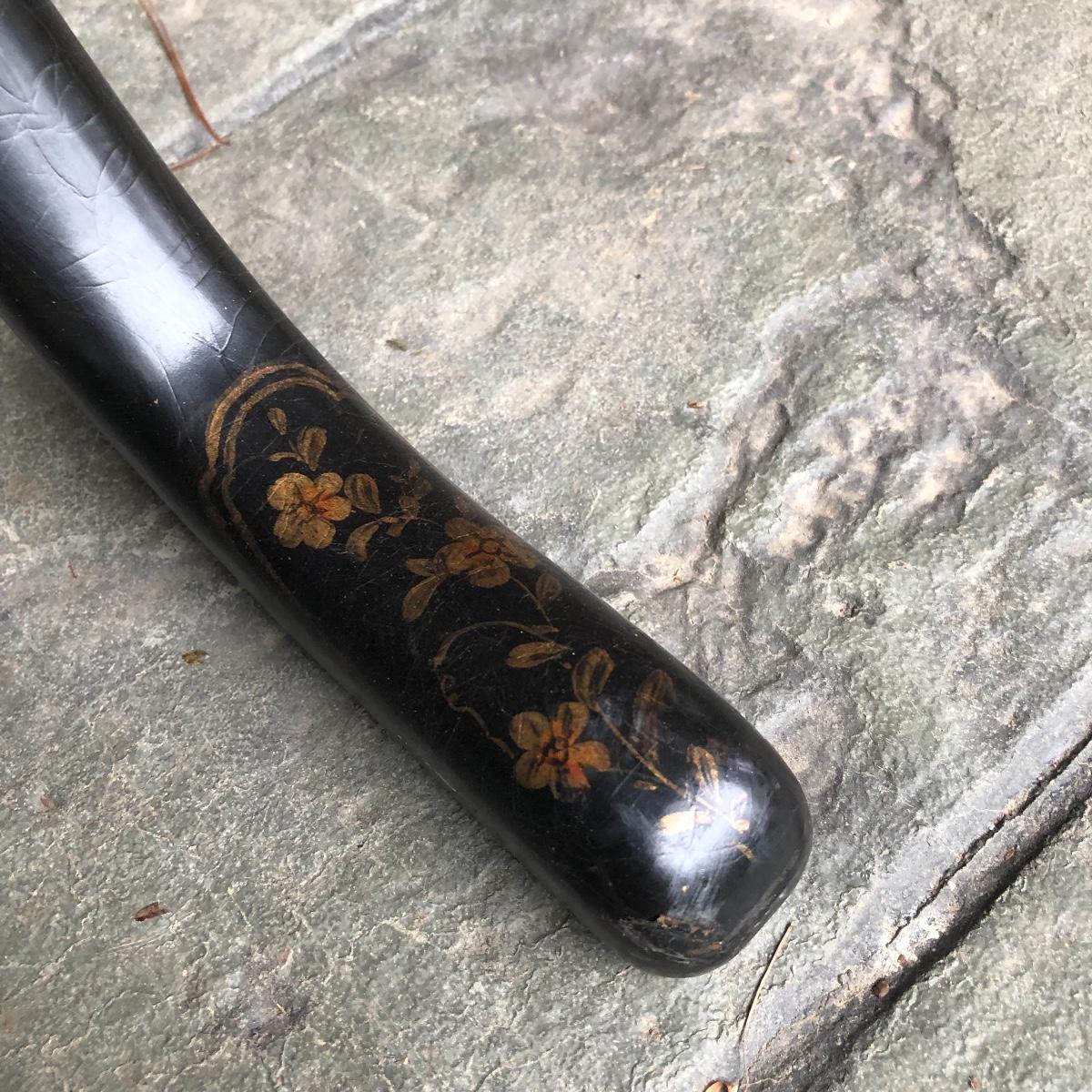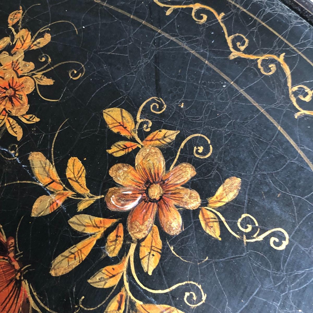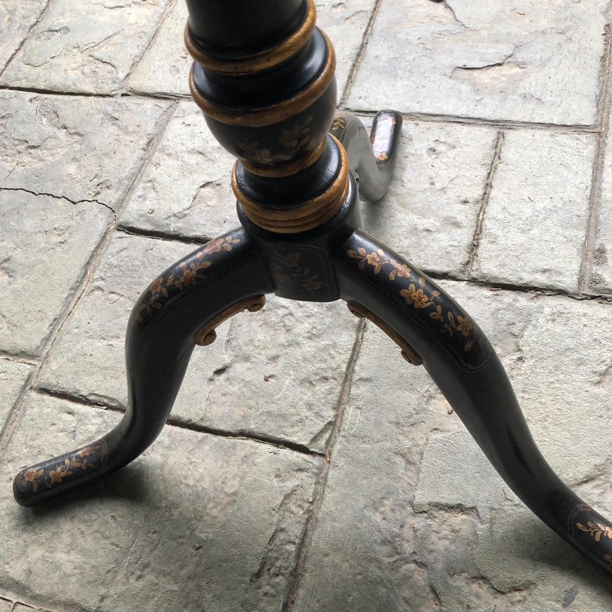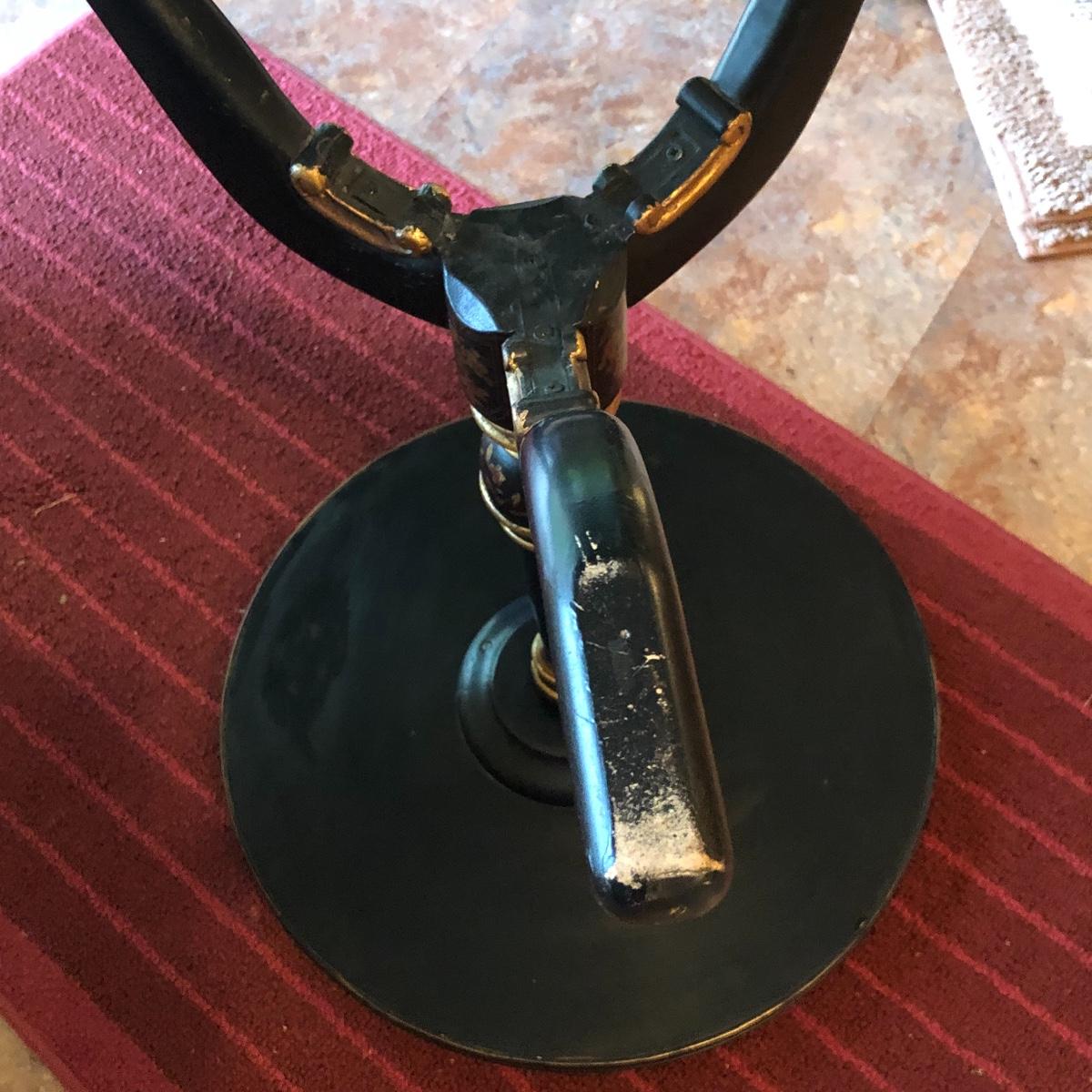 Wooden table with gold painted highlights and butterfly inlay top. The table top is 18” in diameter and is 26” tall. Local pick up only.
