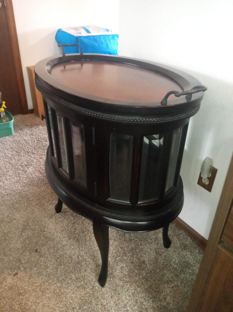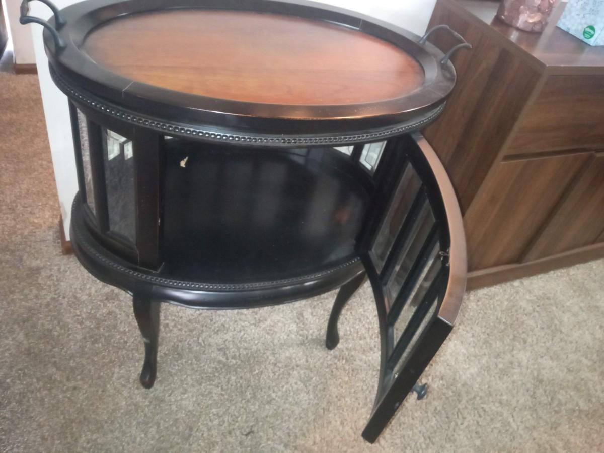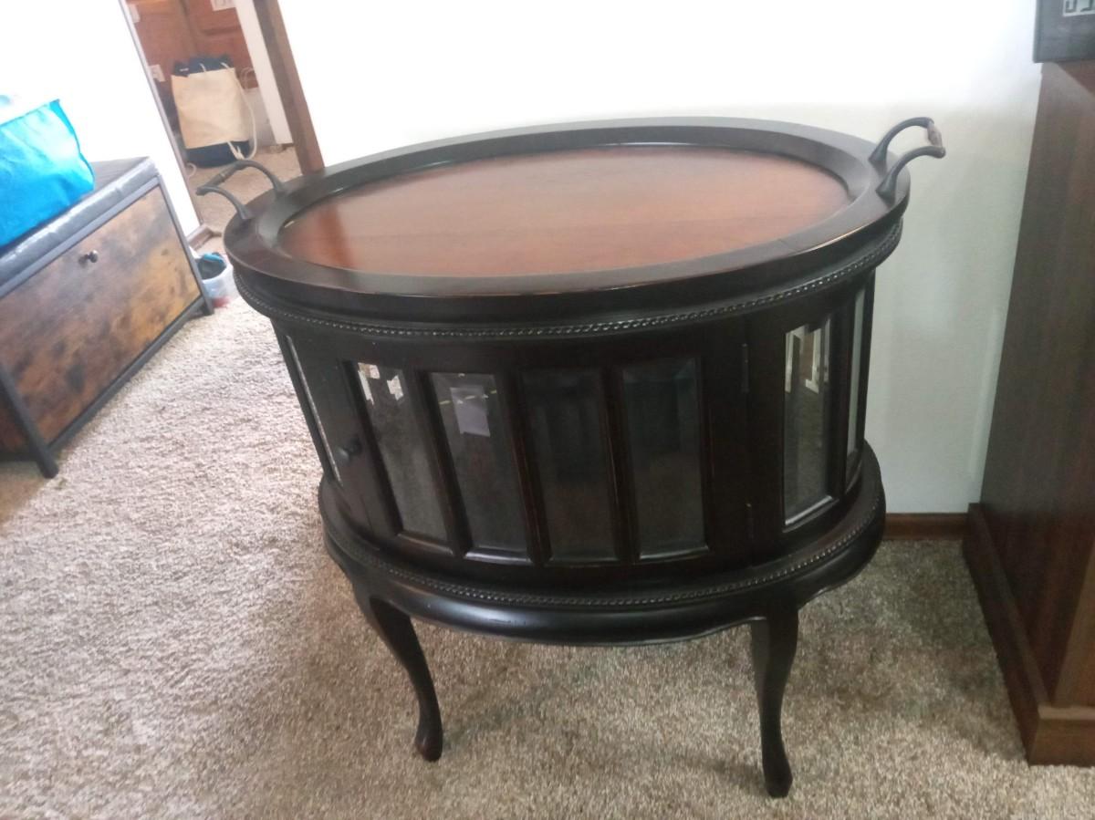 OVAL MAHOGANY BEVELED GLASS TEA TABLE OR CURIO DISPLAY OR LIQUOR CABINET WITH REMOVEABLE TRAY