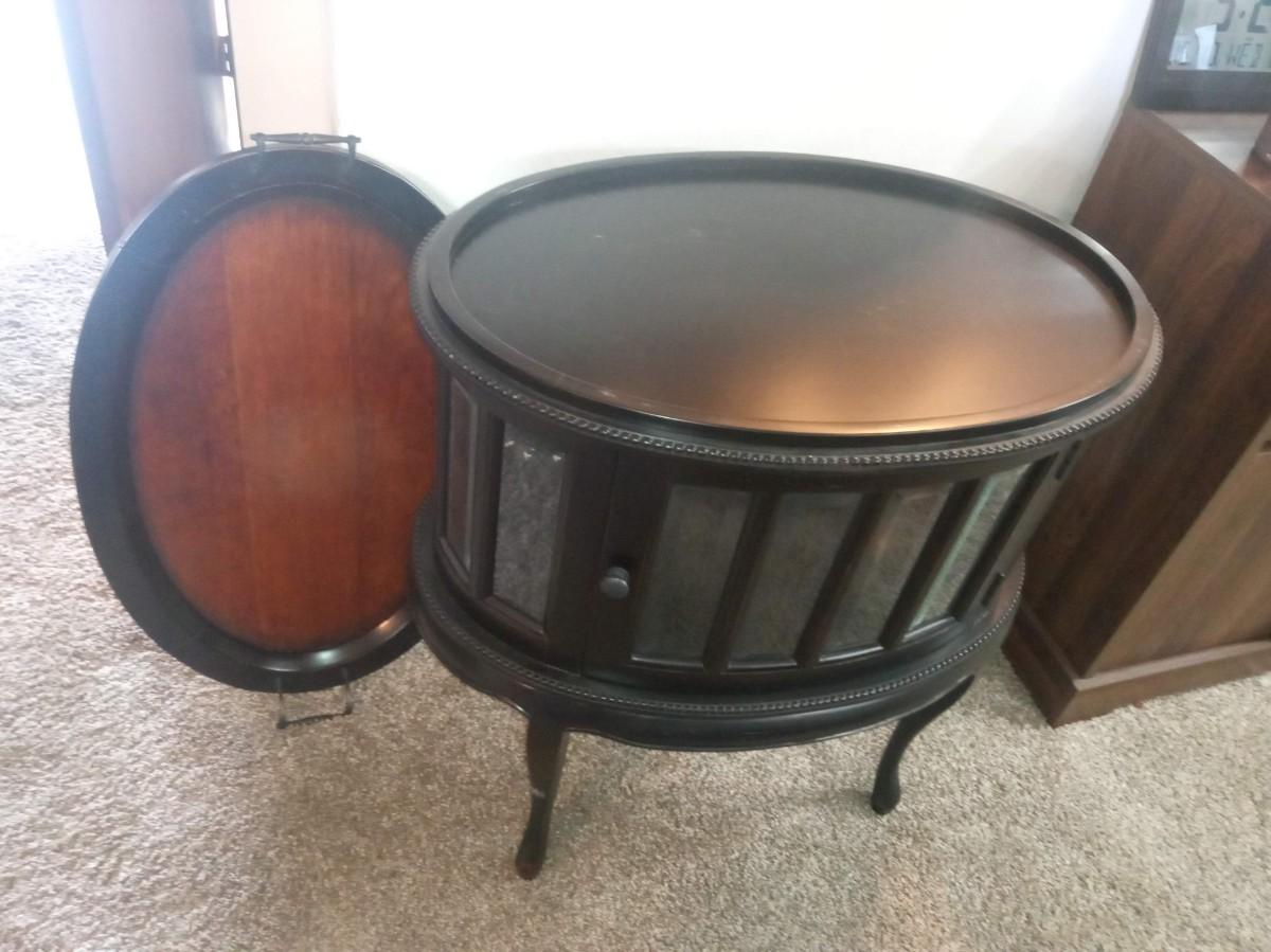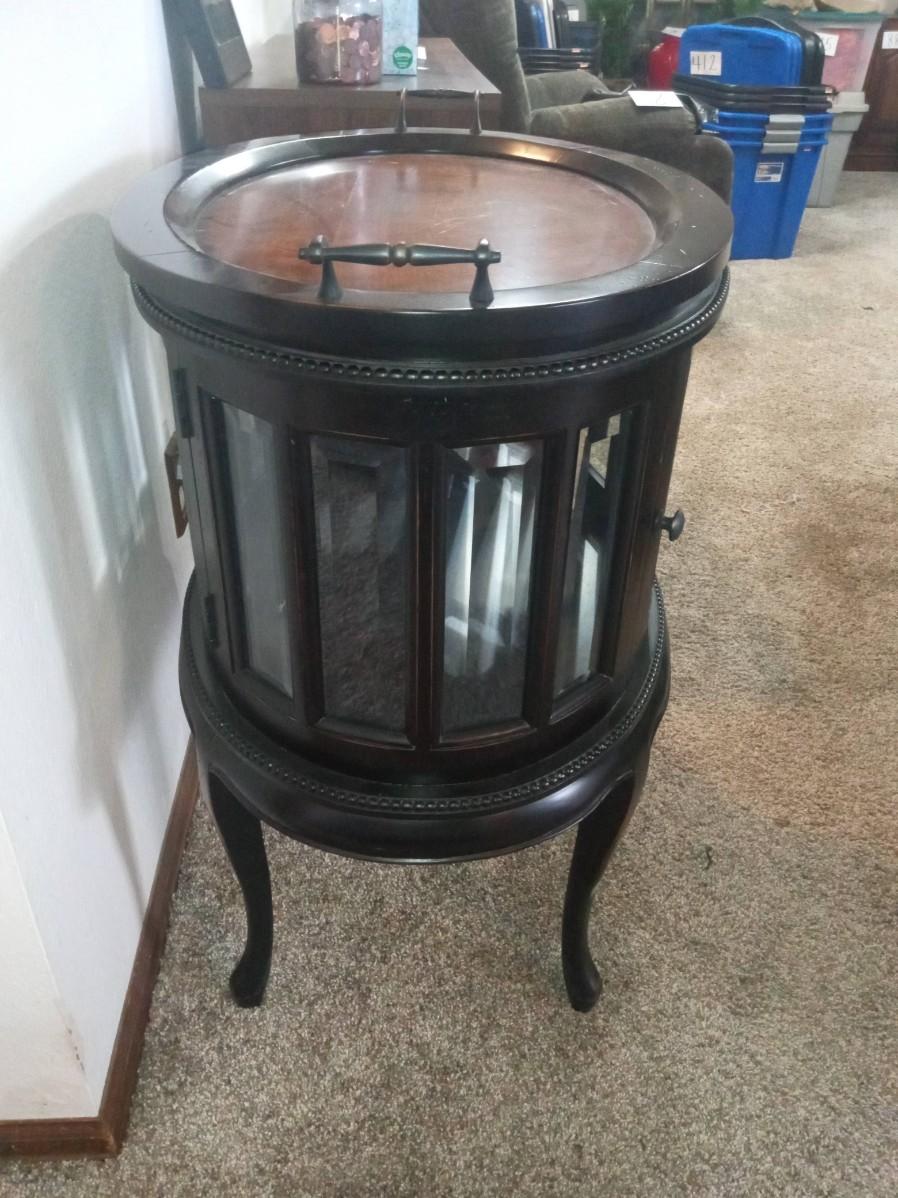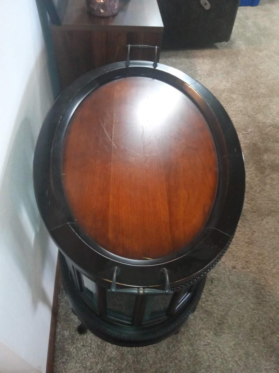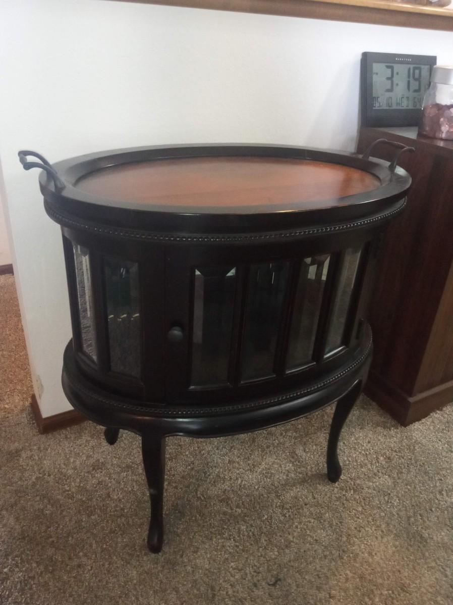OVAL MAHOGANY BEVELED GLASS TEA TABLE OR CURIO DISPLAY OR LIQUOR CABINET WITH REMOVEABLE TRAY