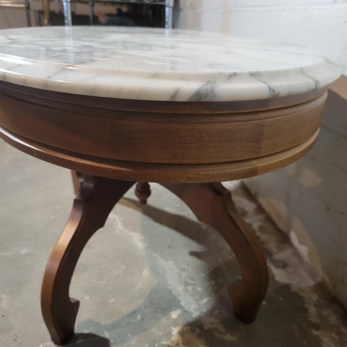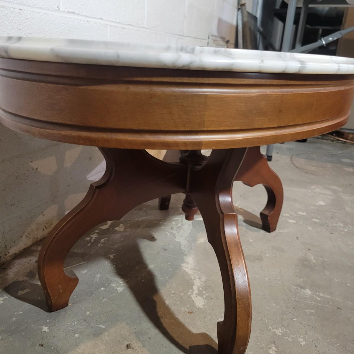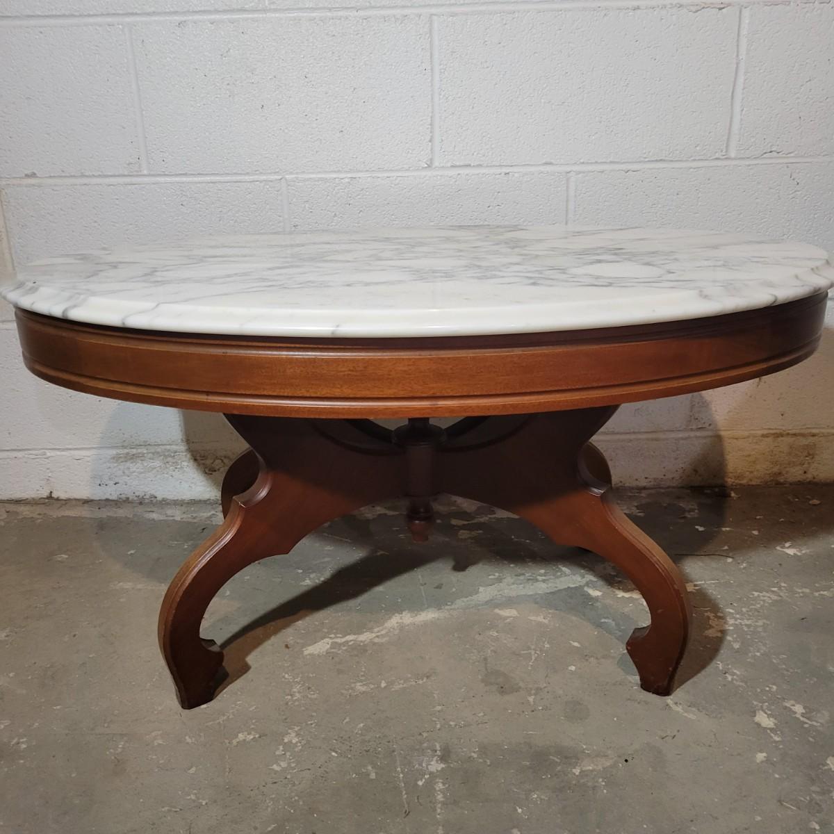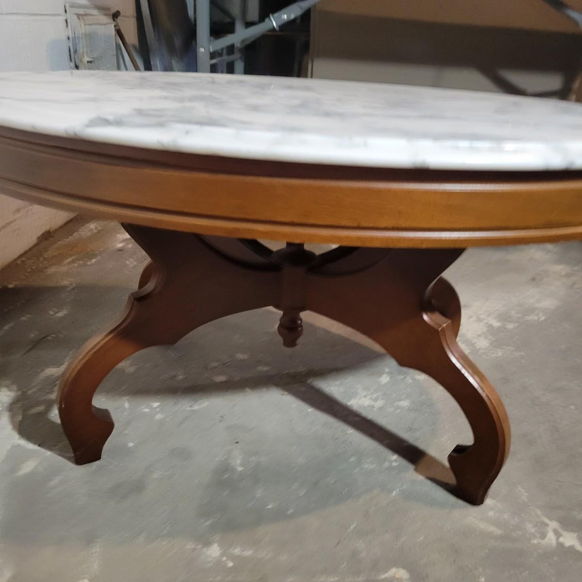An oval, wooden table with a white and grey marble top in good condition. There is a scratch on the top surface, see photos. The marble top is detached and has a beveled edge. Measures approximately 34" x 22" x 17.5". Local pickup only