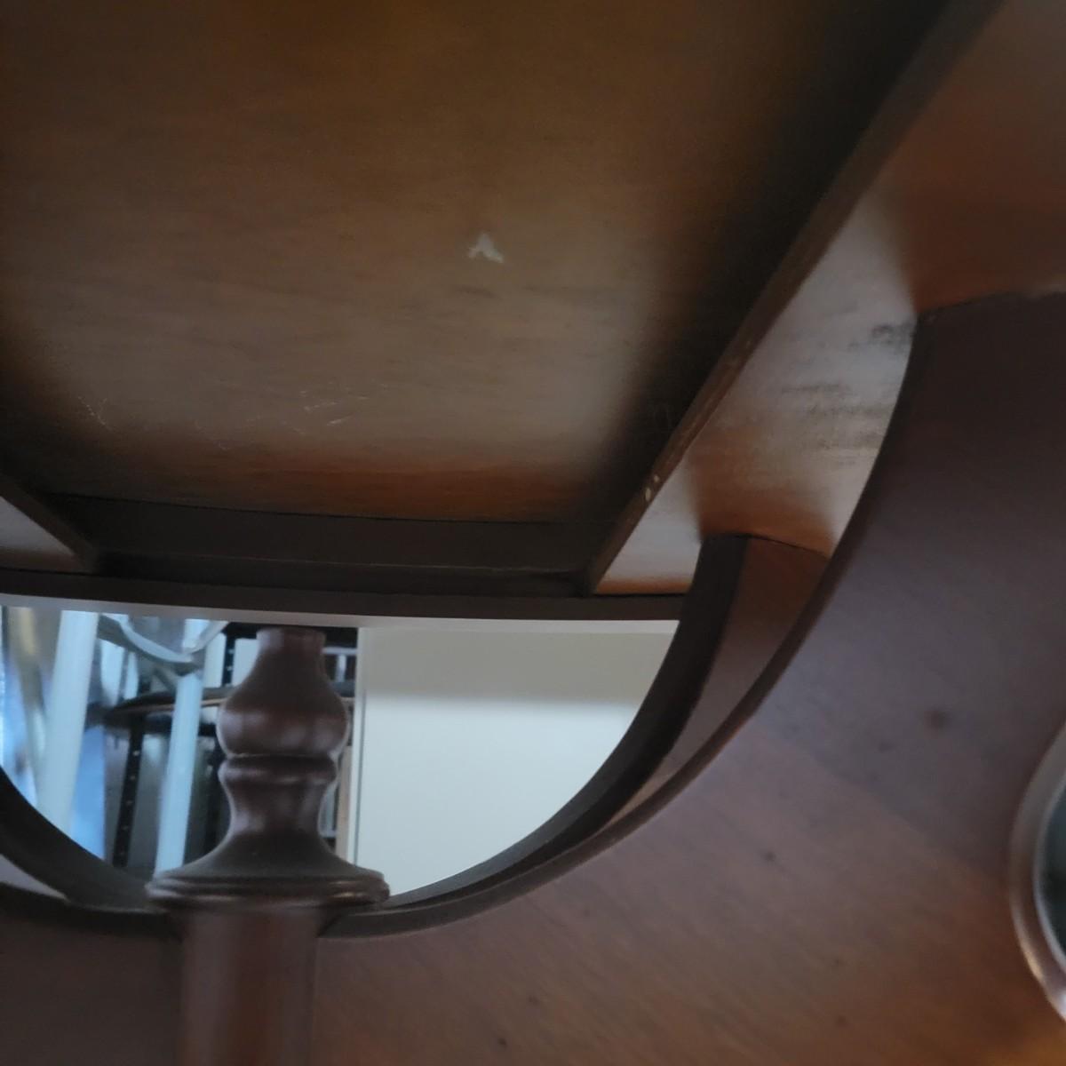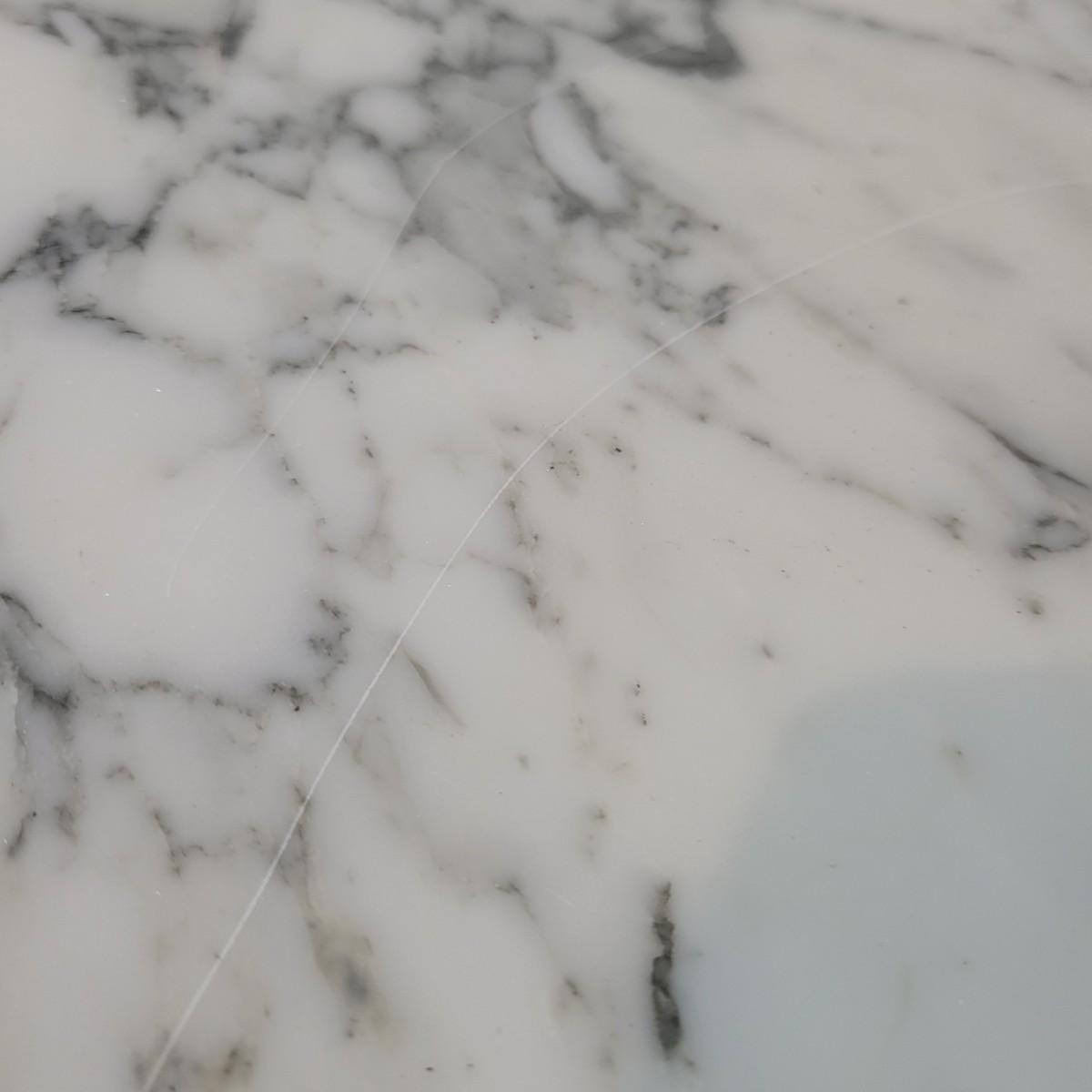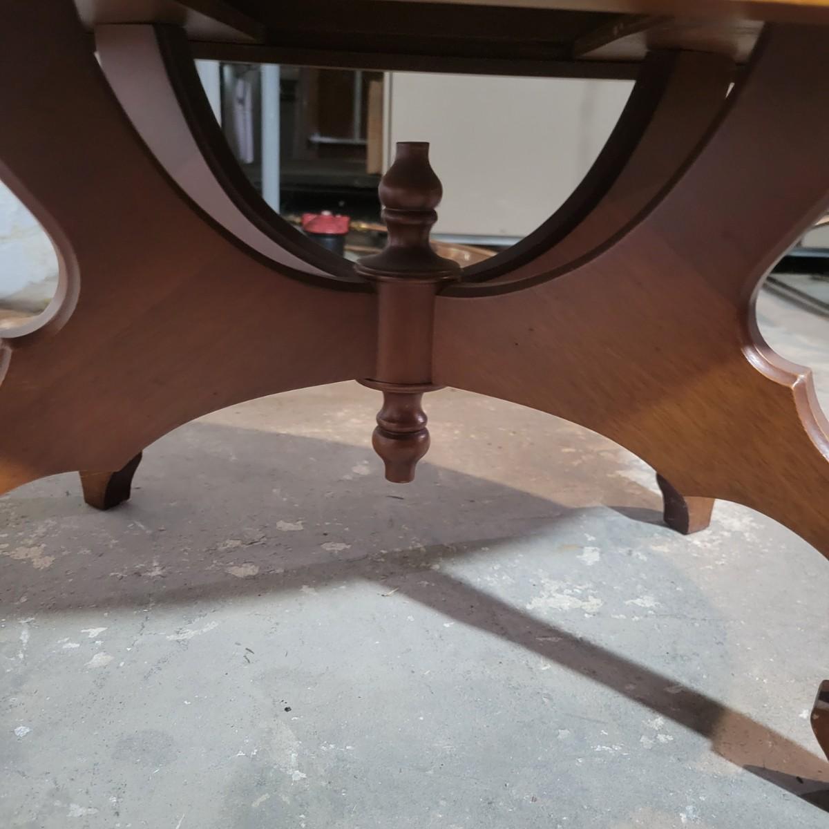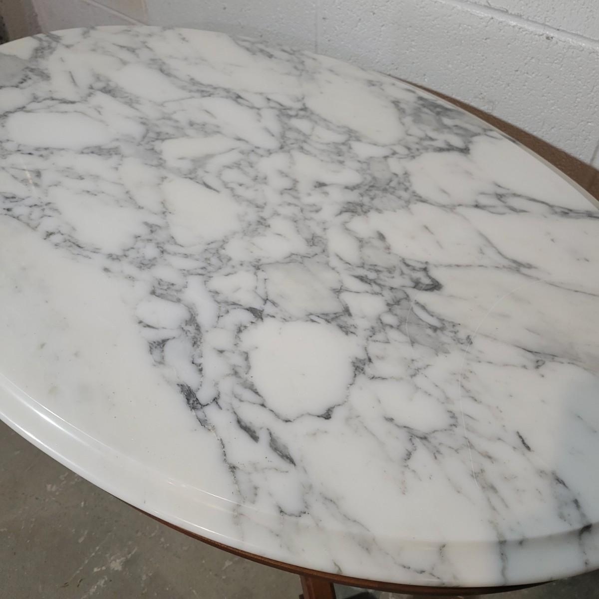 An oval, wooden table with a white and grey marble top in good condition. There is a scratch on the top surface, see photos. The marble top is detached and has a beveled edge. Measures approximately 34" x 22" x 17.5". Local pickup only