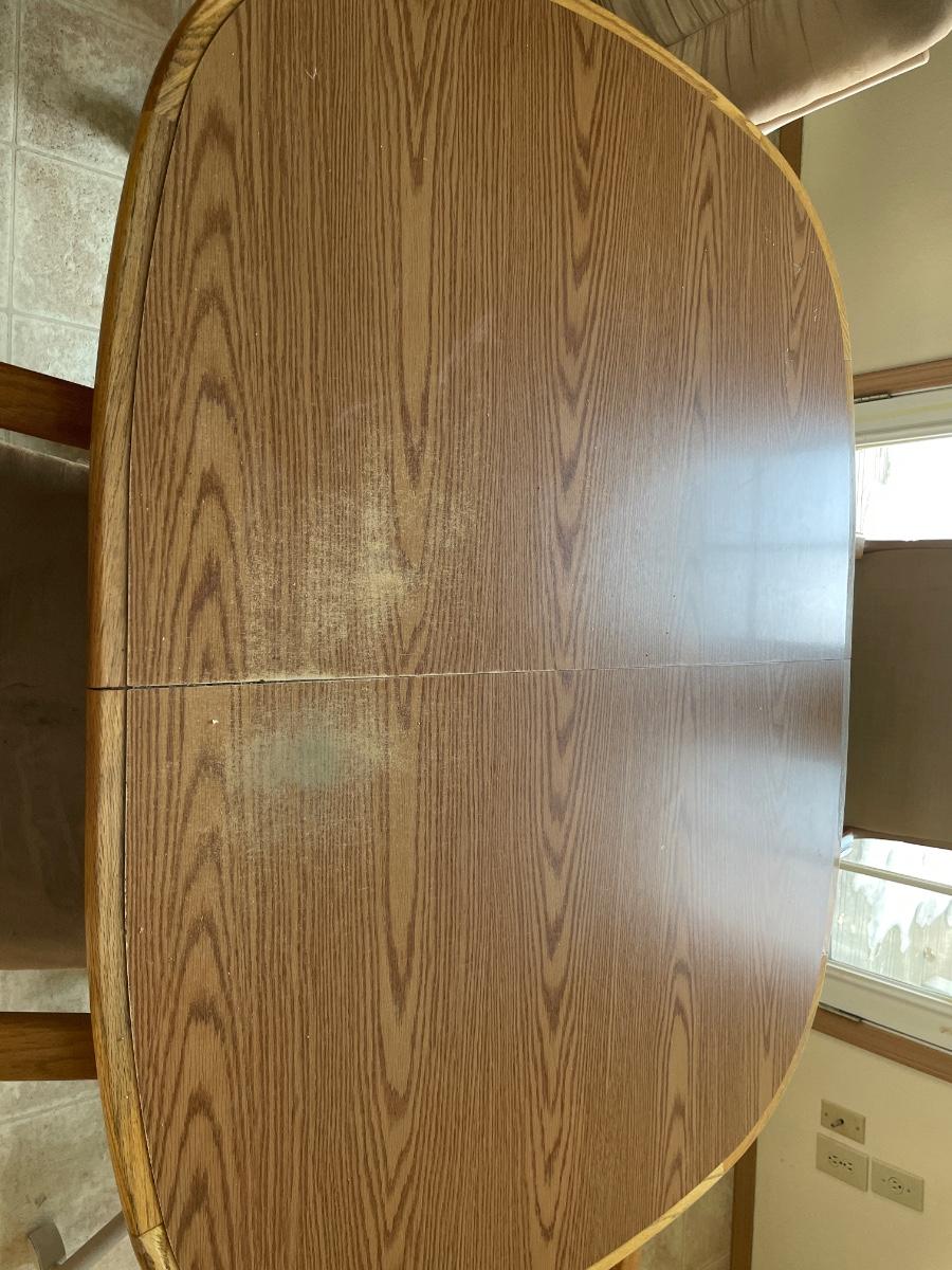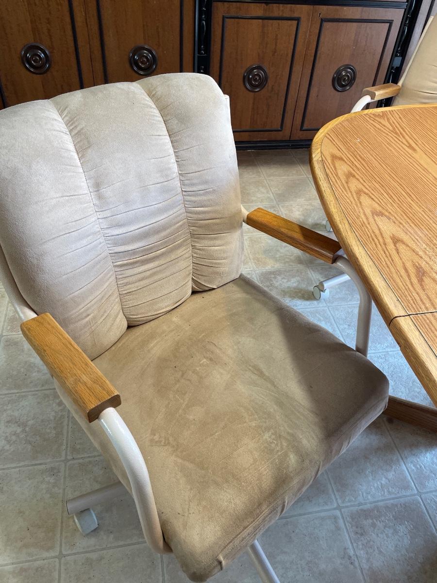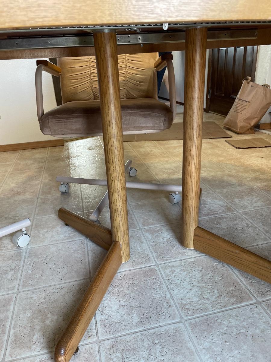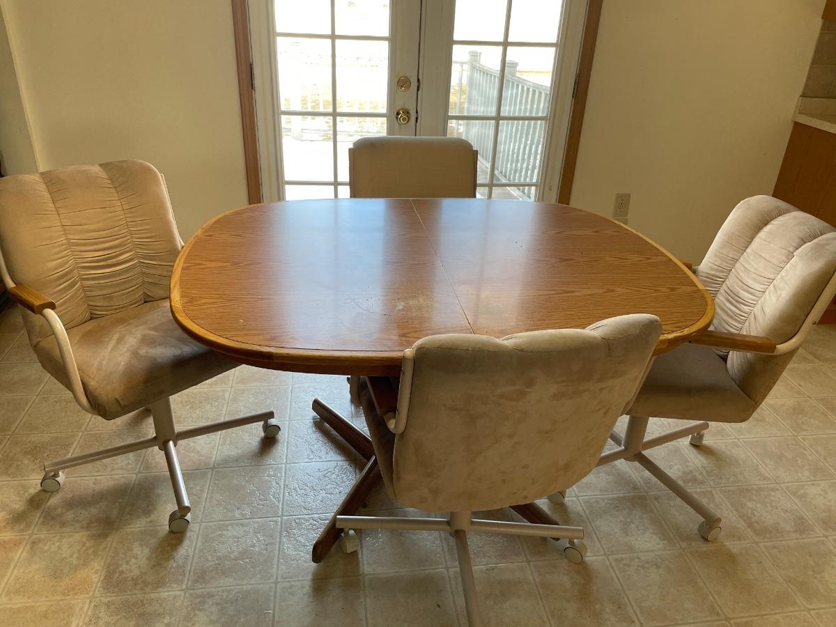 Oval oak dining room table with four rolling chairs