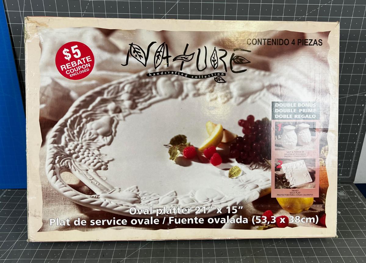 NEW in the Box 15 x 21" Oval Shape, Includes S alt & Pepper and a Trivet