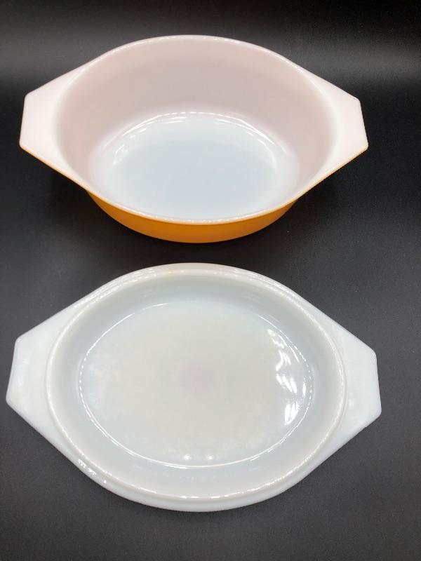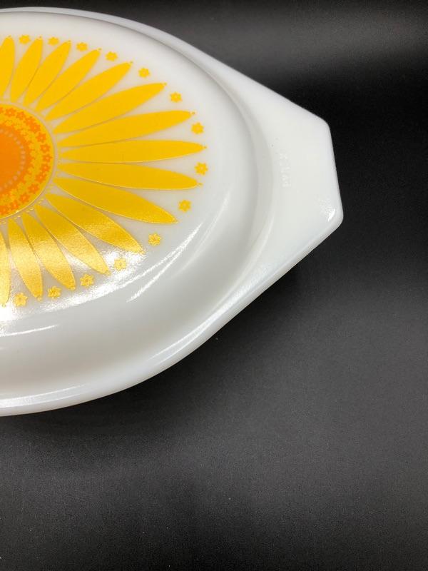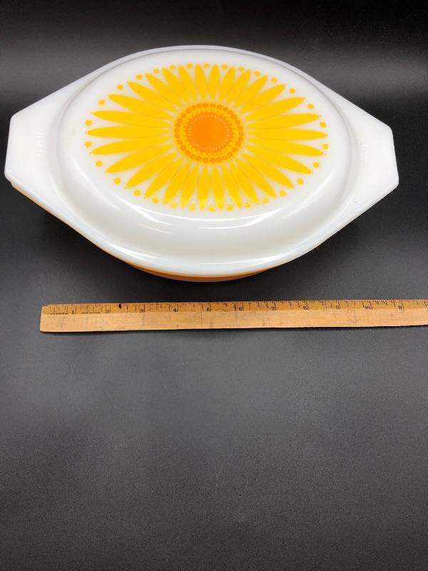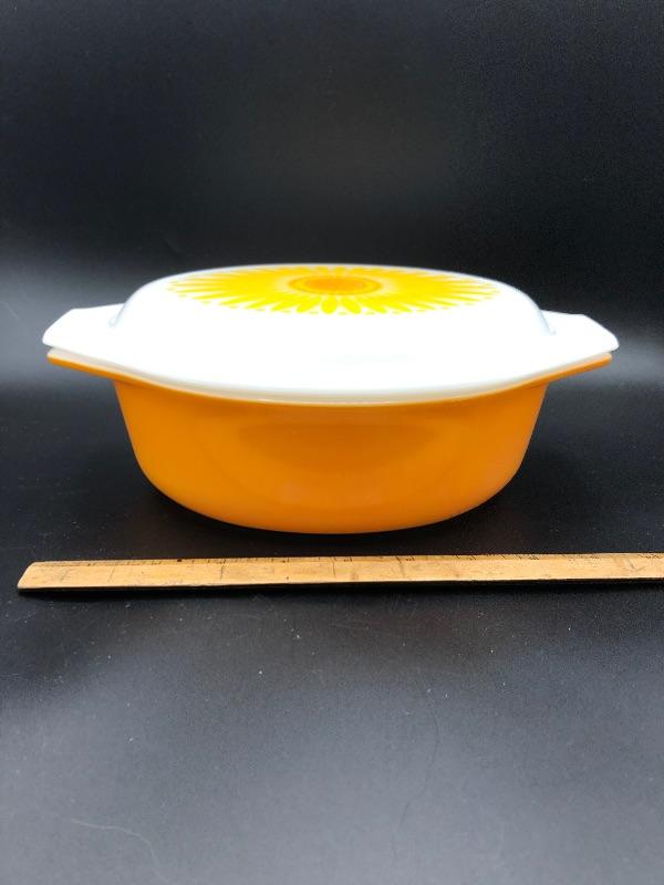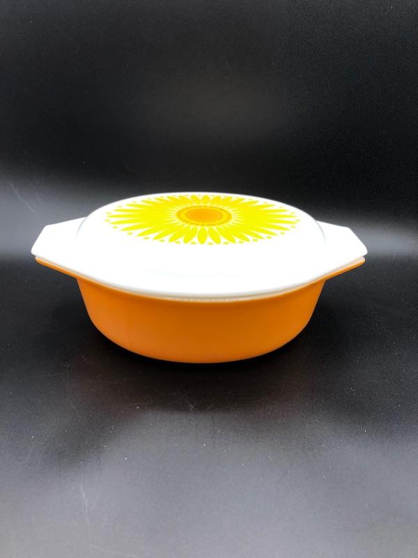 Pyrex Sunflower Casserole Dish. Orange dish, white lid with a yellow and orange sunflower. 1 1/2qt size. Excellent condition.