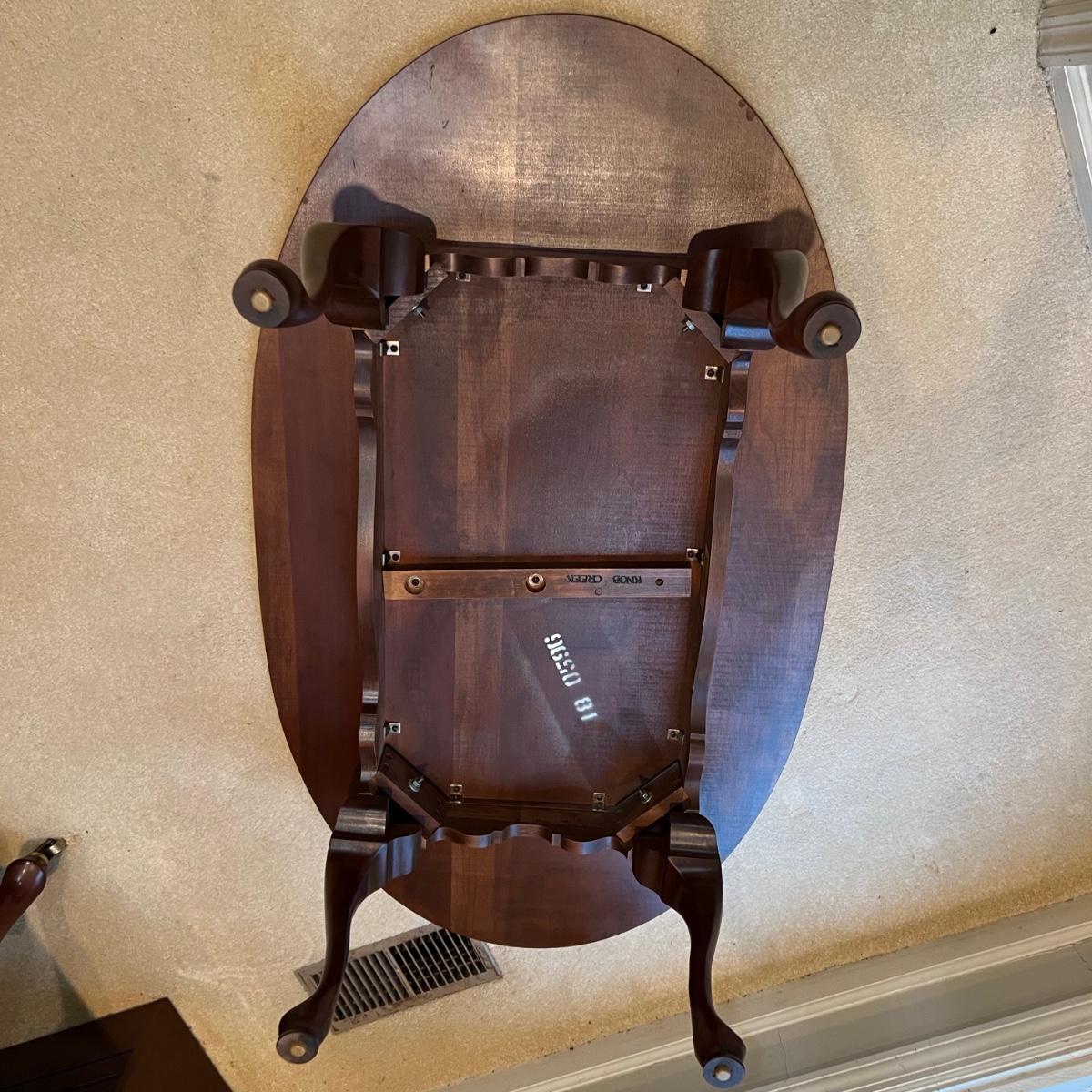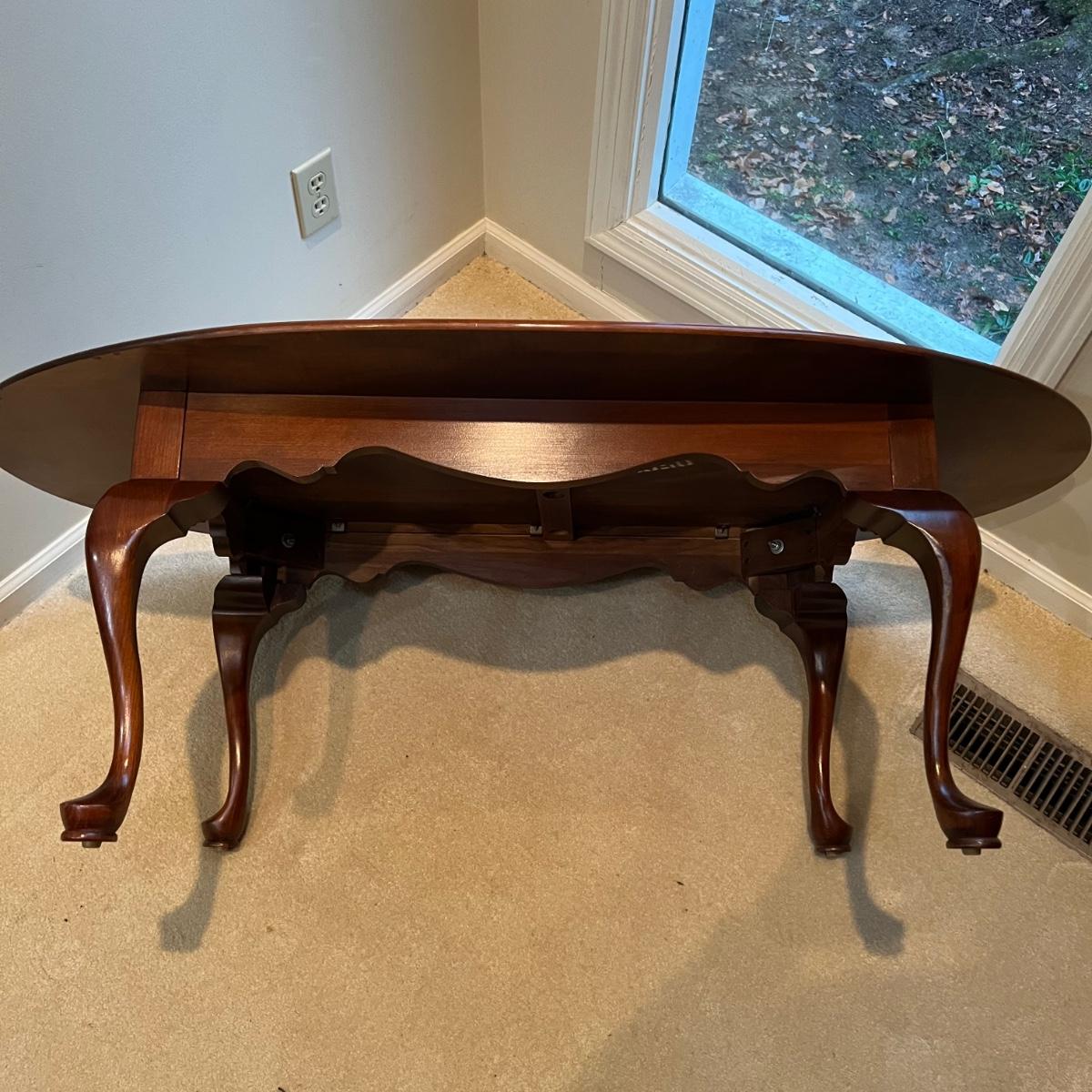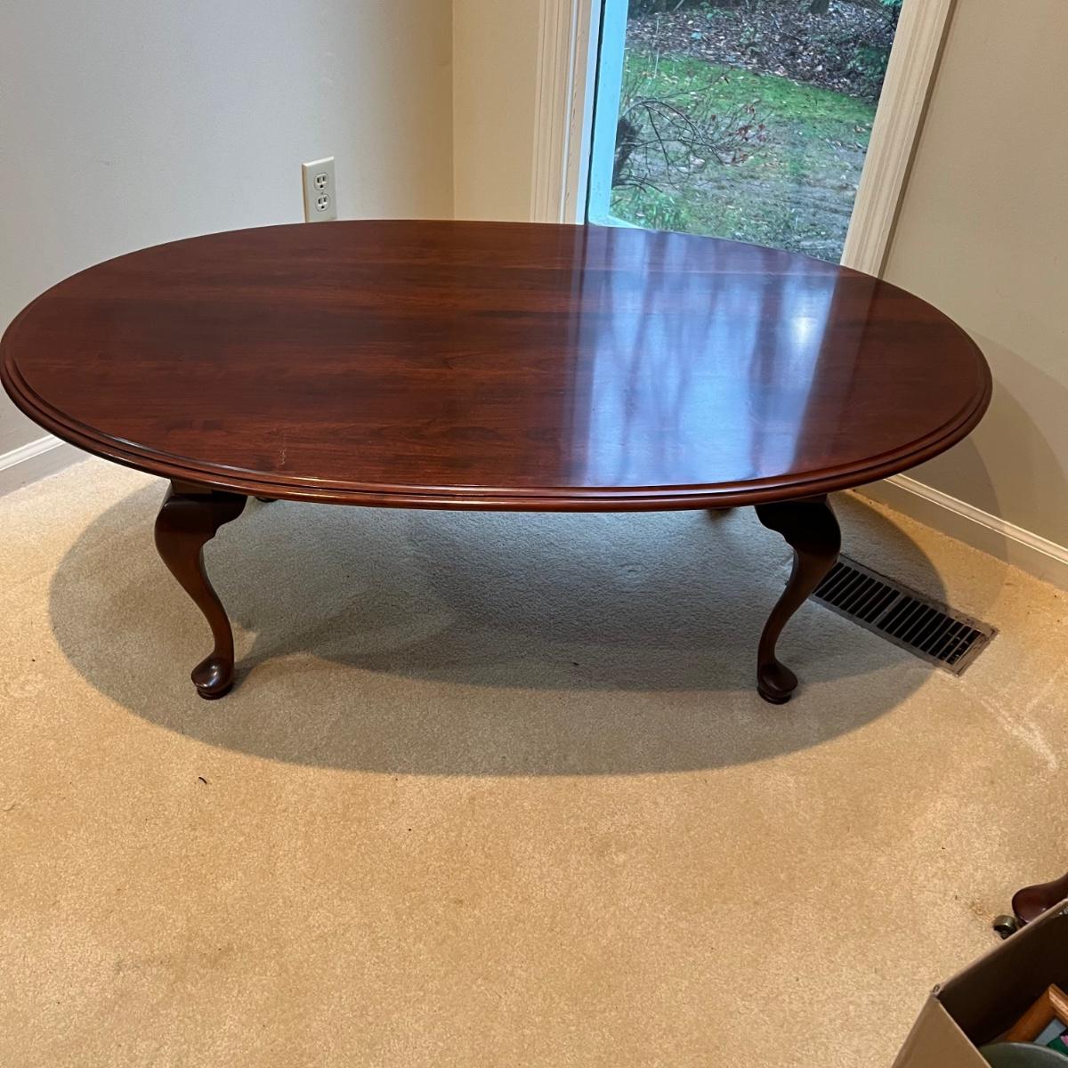 Oval wood coffee table by Knob Creek. The wooden table is brown in color with Queen Anne style legs. The table measures 48”L x 28.5”W x 17”H. A traditional, understated piece perfect for any living room, gently used. Local pick up only.