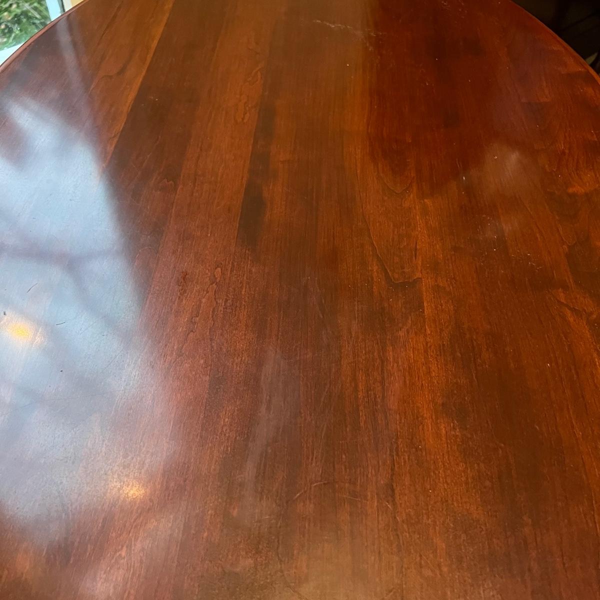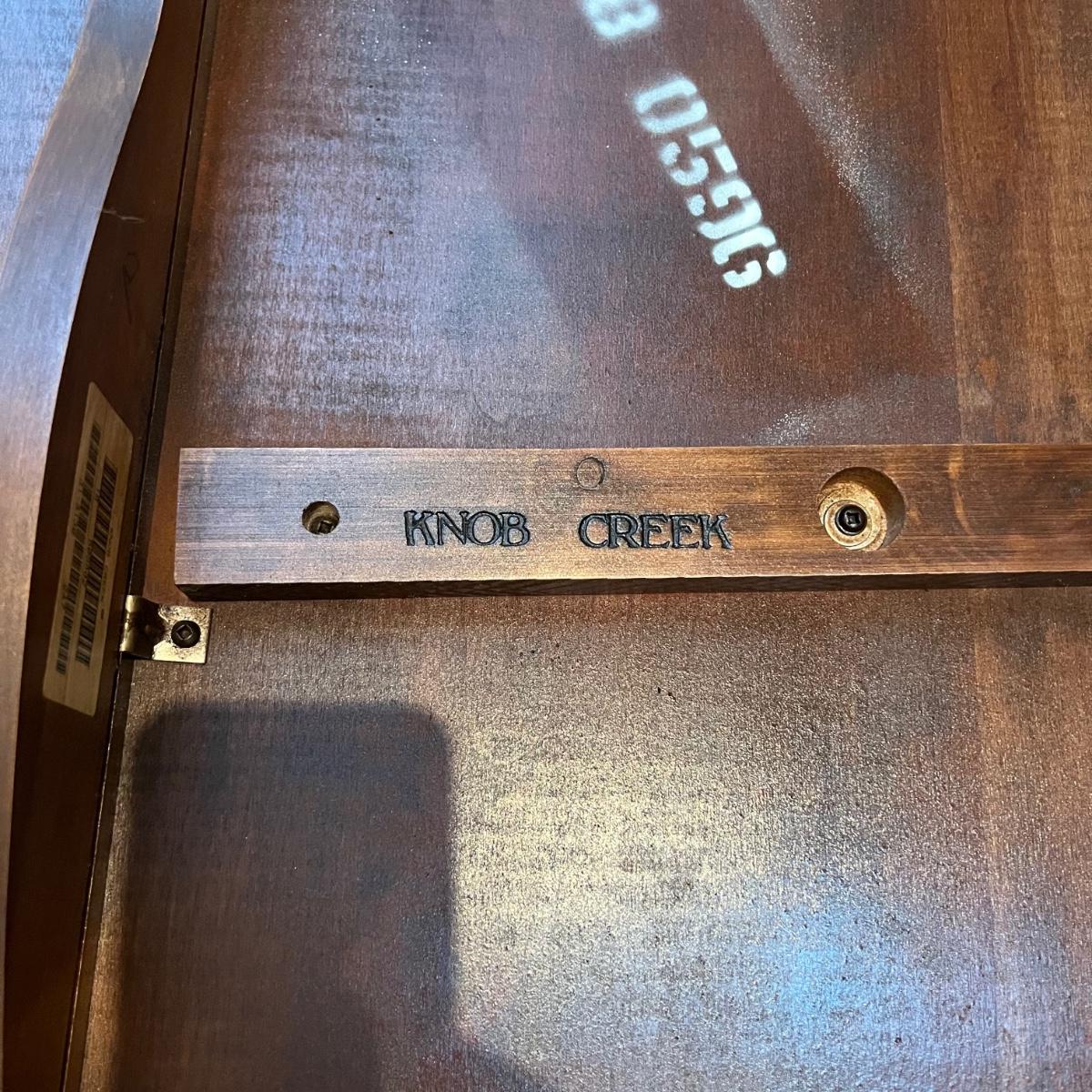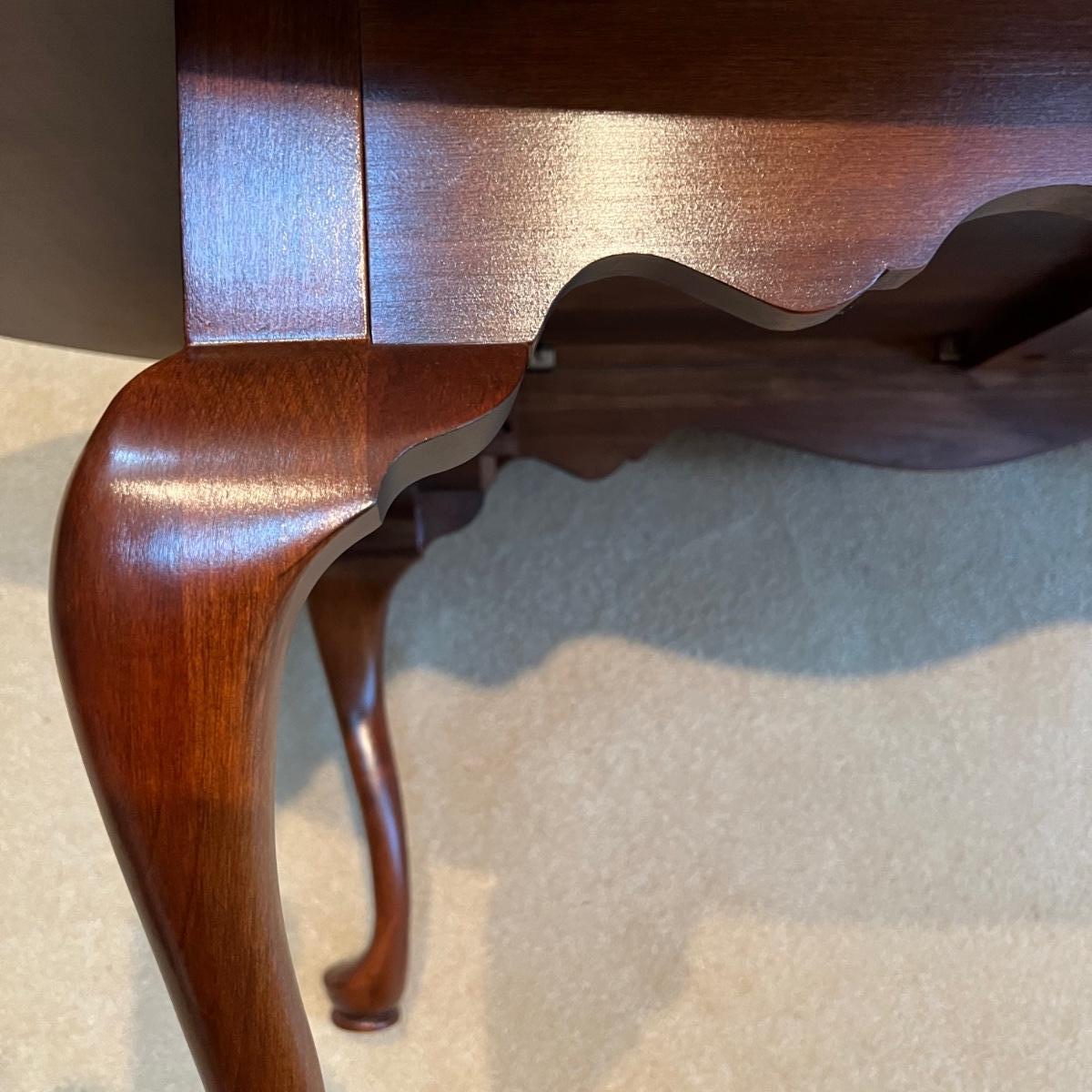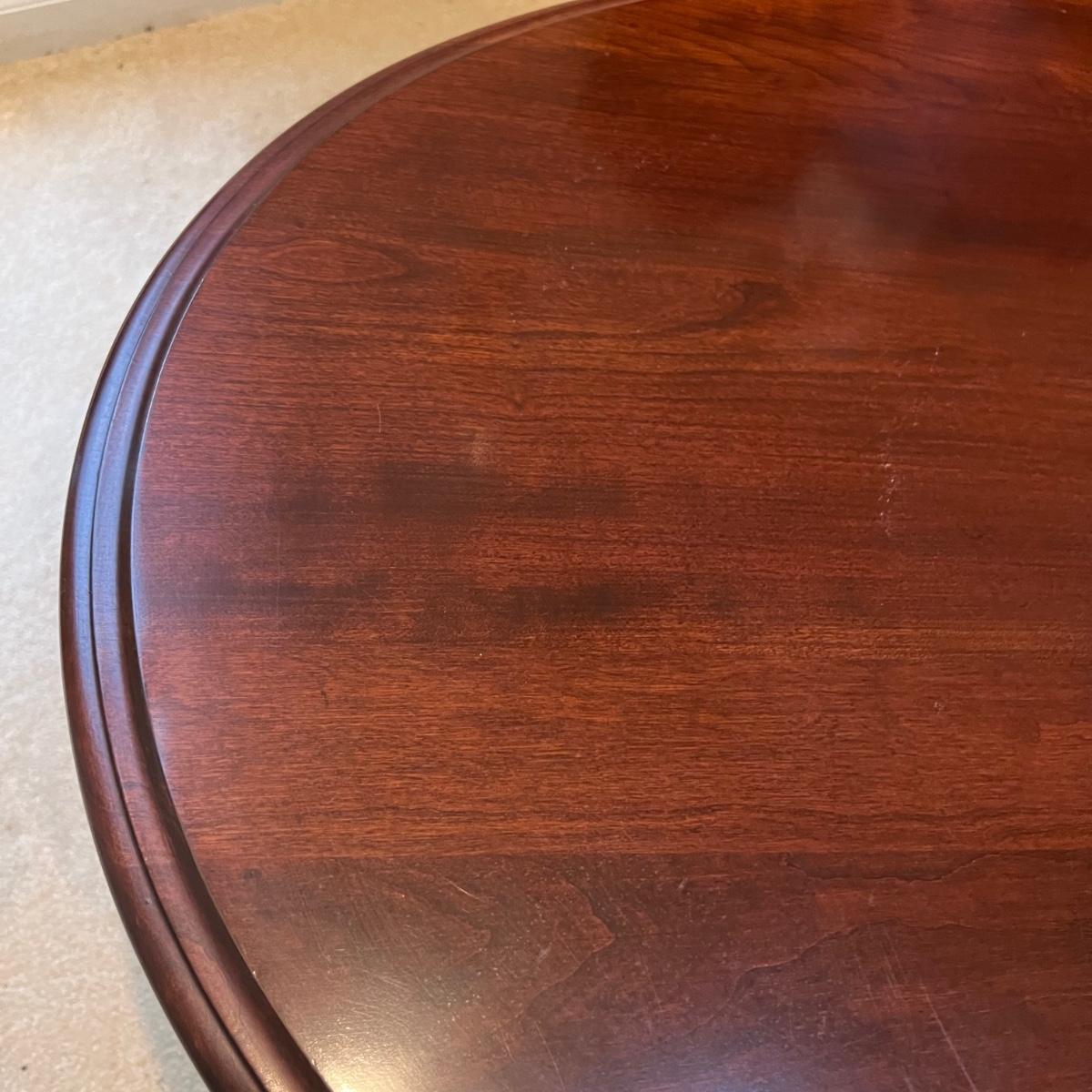 Oval wood coffee table by Knob Creek. The wooden table is brown in color with Queen Anne style legs. The table measures 48”L x 28.5”W x 17”H. A traditional, understated piece perfect for any living room, gently used. Local pick up only.