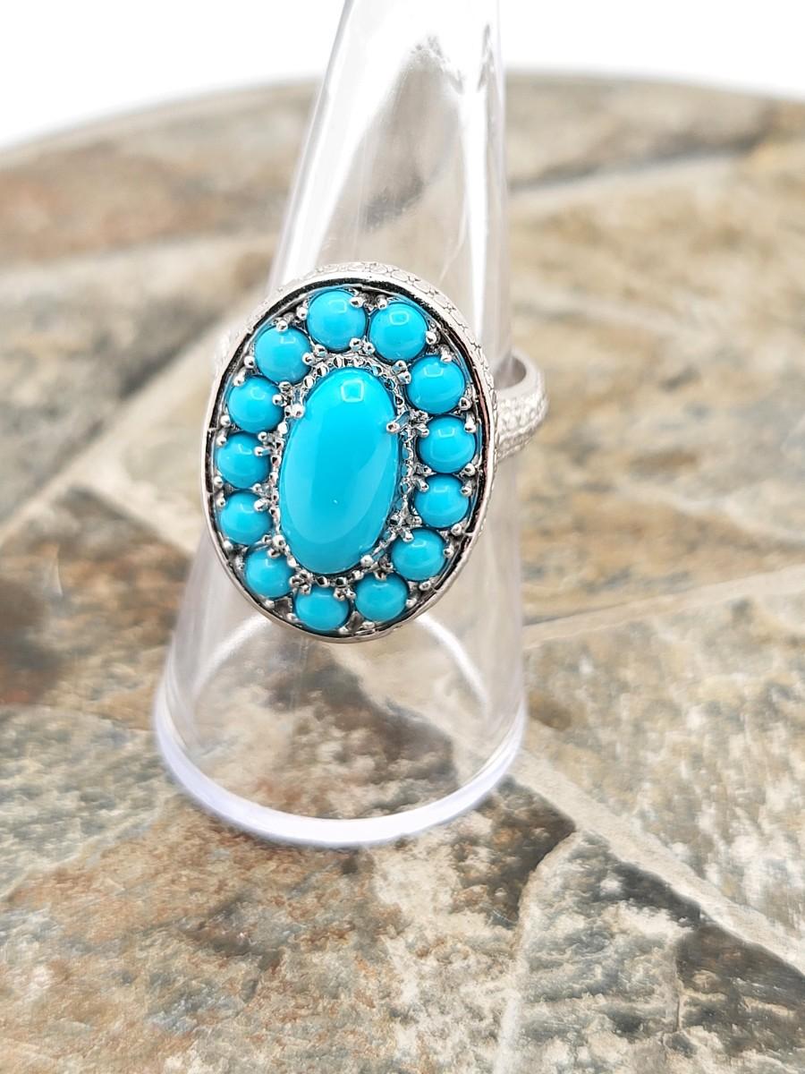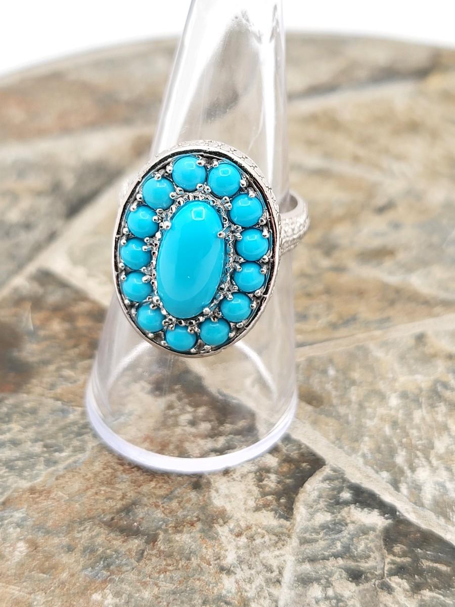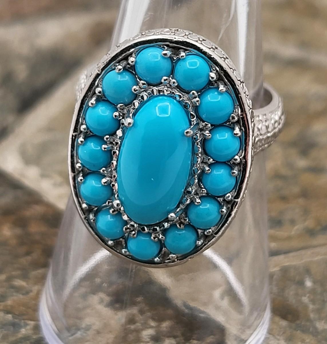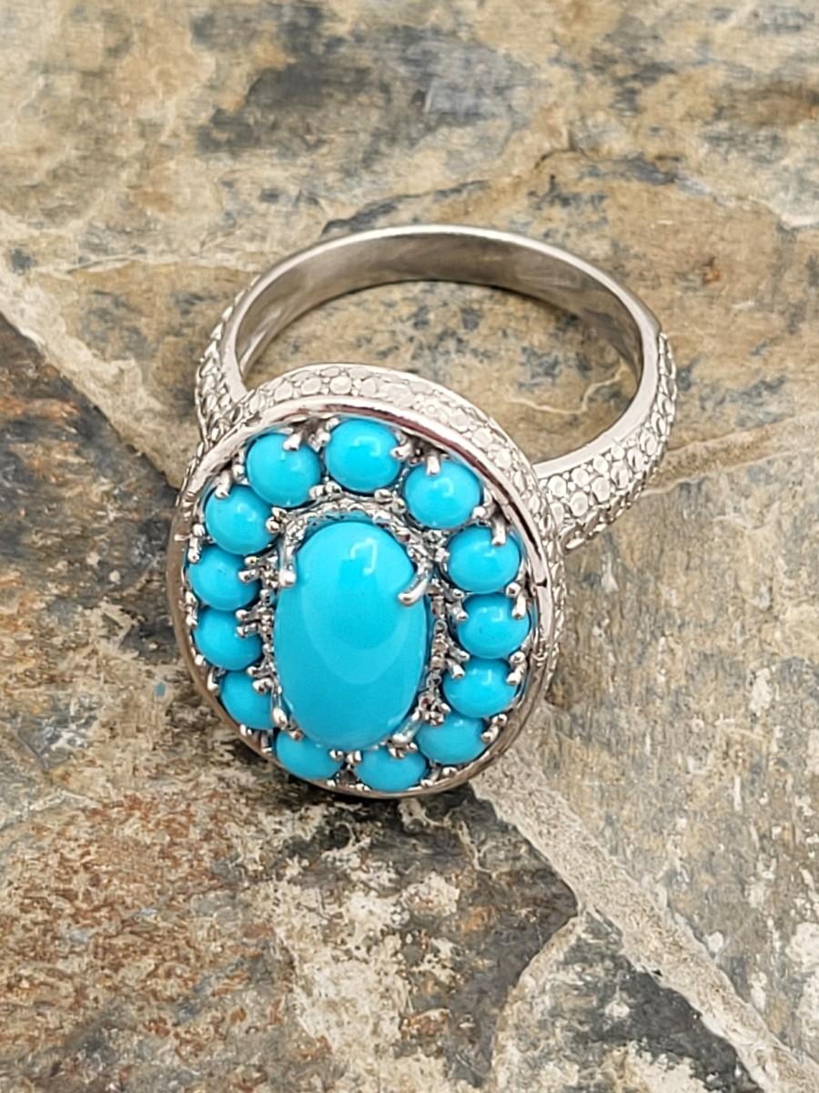 Thirteen round turquoise stones surround the center oval stone. Fancy, diamond cut illusion under face of ring and 1/2 way down either side of the shank. Size 8. Weighs 7.9 grams.