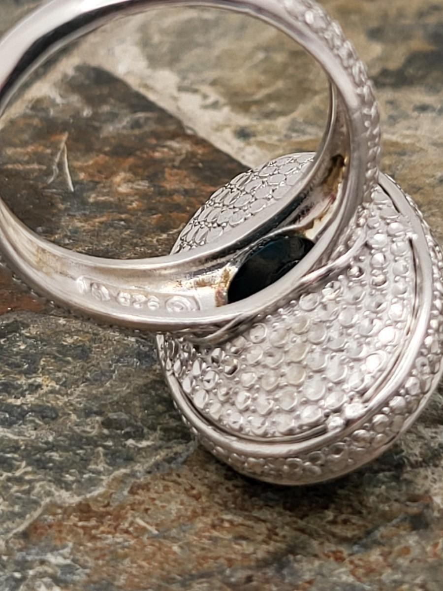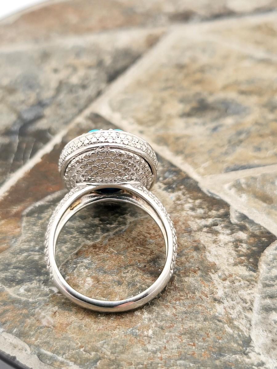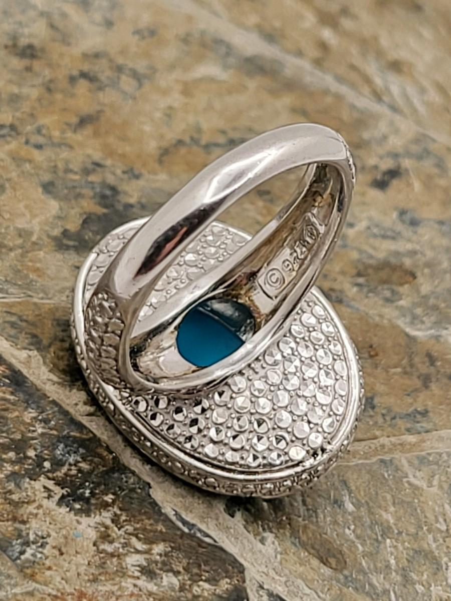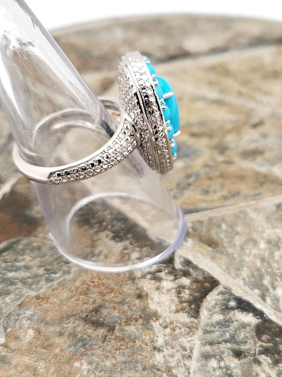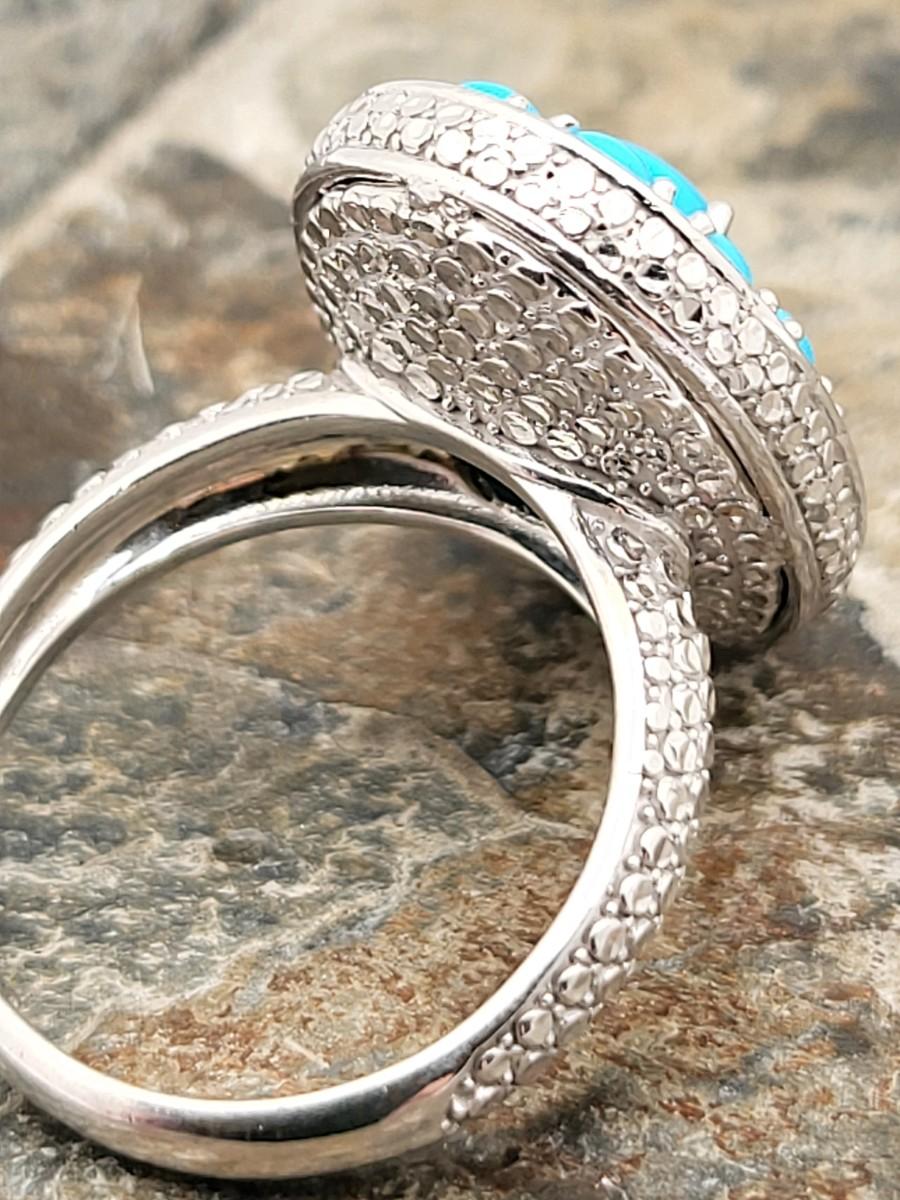 Thirteen round turquoise stones surround the center oval stone. Fancy, diamond cut illusion under face of ring and 1/2 way down either side of the shank. Size 8. Weighs 7.9 grams.