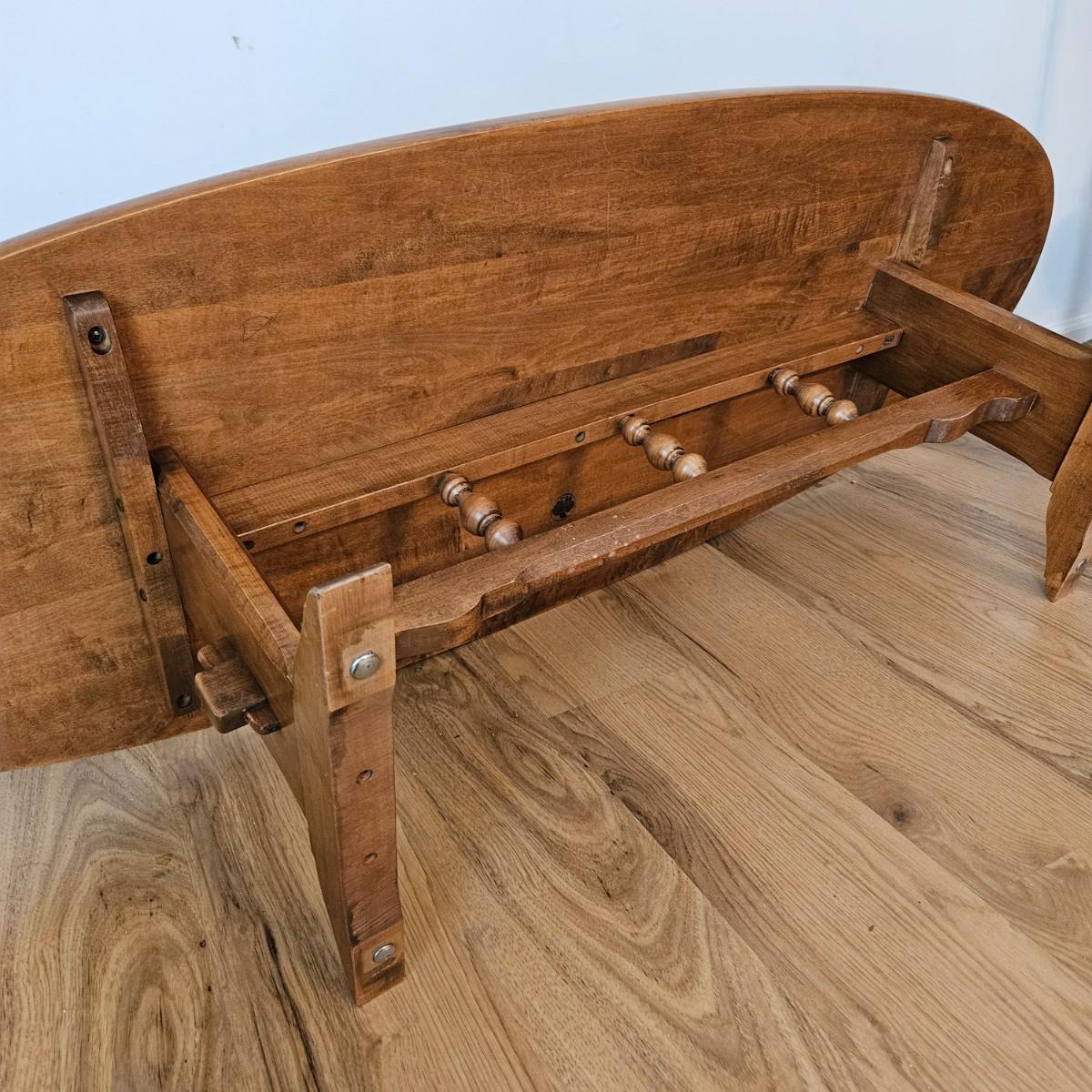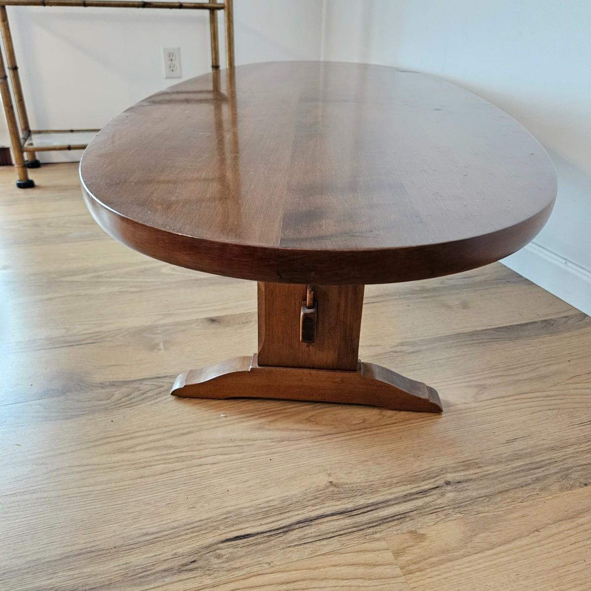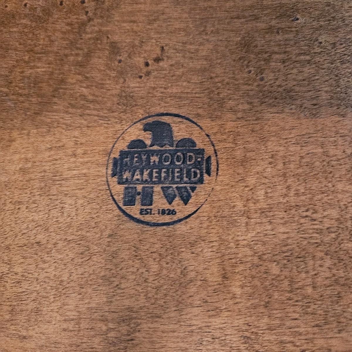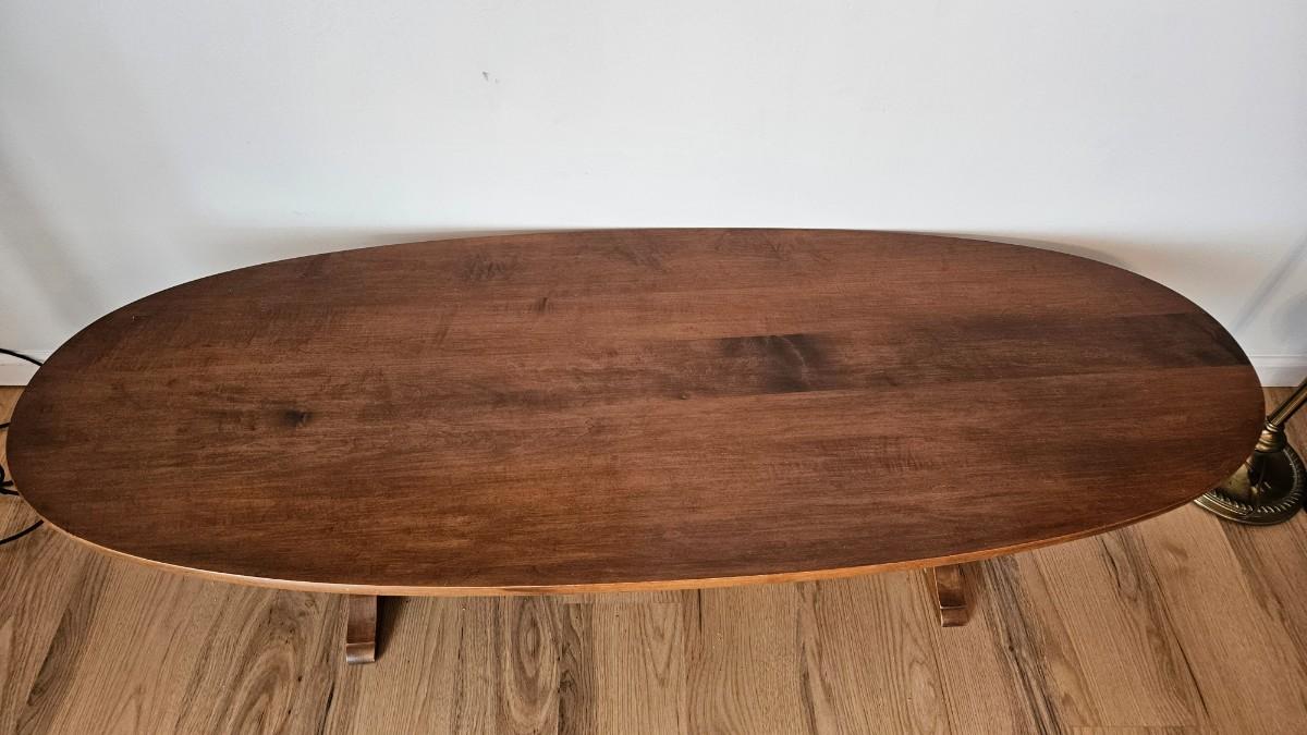 A solid wood coffee table that is oval shaped, manufactured by Heywood Wakefield and measures approximately 66" x 24" x 16"H. Local pickup only. Winning bidder must bring assistance to help move and load this item due to its weight and/or size. Item is located on the second floor.