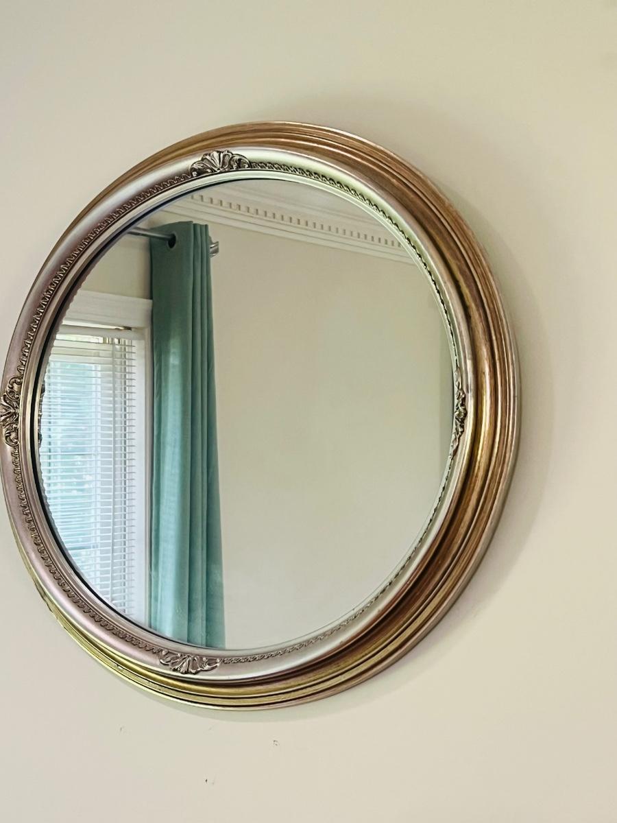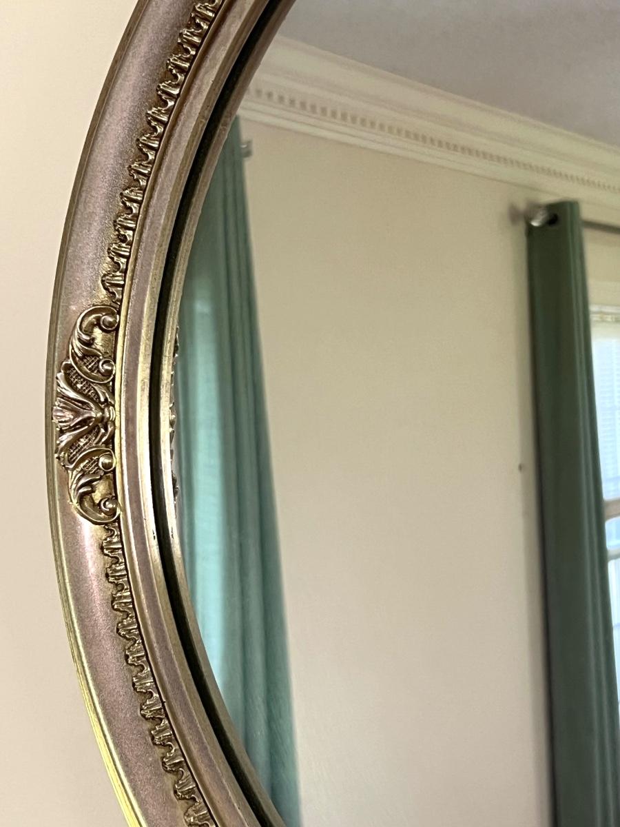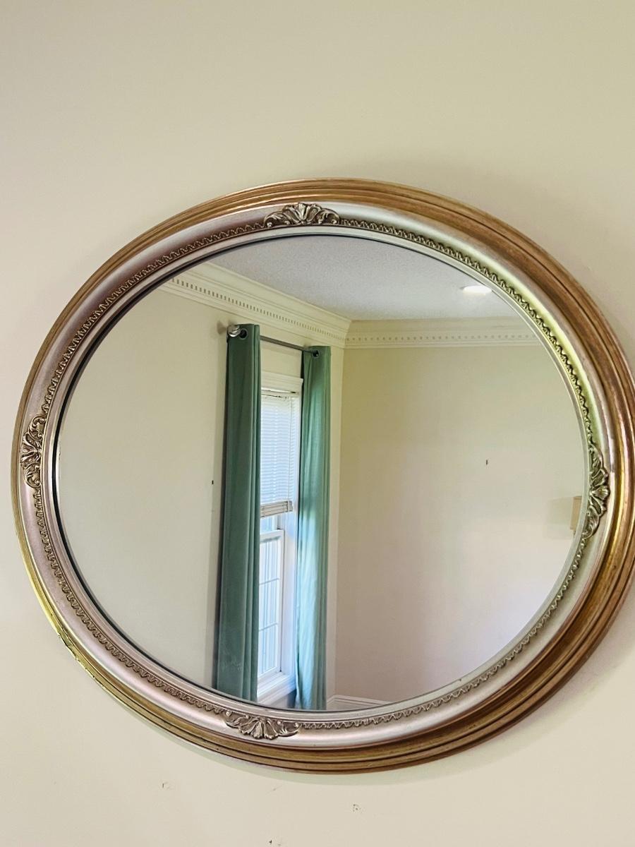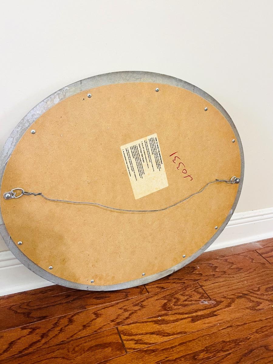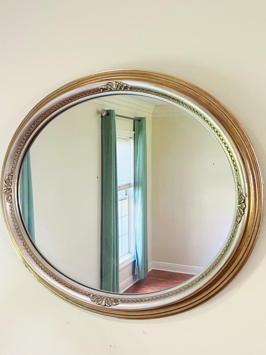 Oval Wall Mirror Measures 28 inches wide and 24 inches tall. Color is a brushed silver with blended brushed light gold.