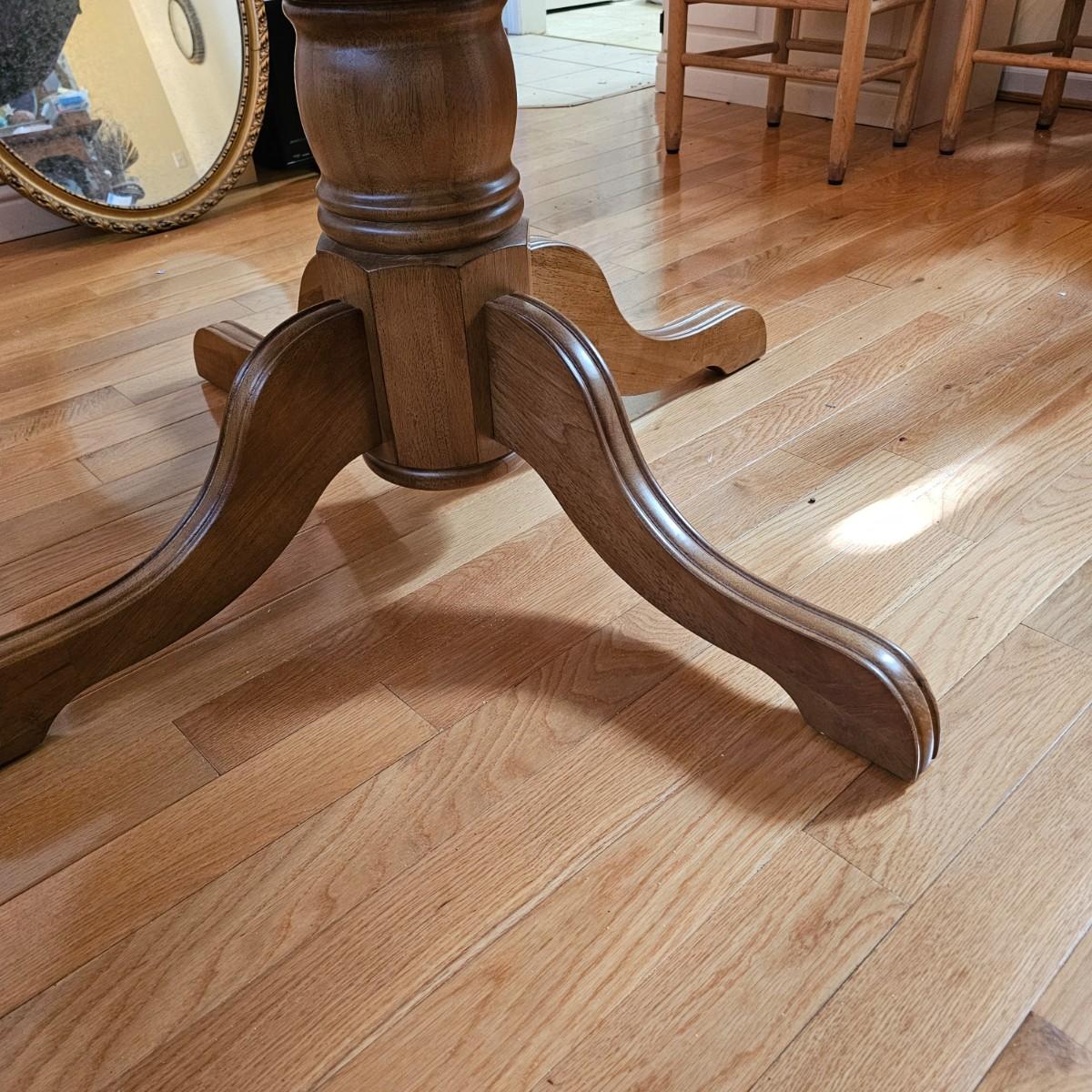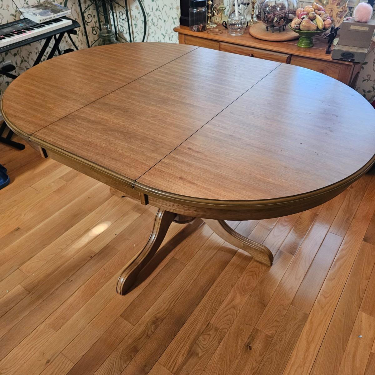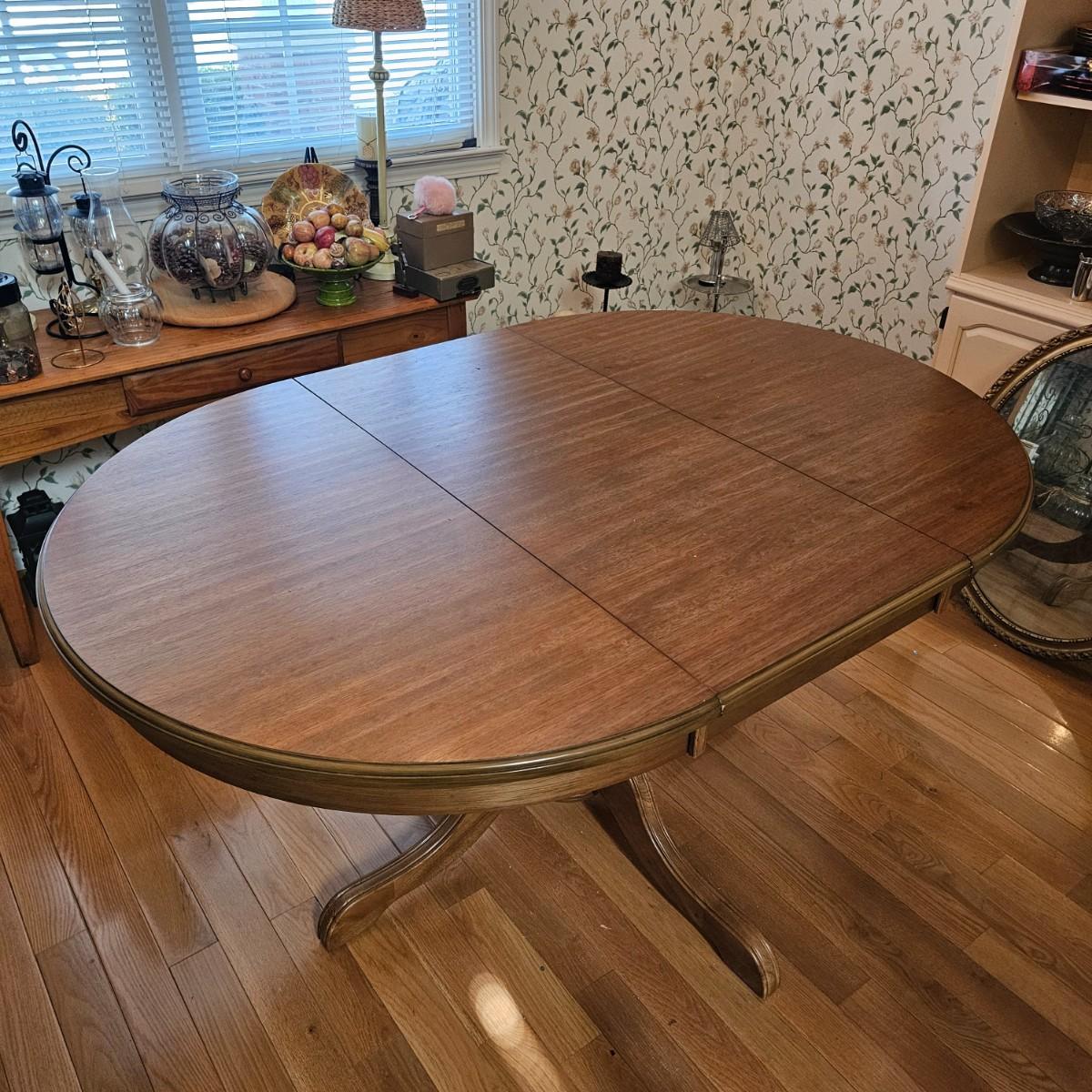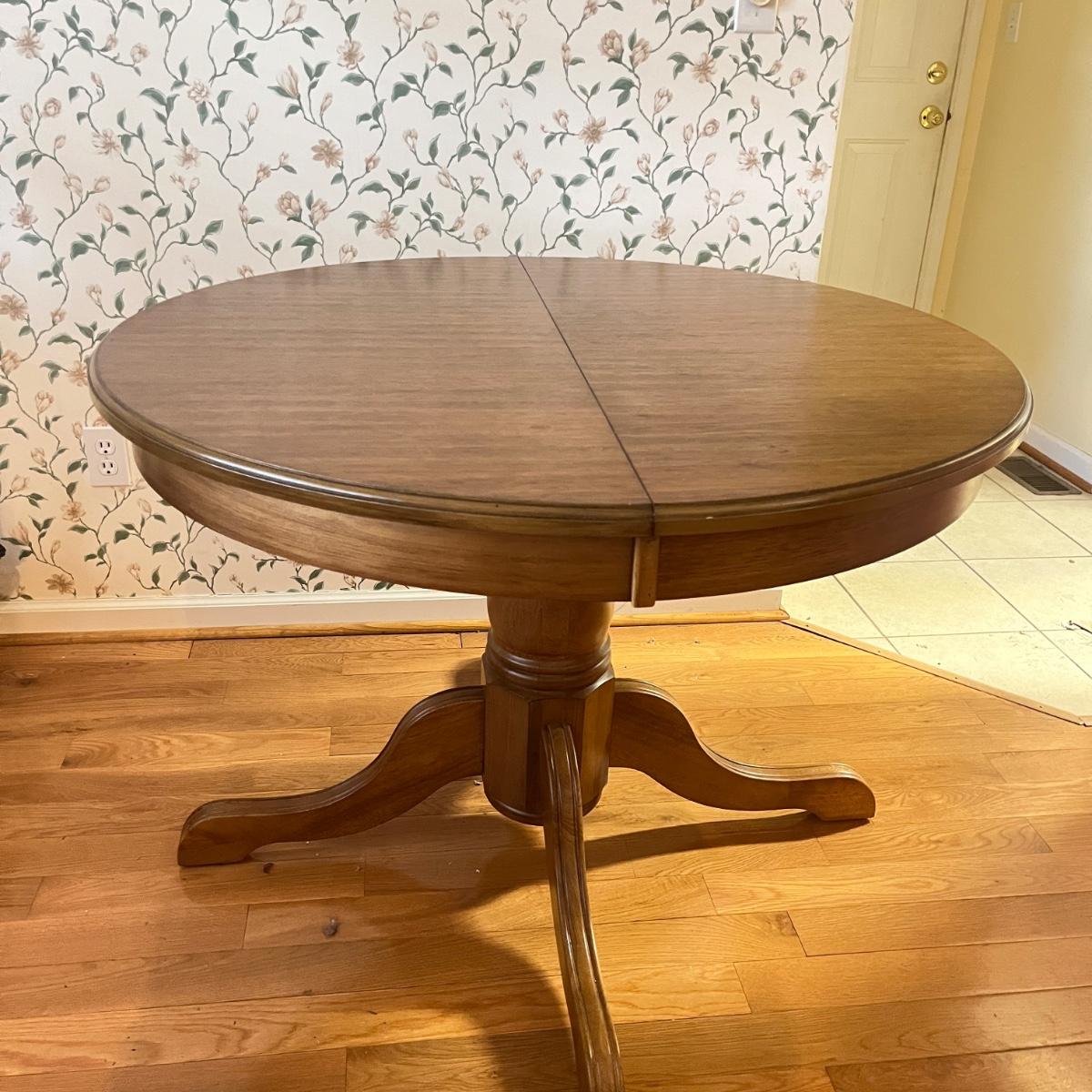Oval wood table with one 18" leaf. Table has four leg pedestal base, measures 42" x 60" x 30"H with leaf. Round table without leaf is 42"D. Some minor blemishes. See photos for details. Local pickup only.