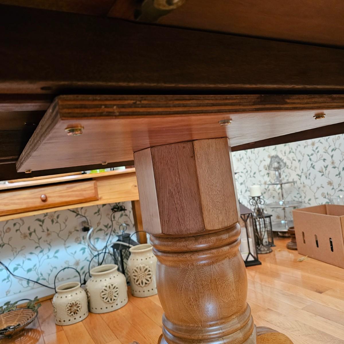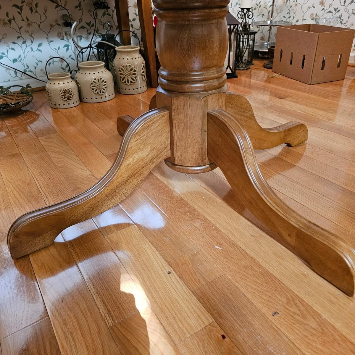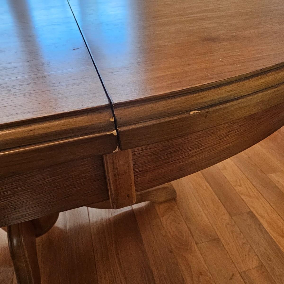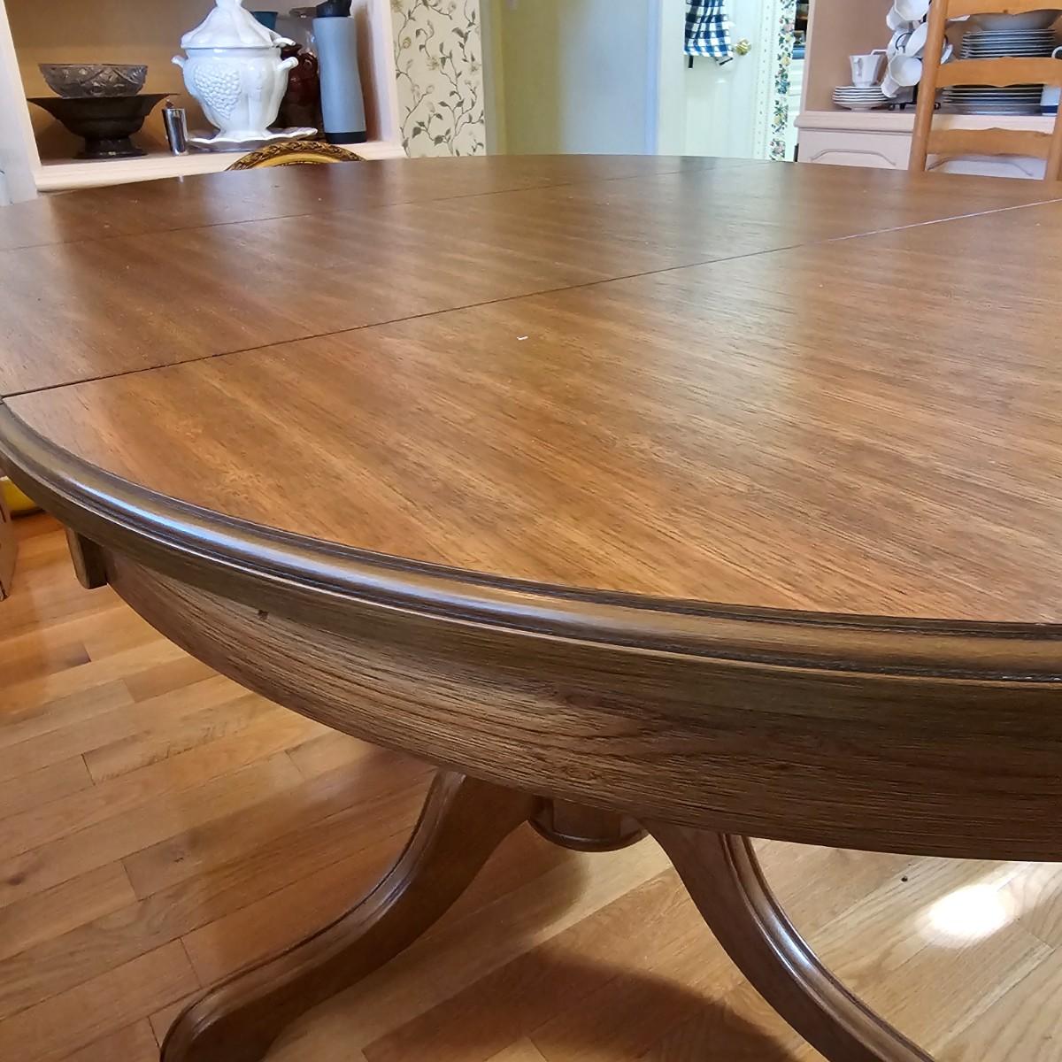 Oval wood table with one 18" leaf. Table has four leg pedestal base, measures 42" x 60" x 30"H with leaf. Round table without leaf is 42"D. Some minor blemishes. See photos for details. Local pickup only.