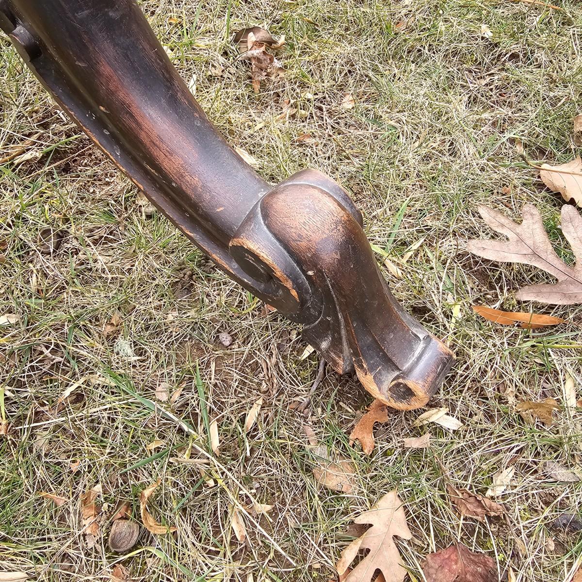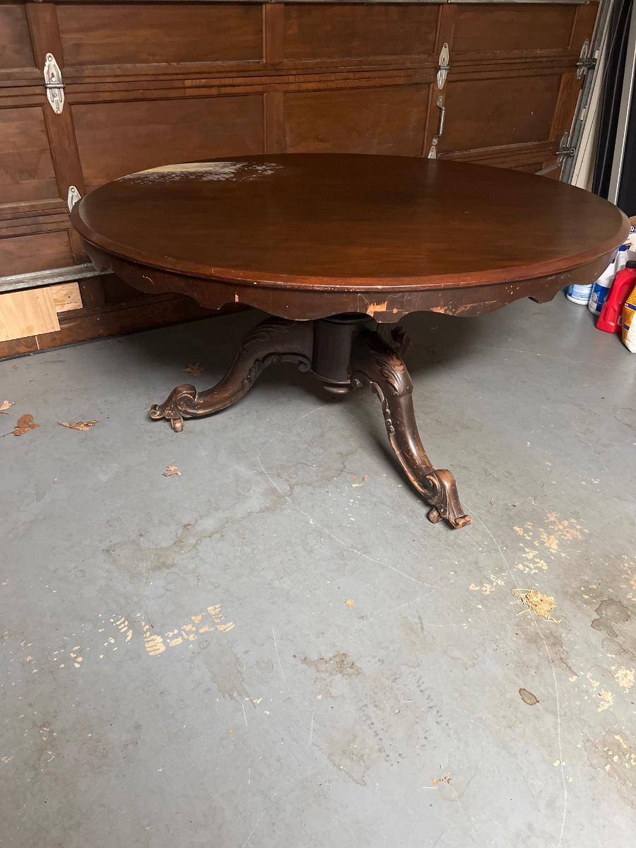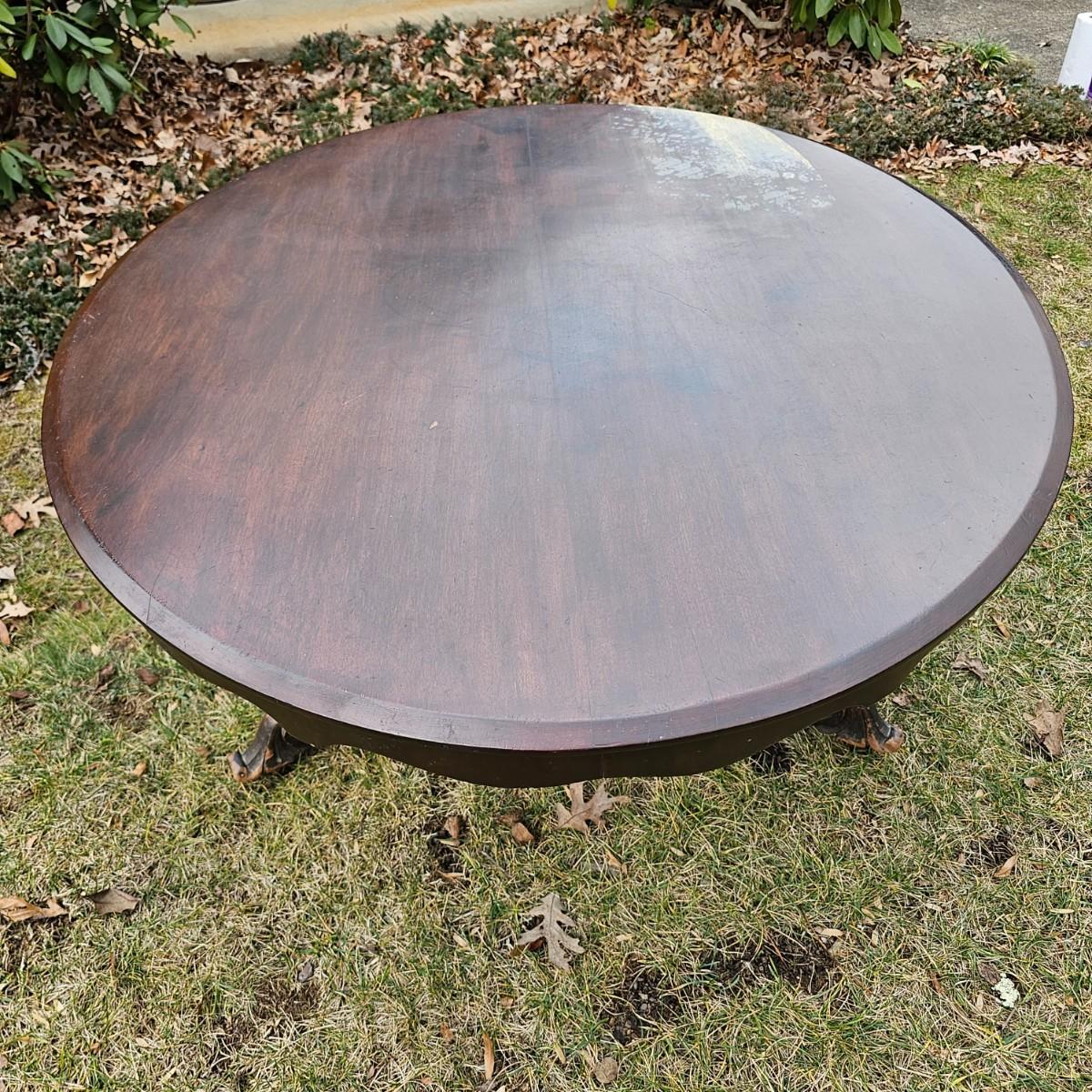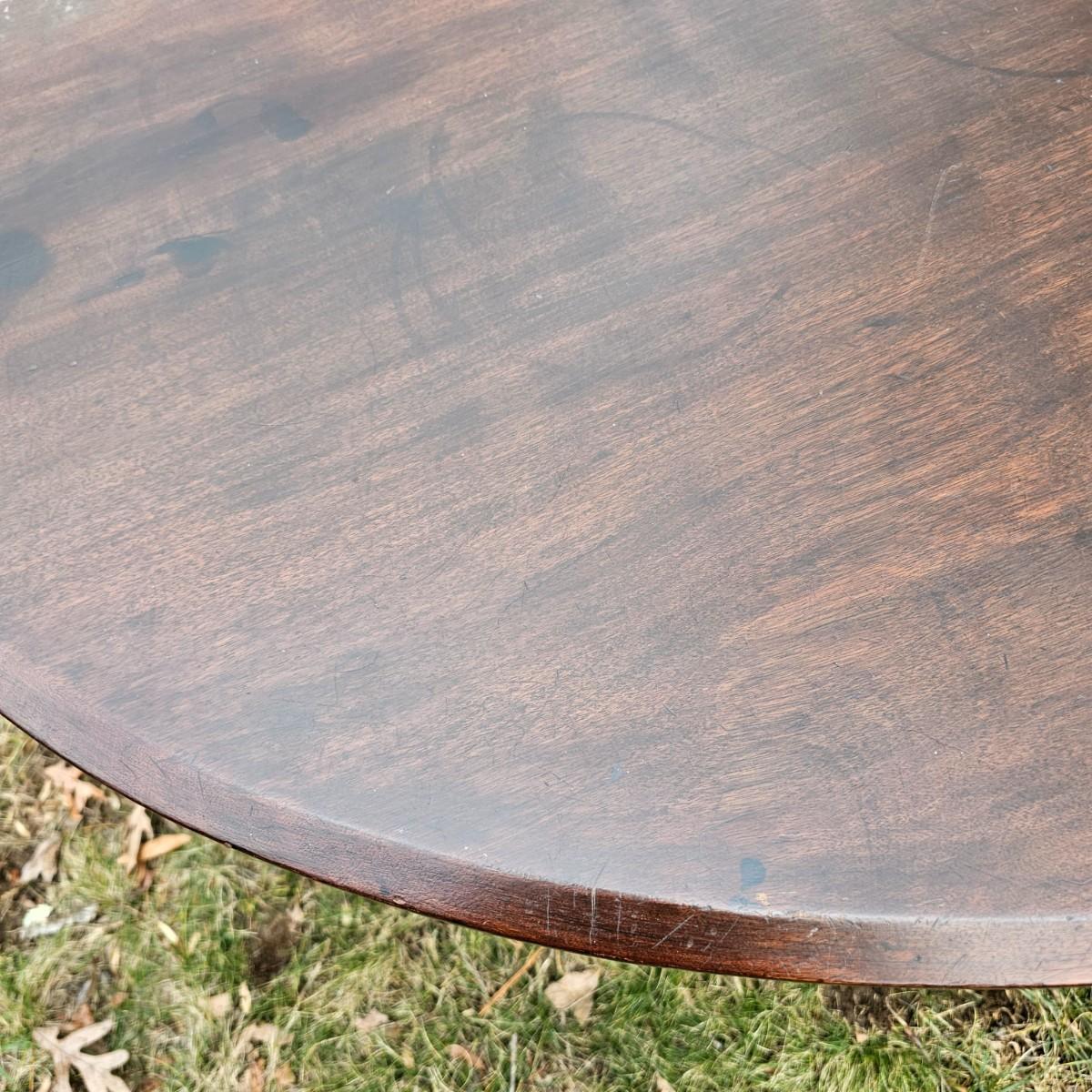 Solid wood vintage oval table with three leg pedestal. Table has had casters added to feet, measures 46" x 54" x 28"H. Dark brown color, table and legs have several blemishes, nicks and chips, and top surface has a stain/worn finish of some sort. See photos for details. Local pickup only.