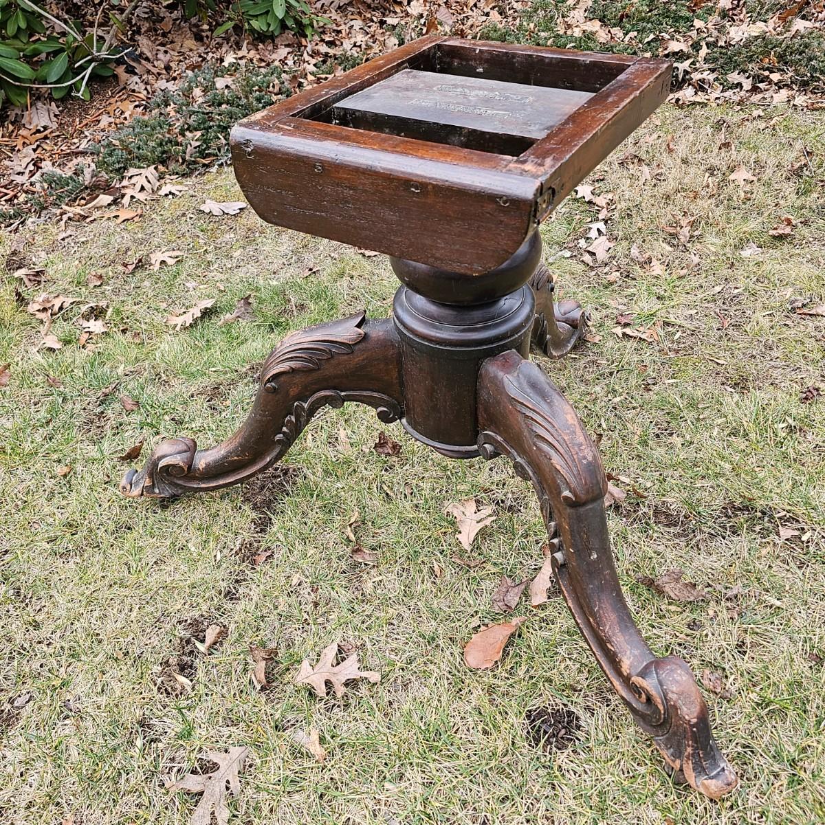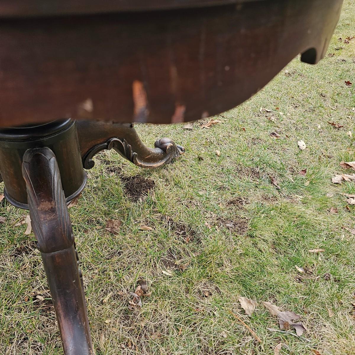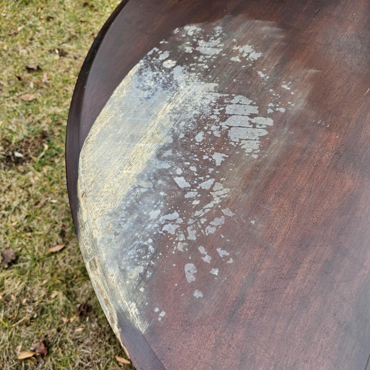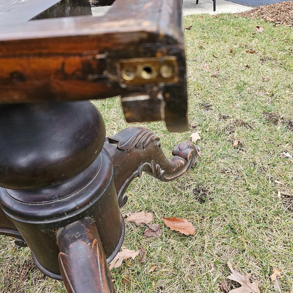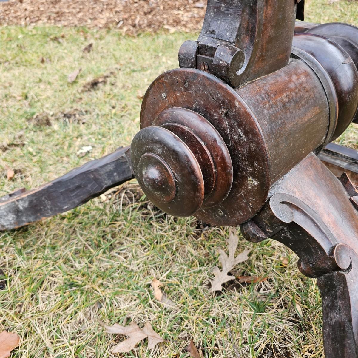 Solid wood vintage oval table with three leg pedestal. Table has had casters added to feet, measures 46" x 54" x 28"H. Dark brown color, table and legs have several blemishes, nicks and chips, and top surface has a stain/worn finish of some sort. See photos for details. Local pickup only.