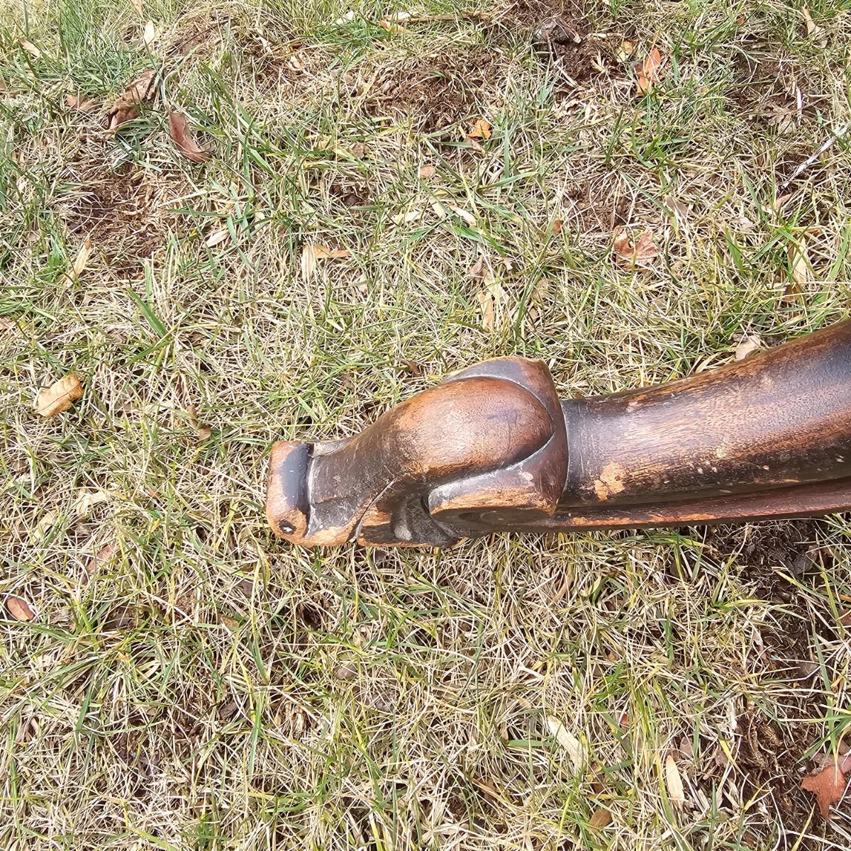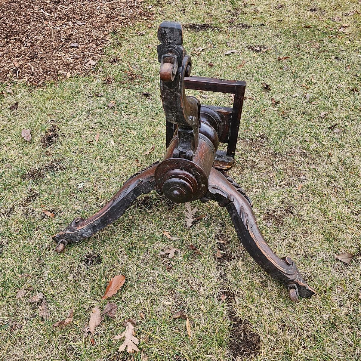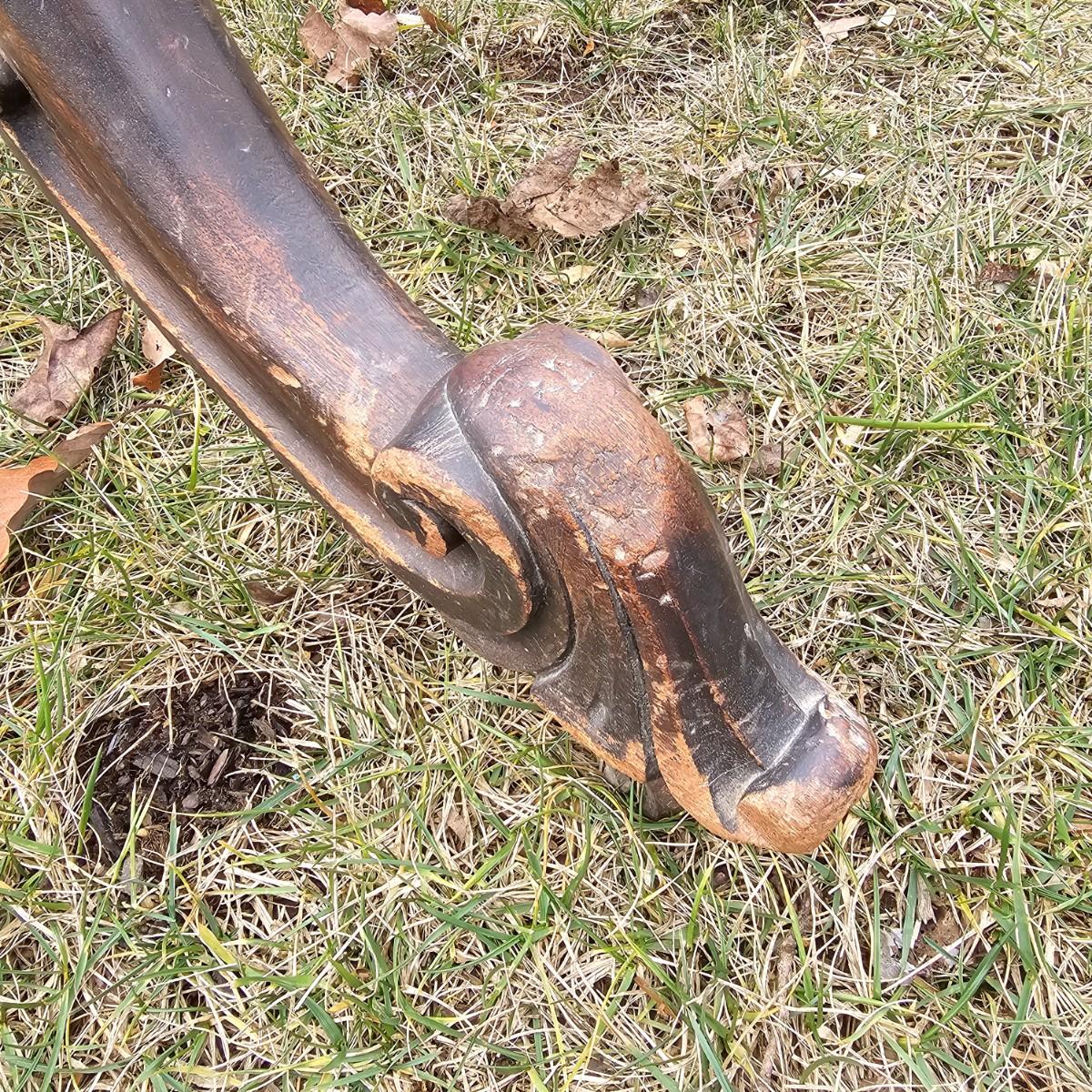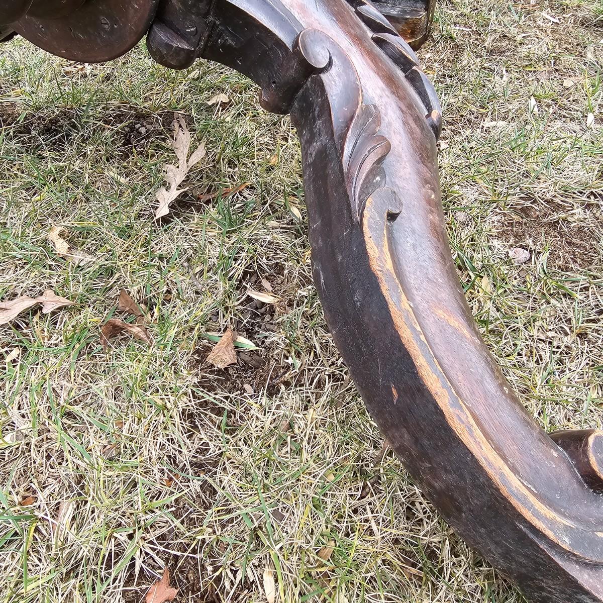 Solid wood vintage oval table with three leg pedestal. Table has had casters added to feet, measures 46" x 54" x 28"H. Dark brown color, table and legs have several blemishes, nicks and chips, and top surface has a stain/worn finish of some sort. See photos for details. Local pickup only.