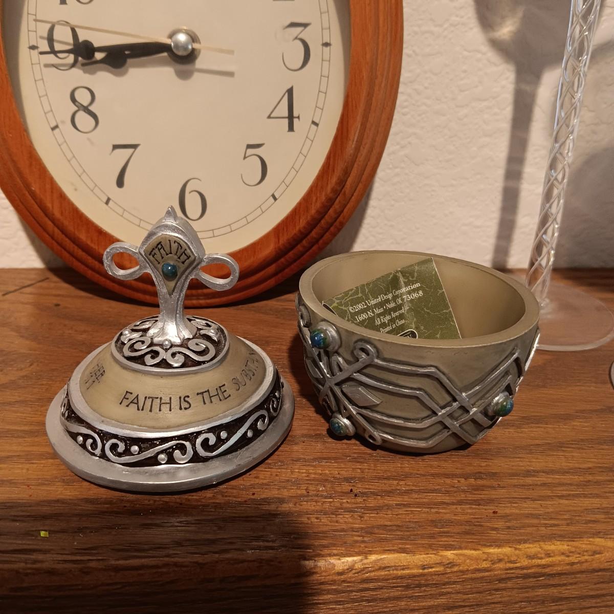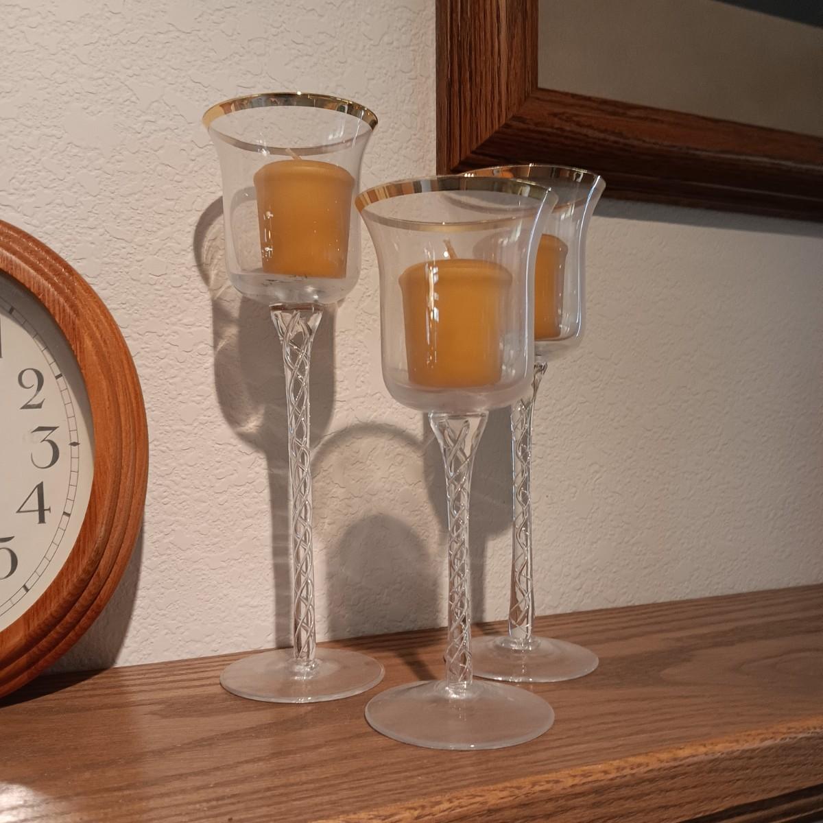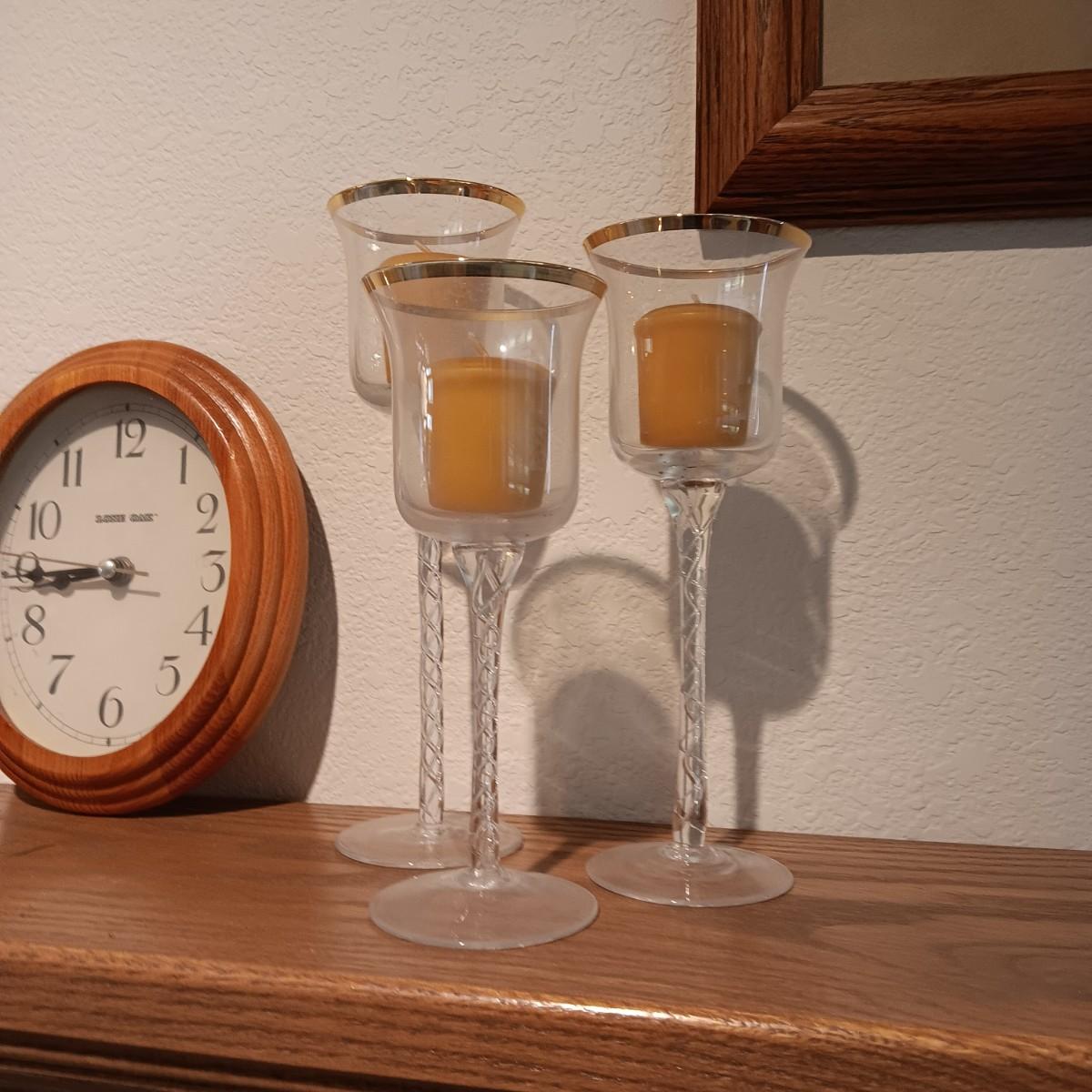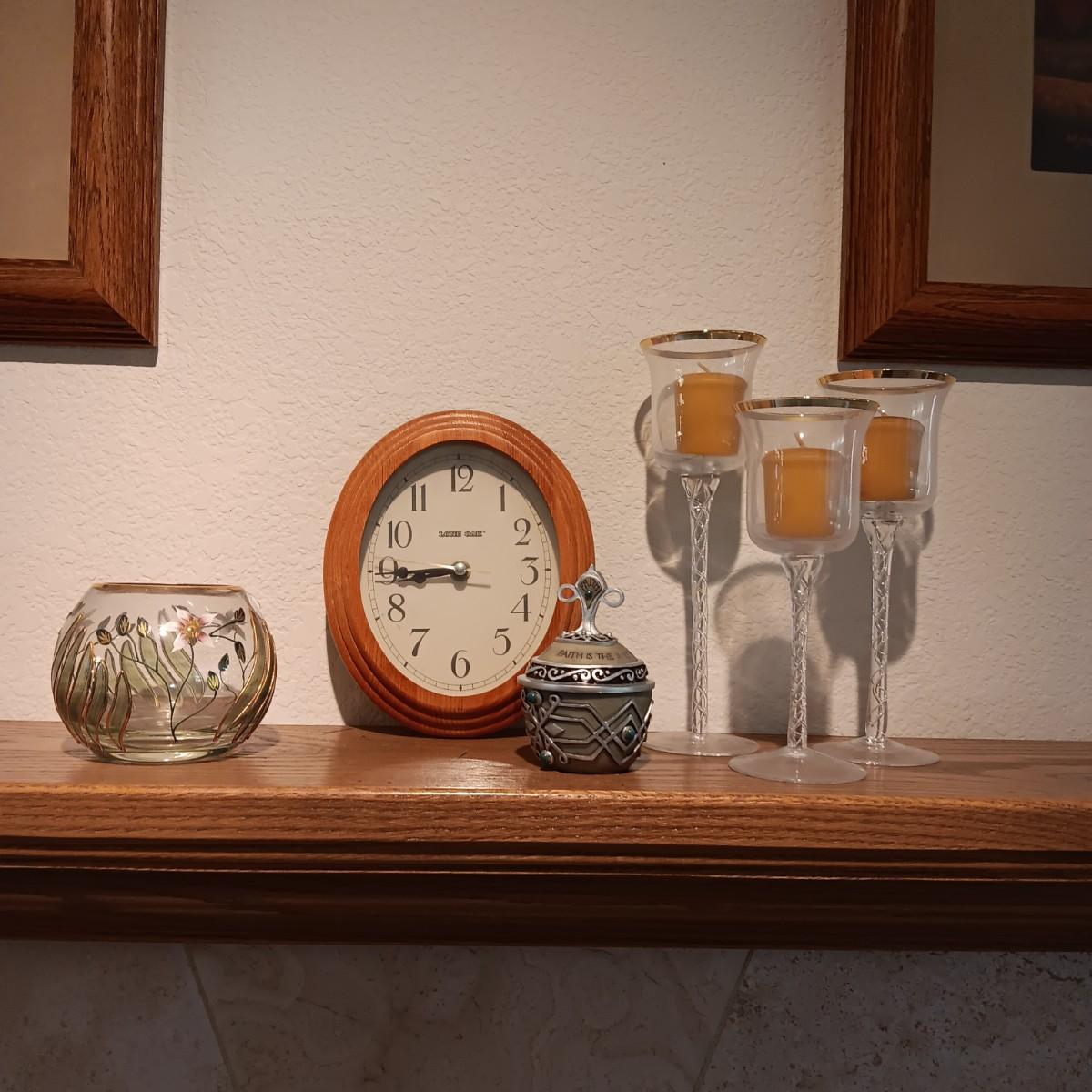 OVAL WOODEN FRAMED WALL CLOCK, 3 GLASS STEMMED CANDLE HOLDERS, GLASS ROSE BOWL AND TRINKET BOX