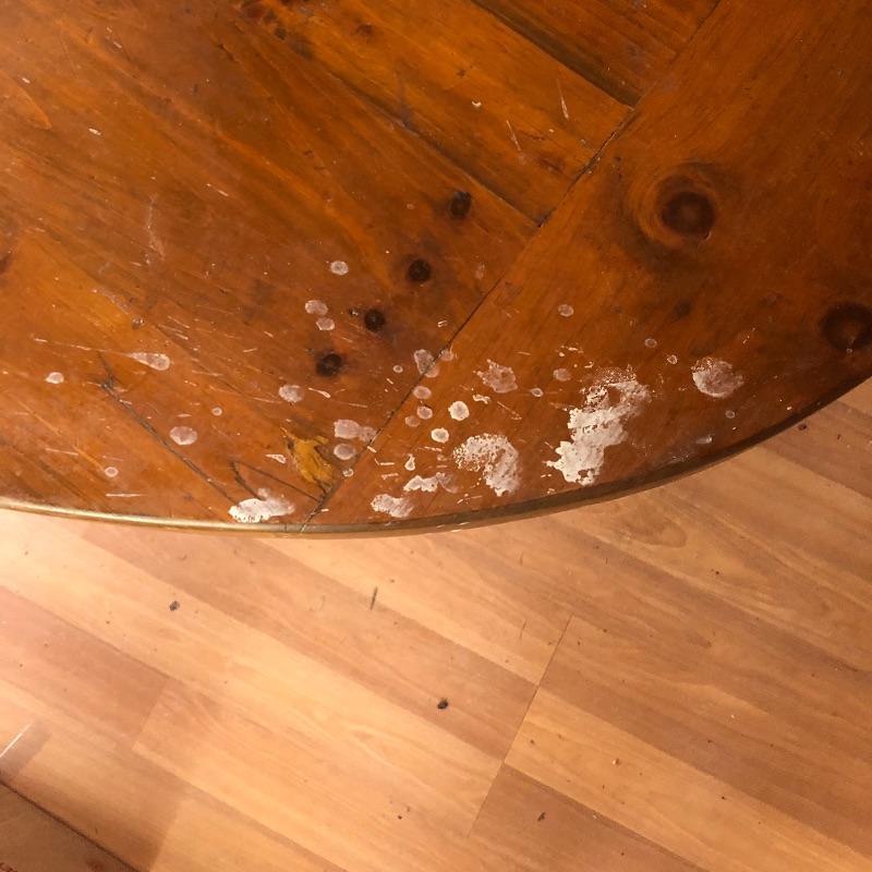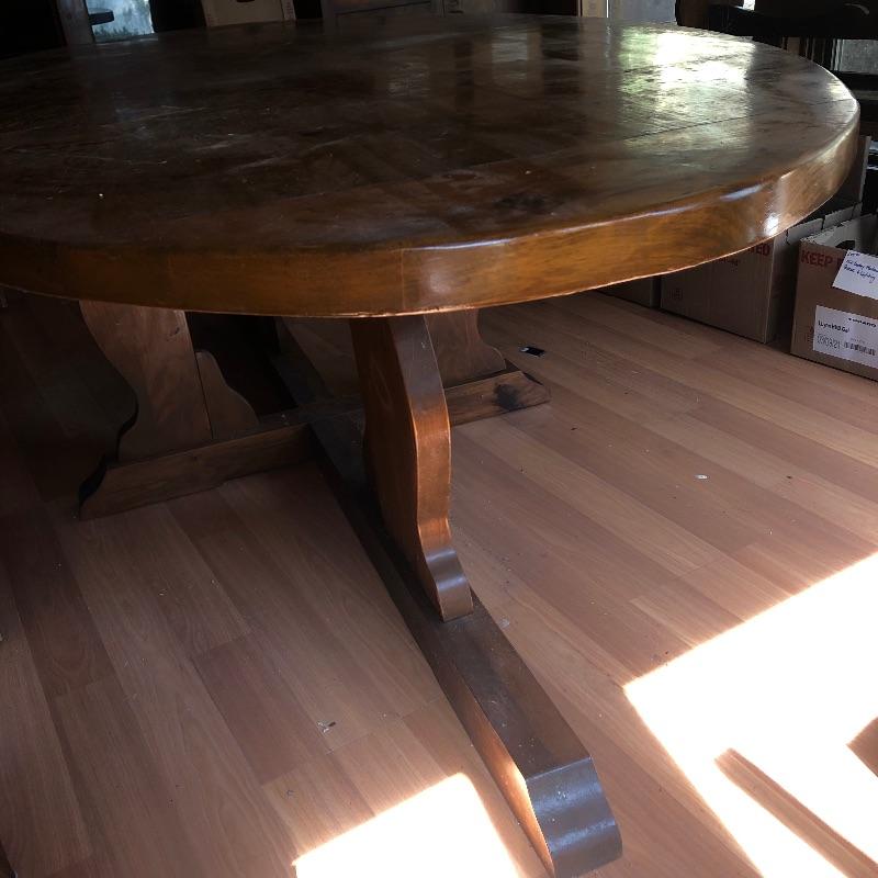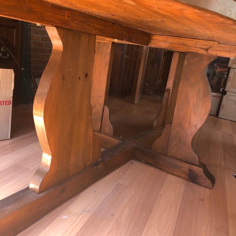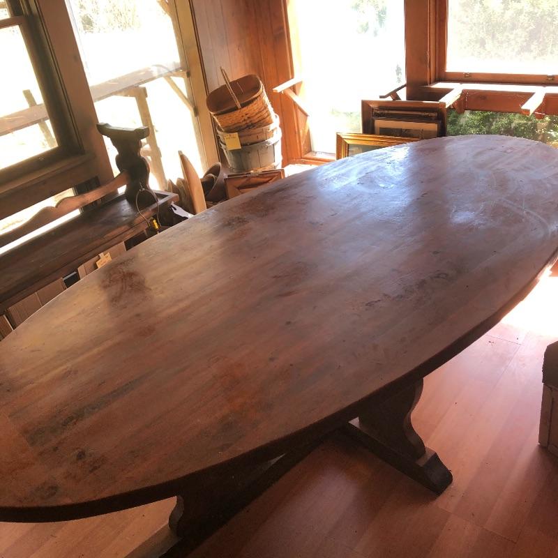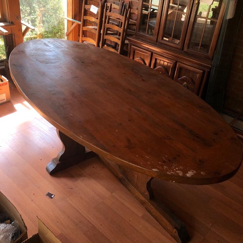 This oval wooden table is 96” long at it’s longest point, 48” wide, and 2’ 5” tall. Despite some staining, this table just needs a good cleaning, a new stain and some cool chairs to bring it back to life. Local pickup only.