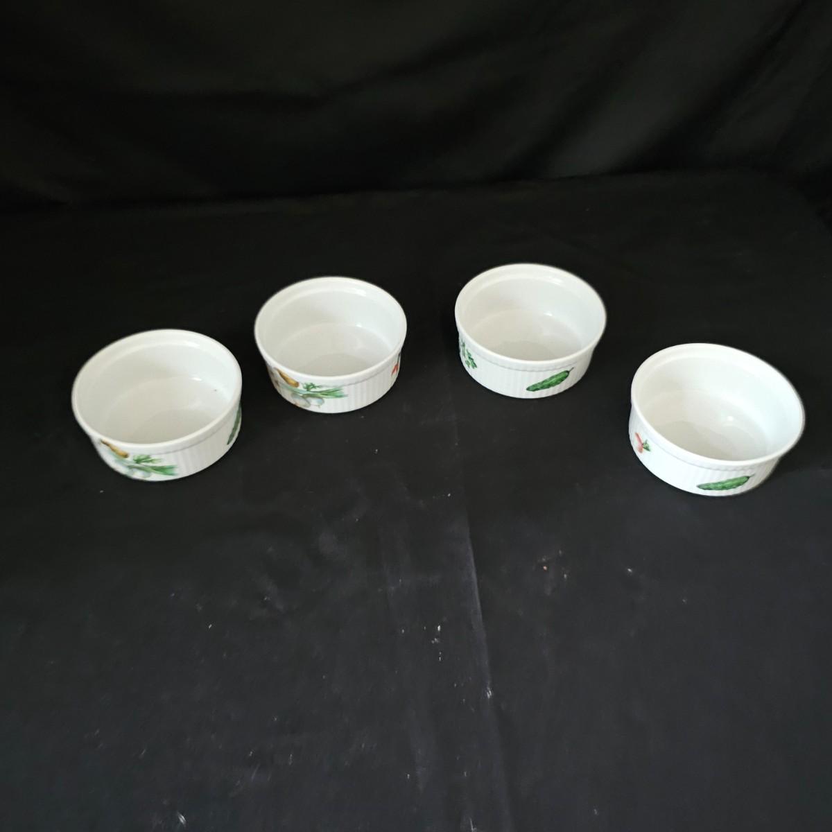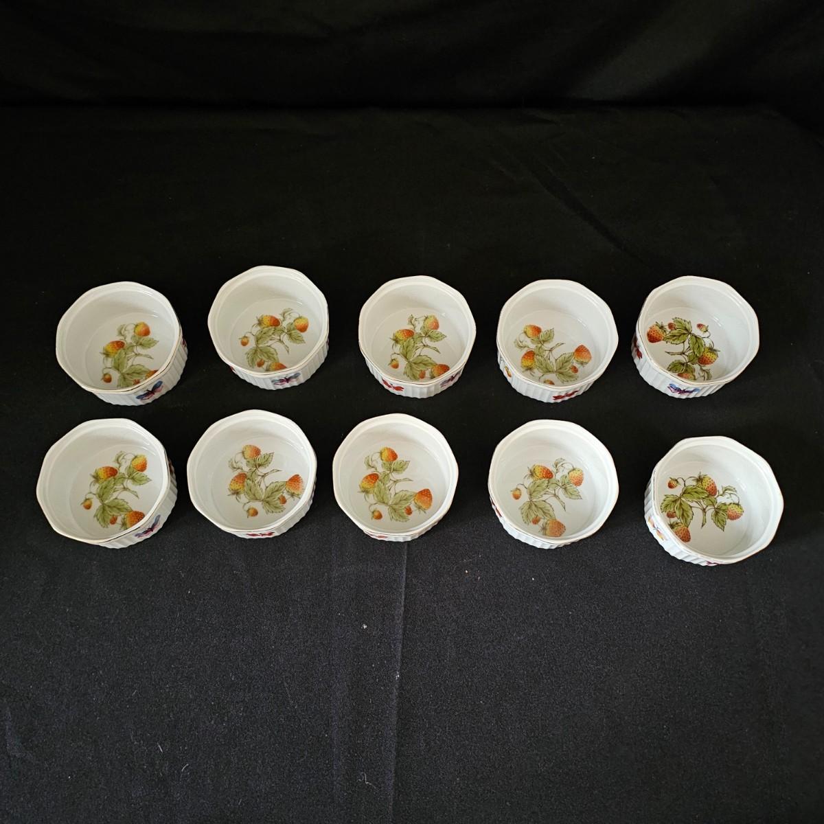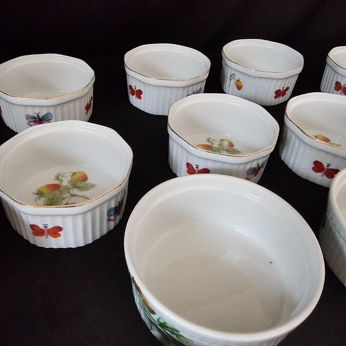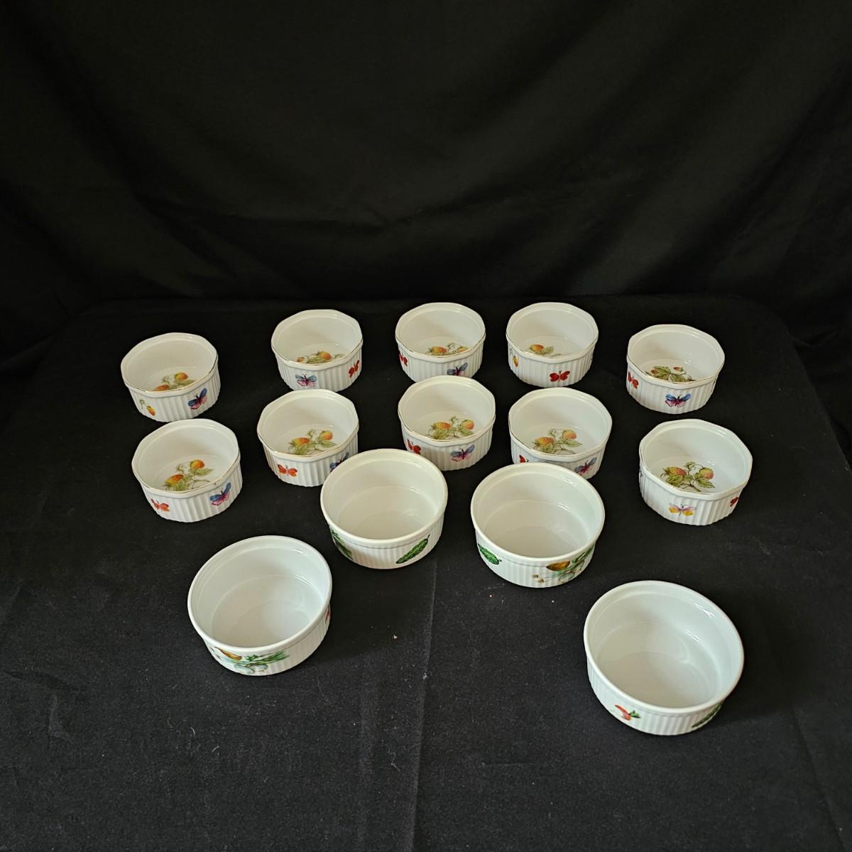 Ten garden themed Oven to Table brand raiders with octagonal tops and gold rimmed edges. Bowls measure 4"D x 2"H. Four other items are porcelain by Apilco from France. Plain interior but decorated on outsides. Each measures 4.5" D x 2"H. See photos for details. Shipping available.