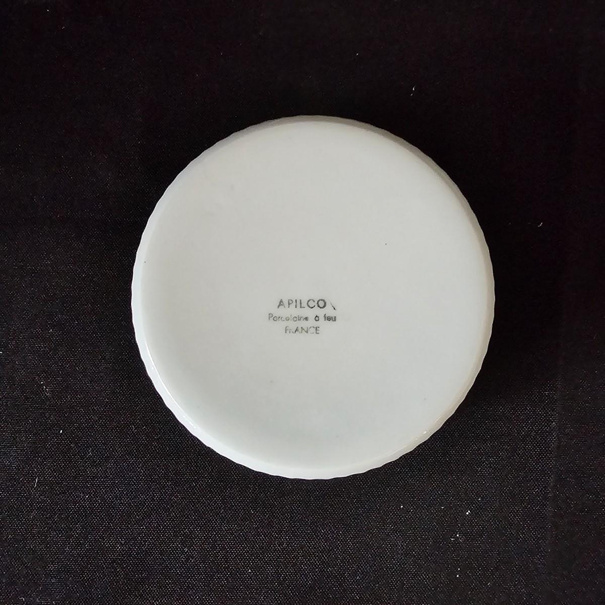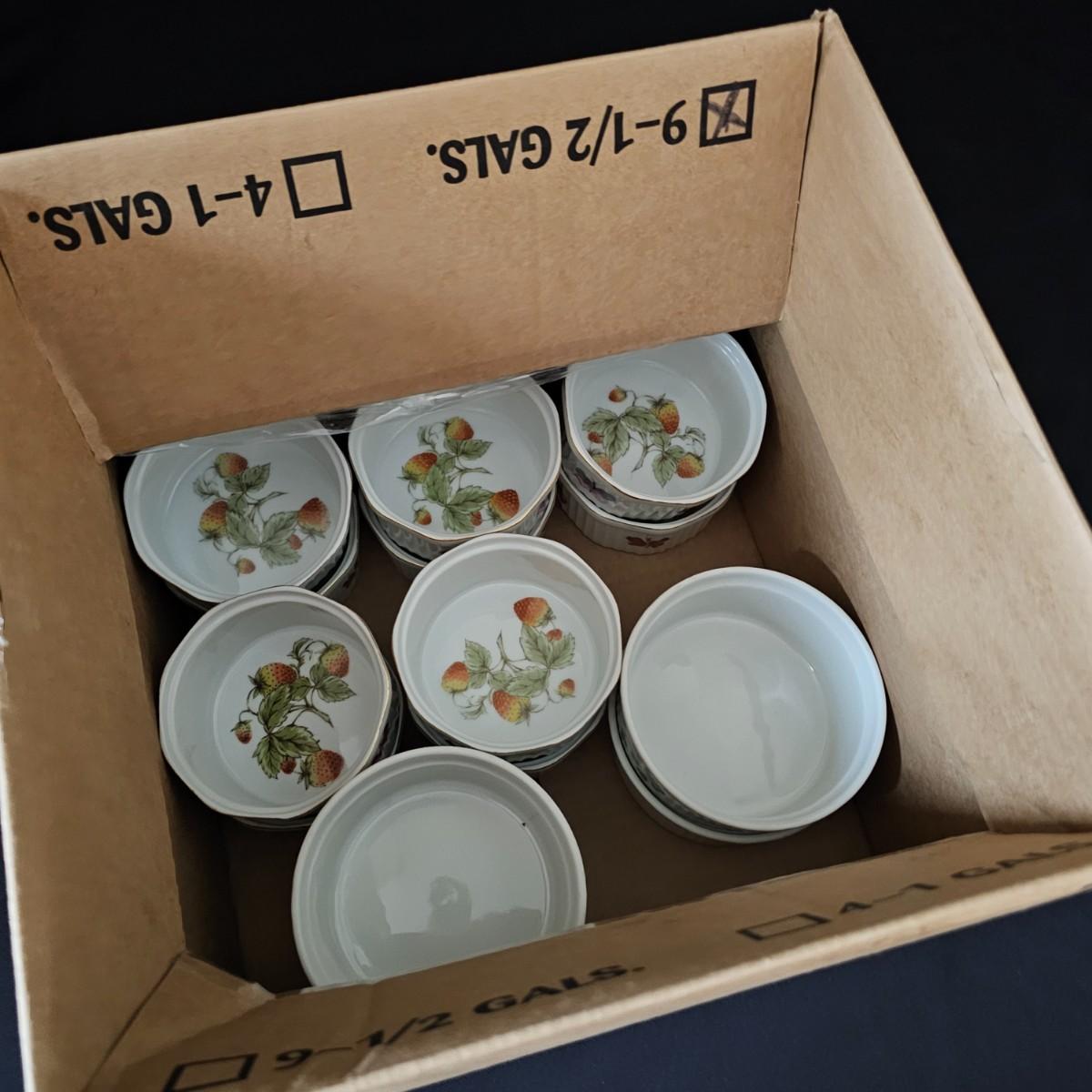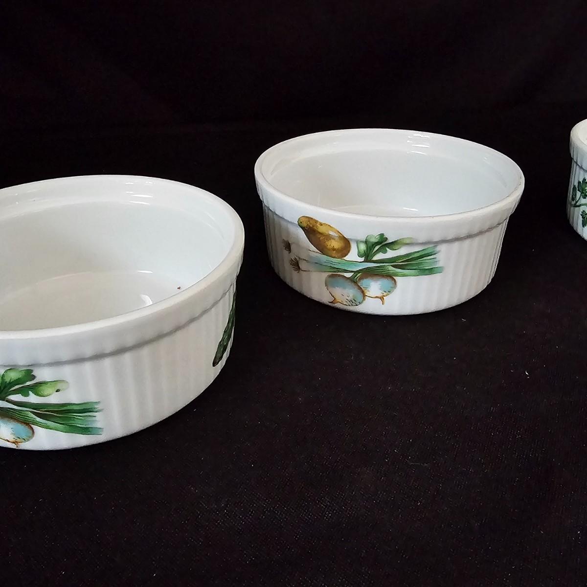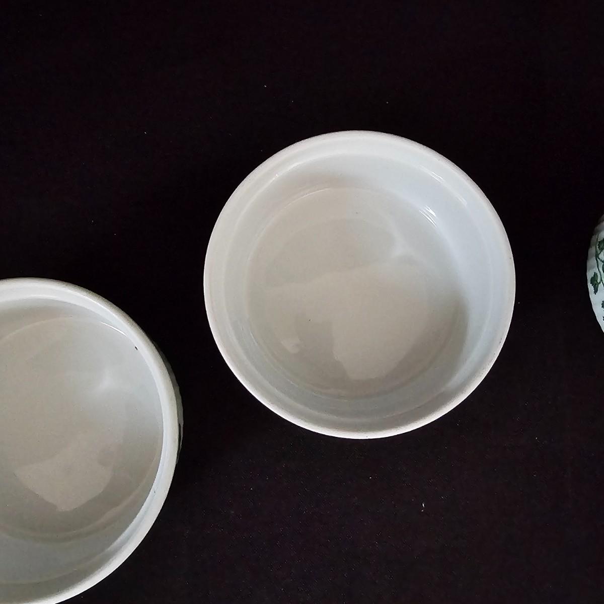 Ten garden themed Oven to Table brand raiders with octagonal tops and gold rimmed edges. Bowls measure 4"D x 2"H. Four other items are porcelain by Apilco from France. Plain interior but decorated on outsides. Each measures 4.5" D x 2"H. See photos for details. Shipping available.