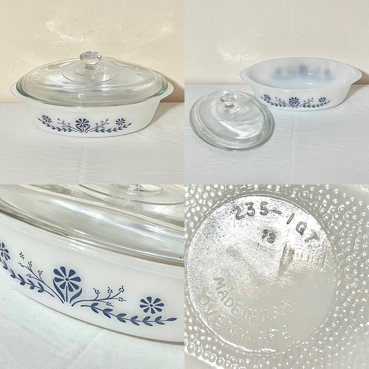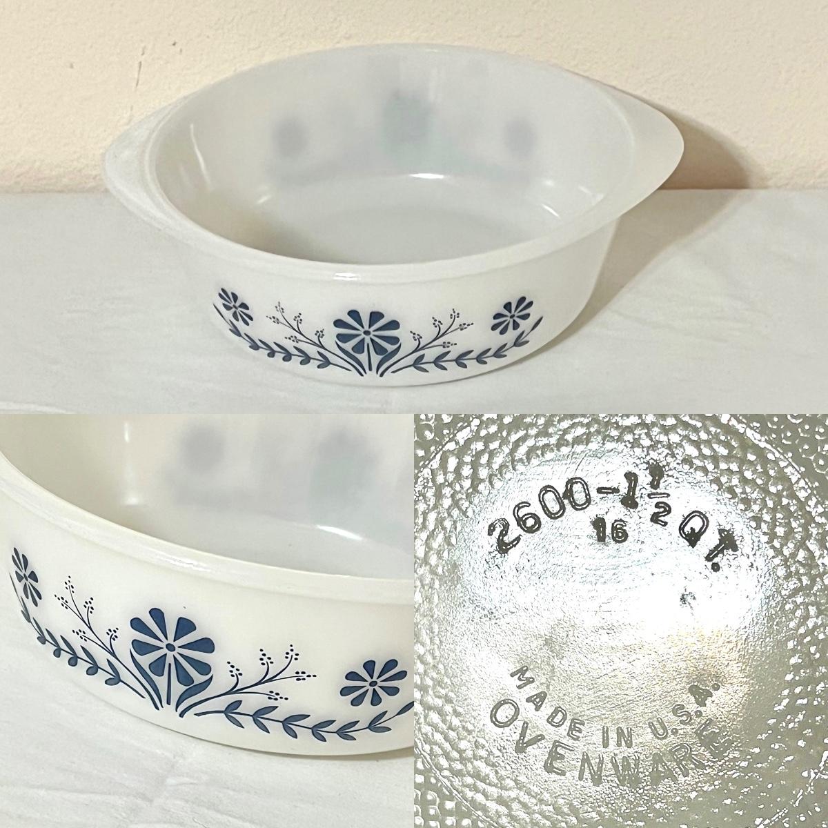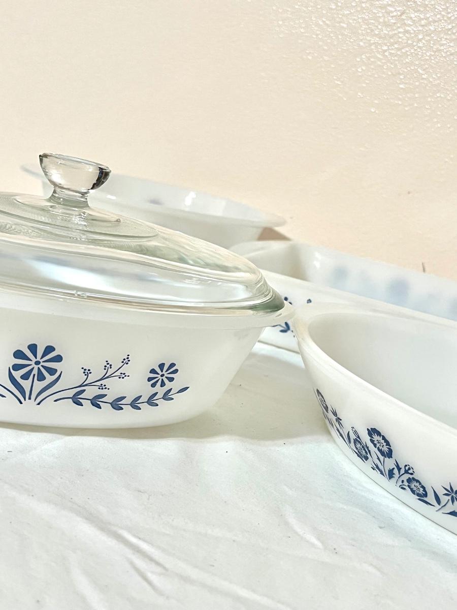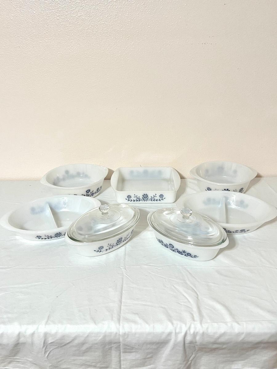 Assortment includes: 1 square casserole dish ~ 2 divided dishes ~ 2 round casserole bowls ~ 2 lidded casserole dishes. See photos for measurements. 1 of the lids as a chip underneath lid, does not affect the integrity of the dish