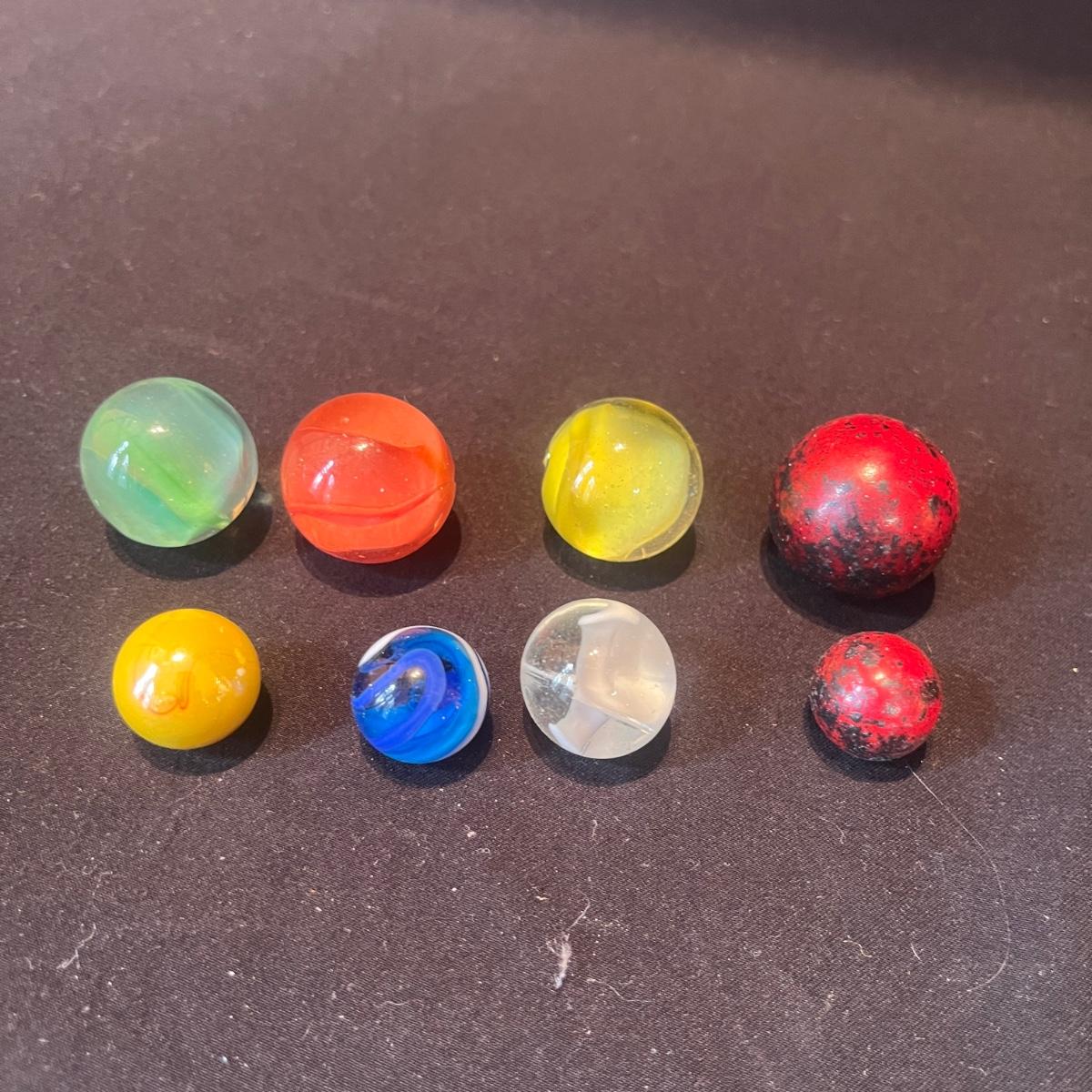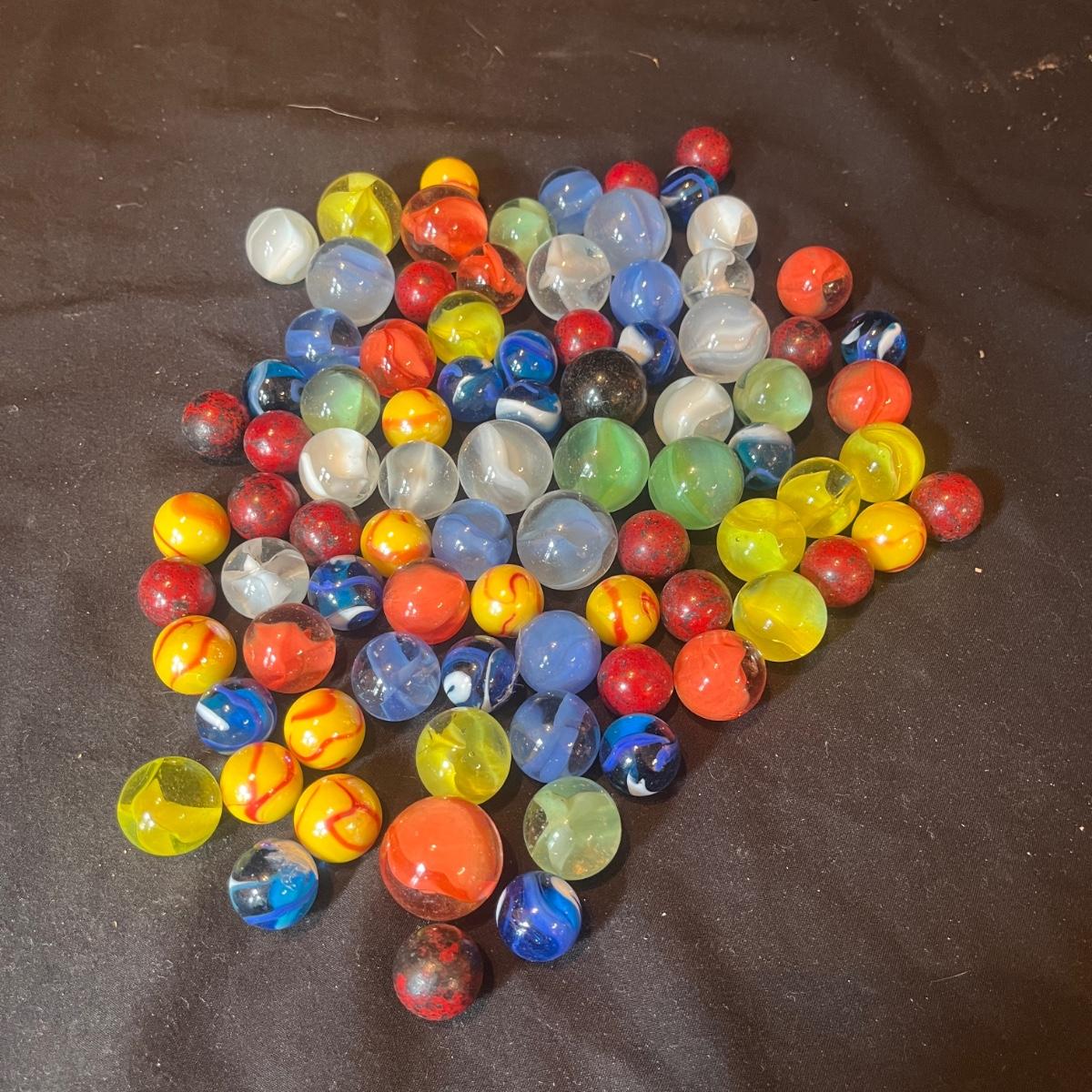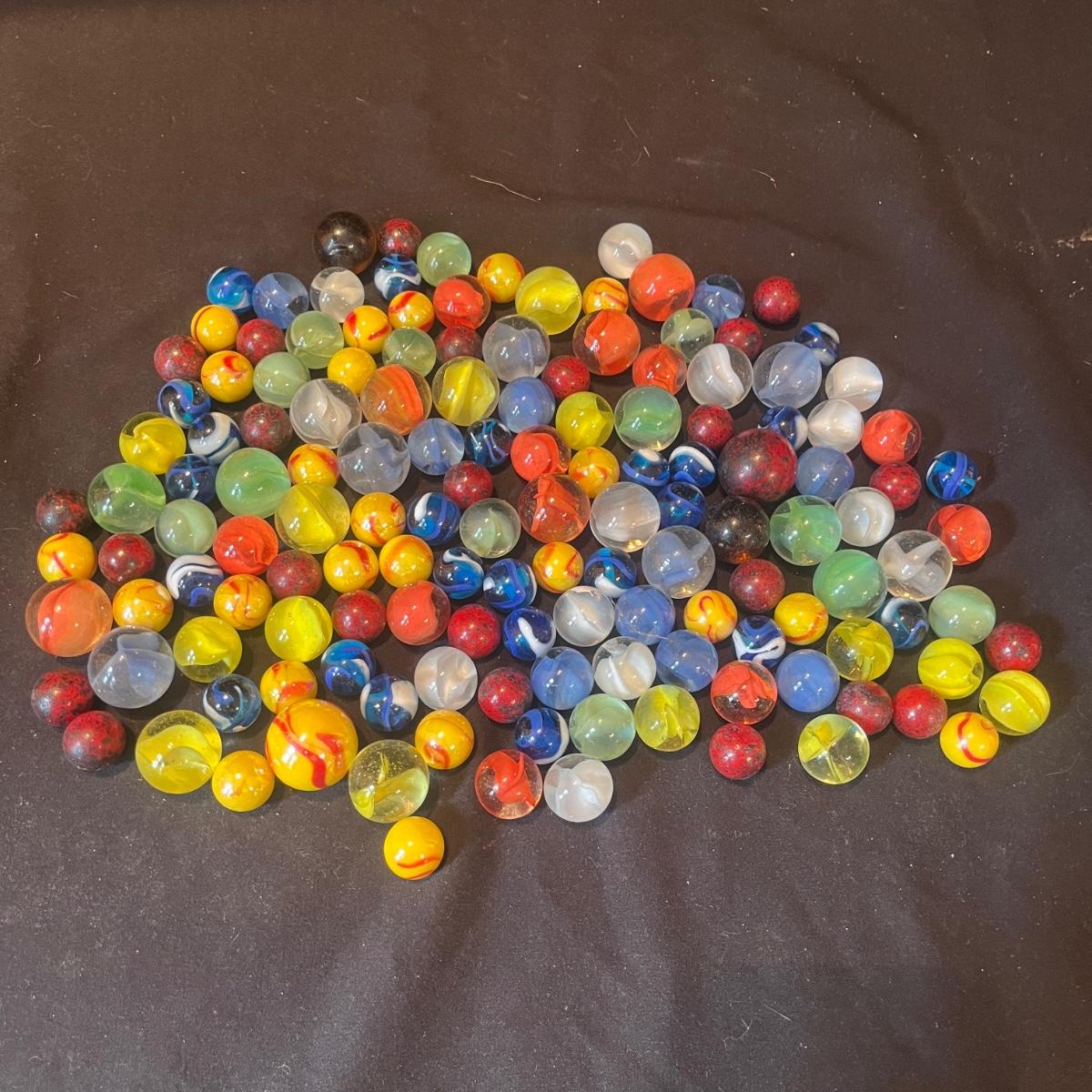 Lot contains over 130 glass marbles in a variety of colors and sizes. Largest marble measures .75”D x