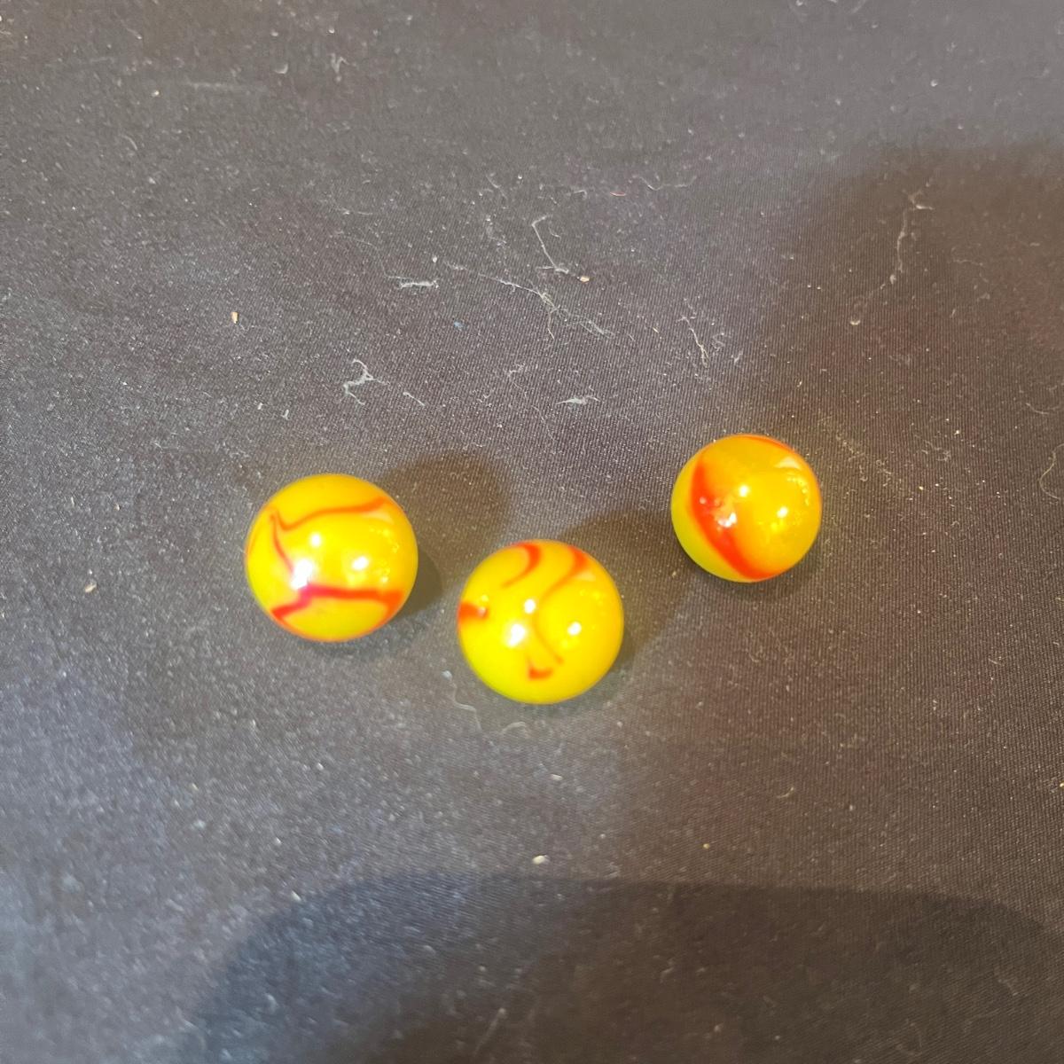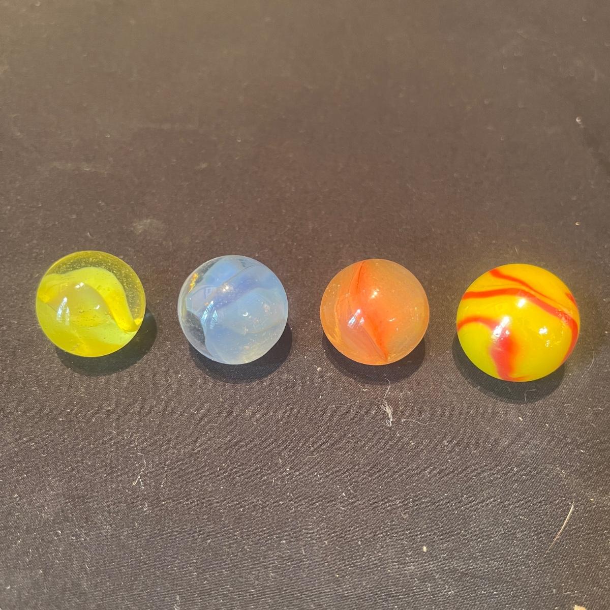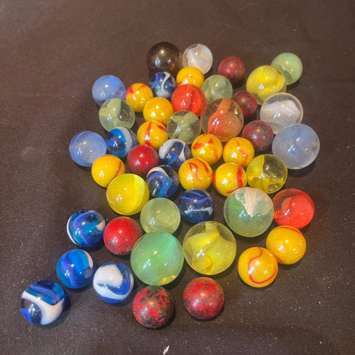 Lot contains over 130 glass marbles in a variety of colors and sizes. Largest marble measures .75”D x