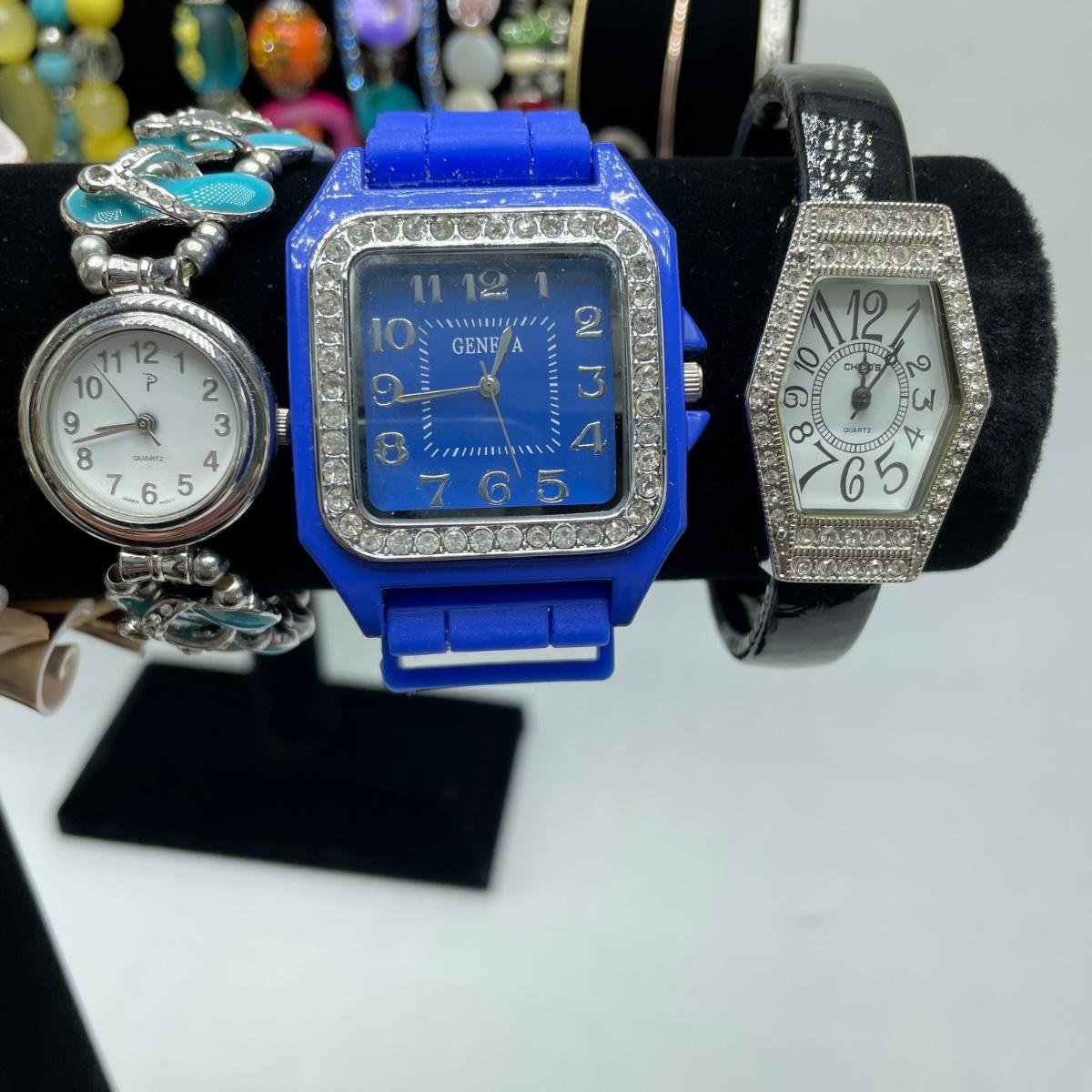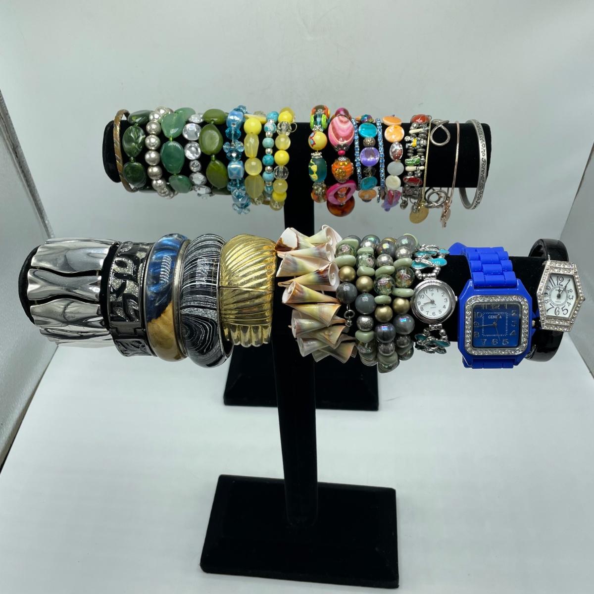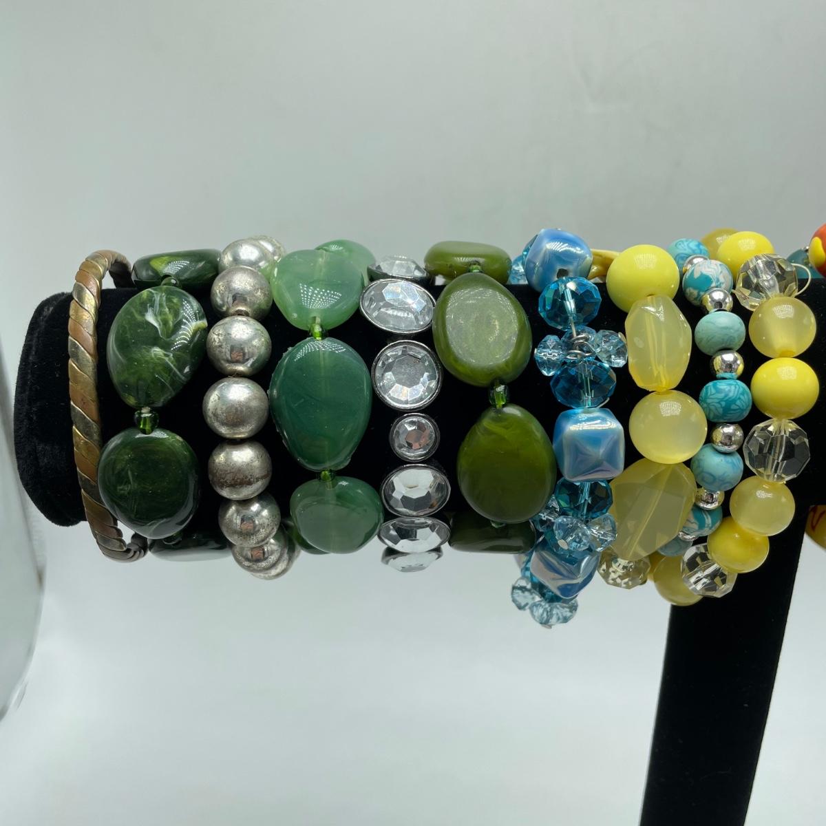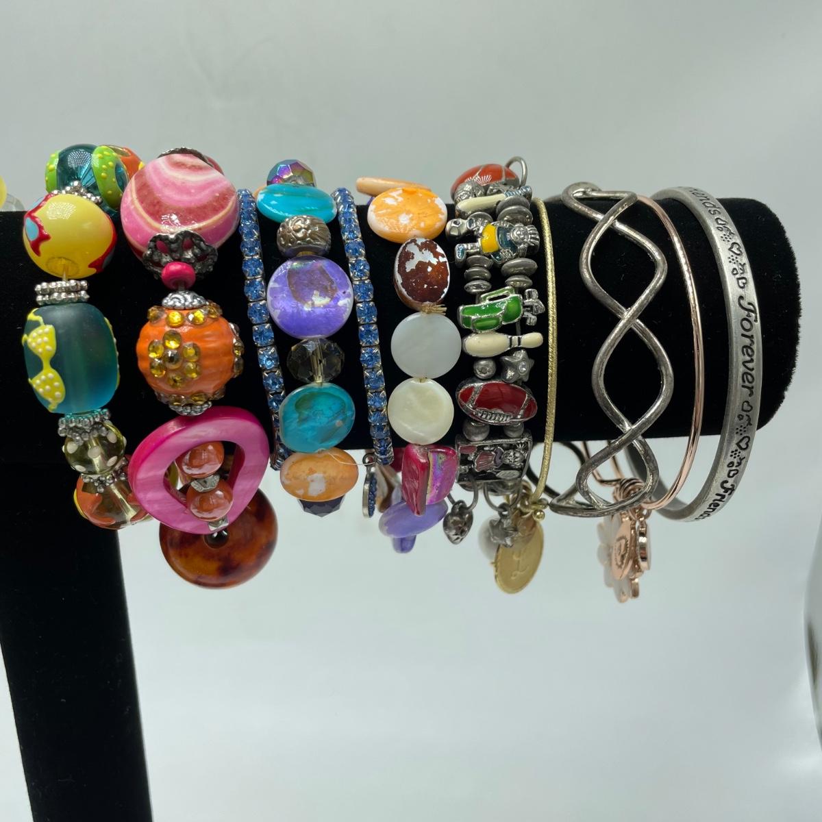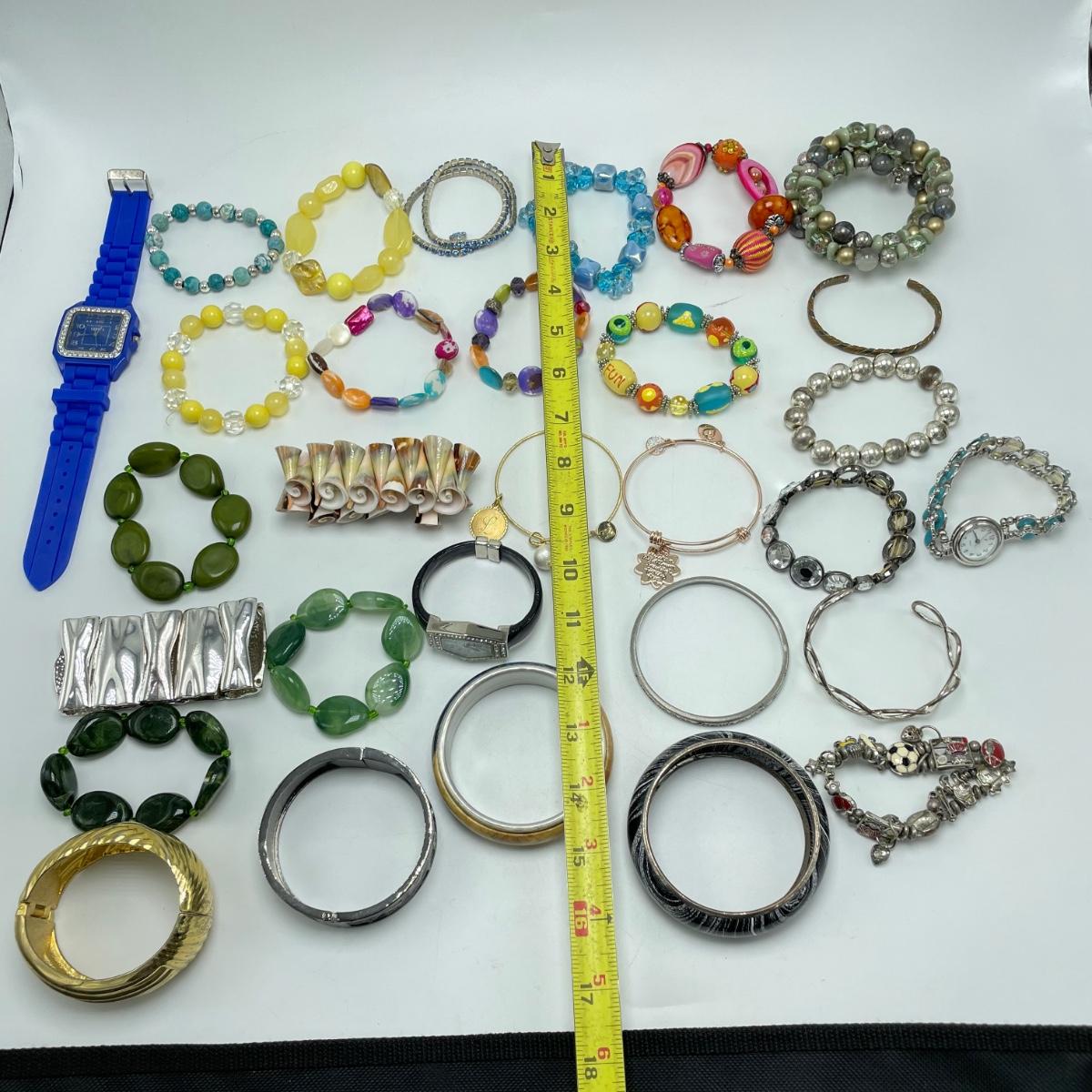 Twenty six bracelets, mostly elastic bands with some bangles and cuffs in the mix. All of the bangles and cuffs are made of metal. The sports charm bracelet and the clear blue beaded bracelet both have loose elastic that seems like it will need to be restrung soon. Lot also includes three watches - A Geneva with a rubber wrist band, a watch marked P with an elastic and metal flip flop band and a Chicos quarts watch with hinged band. See images. Shipping available.