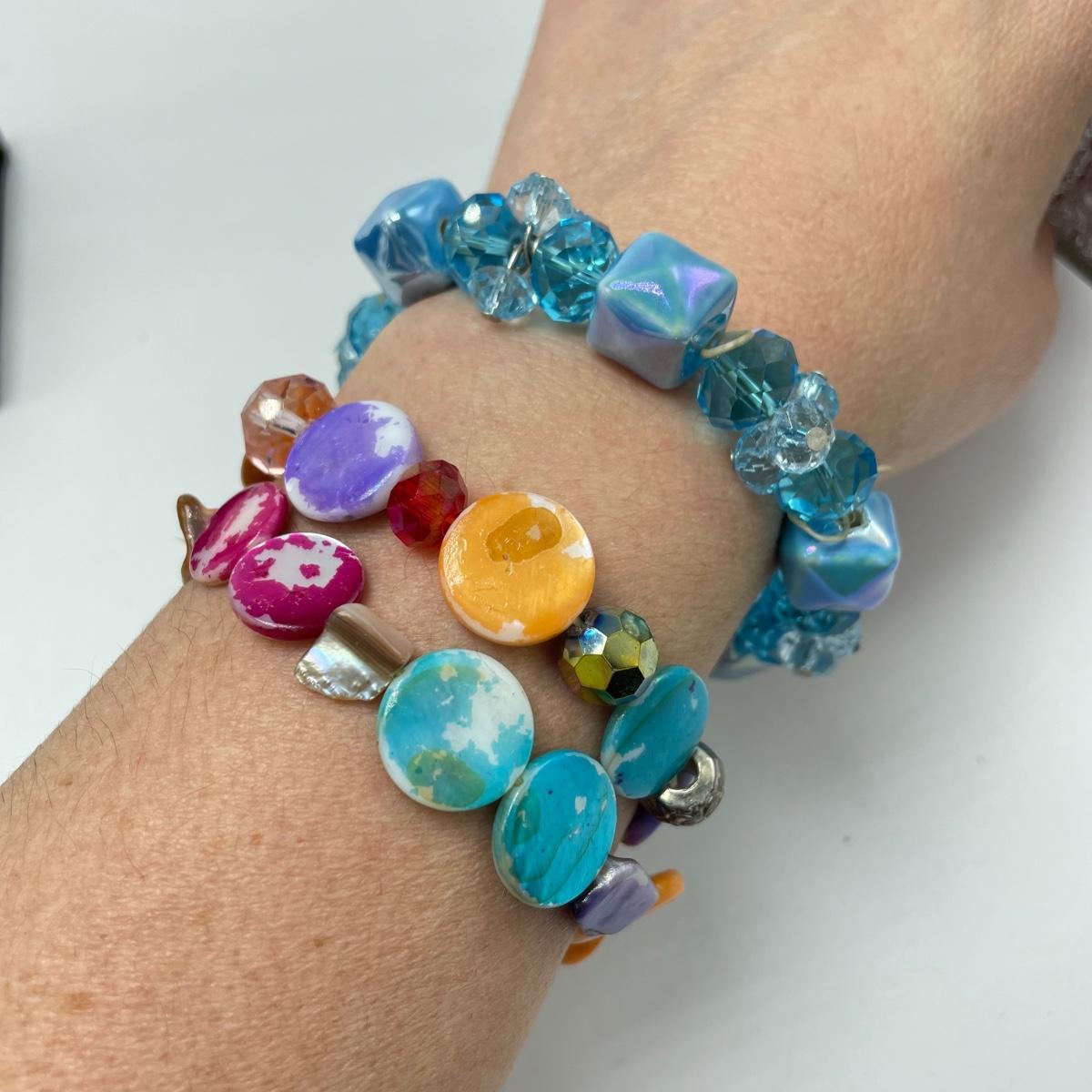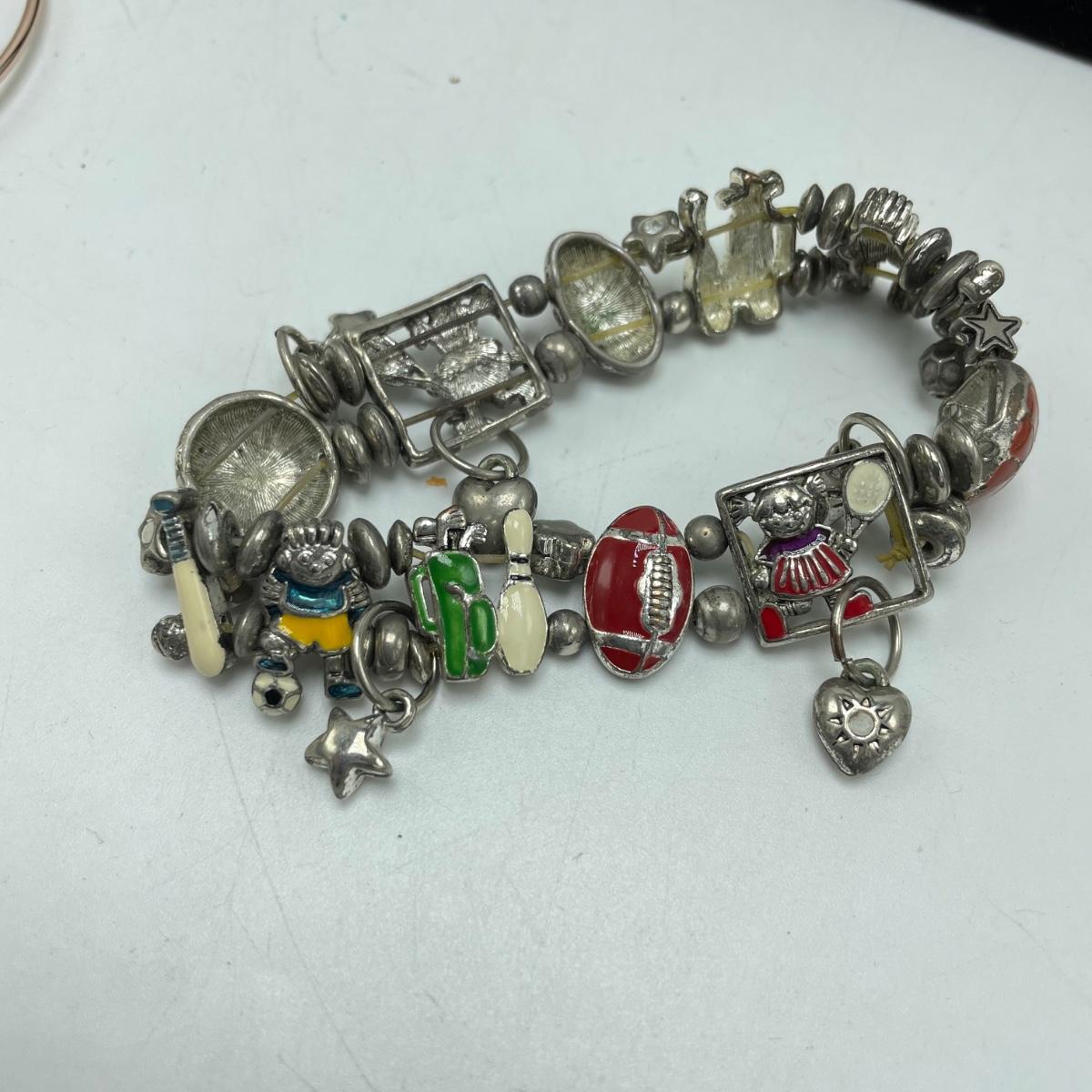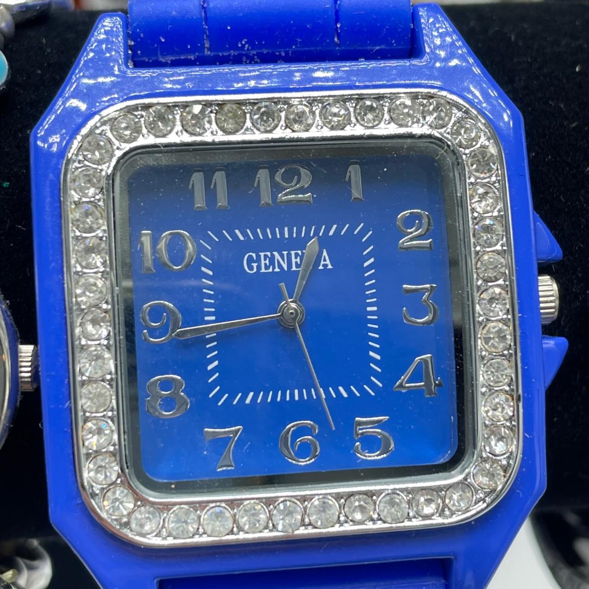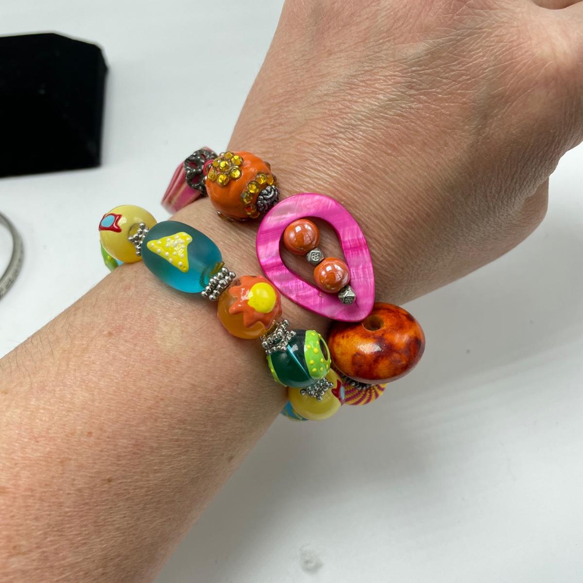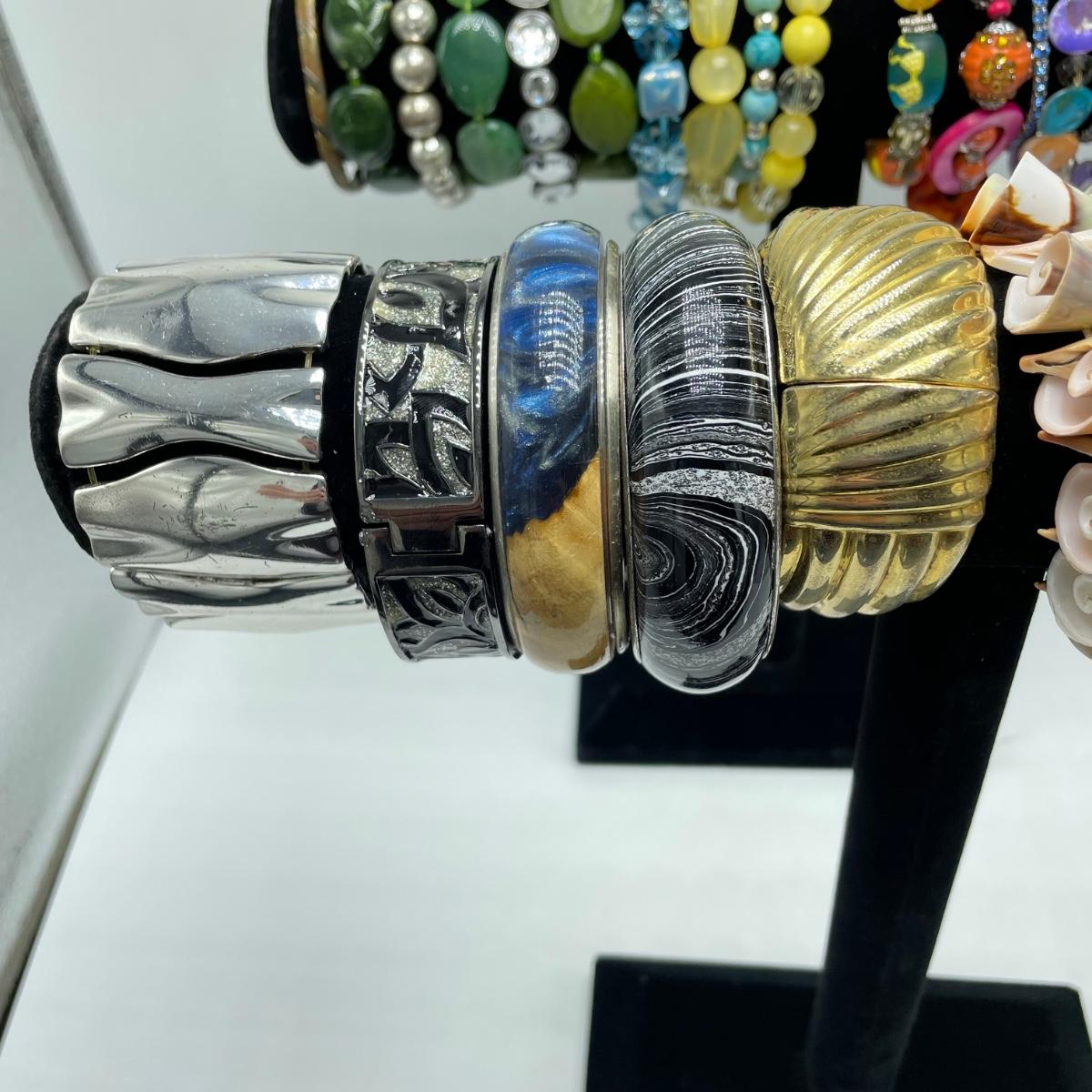 Twenty six bracelets, mostly elastic bands with some bangles and cuffs in the mix. All of the bangles and cuffs are made of metal. The sports charm bracelet and the clear blue beaded bracelet both have loose elastic that seems like it will need to be restrung soon. Lot also includes three watches - A Geneva with a rubber wrist band, a watch marked P with an elastic and metal flip flop band and a Chicos quarts watch with hinged band. See images. Shipping available.