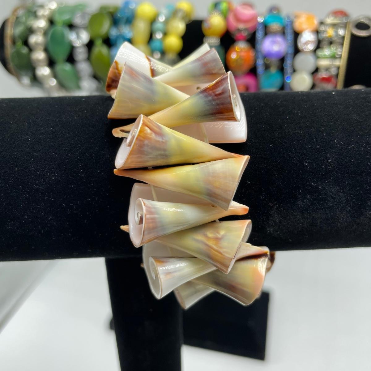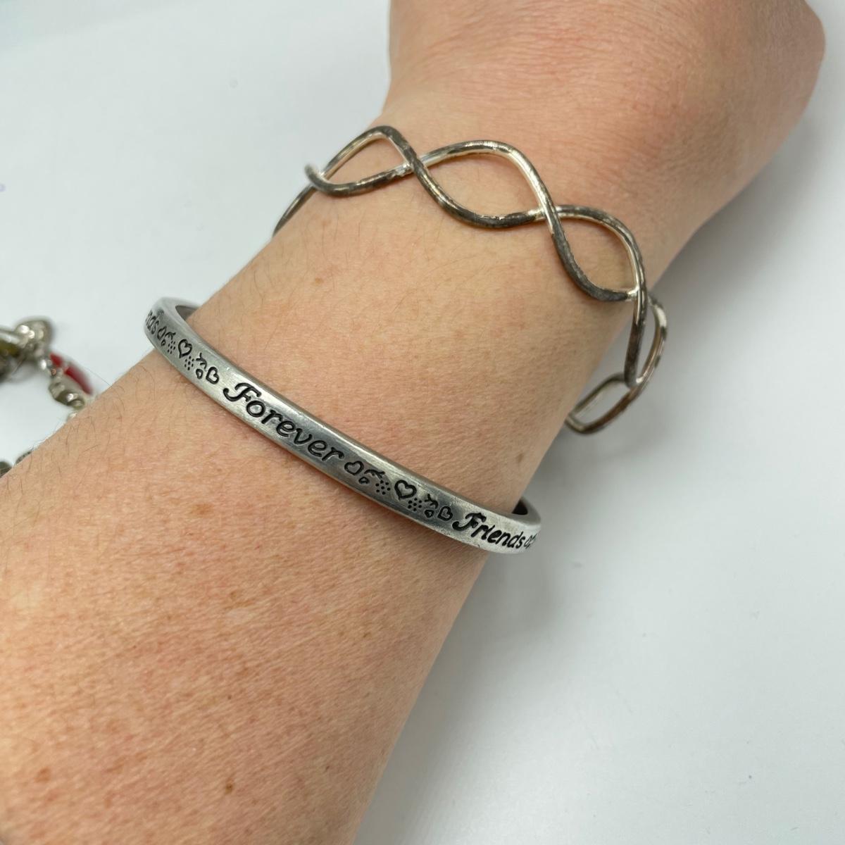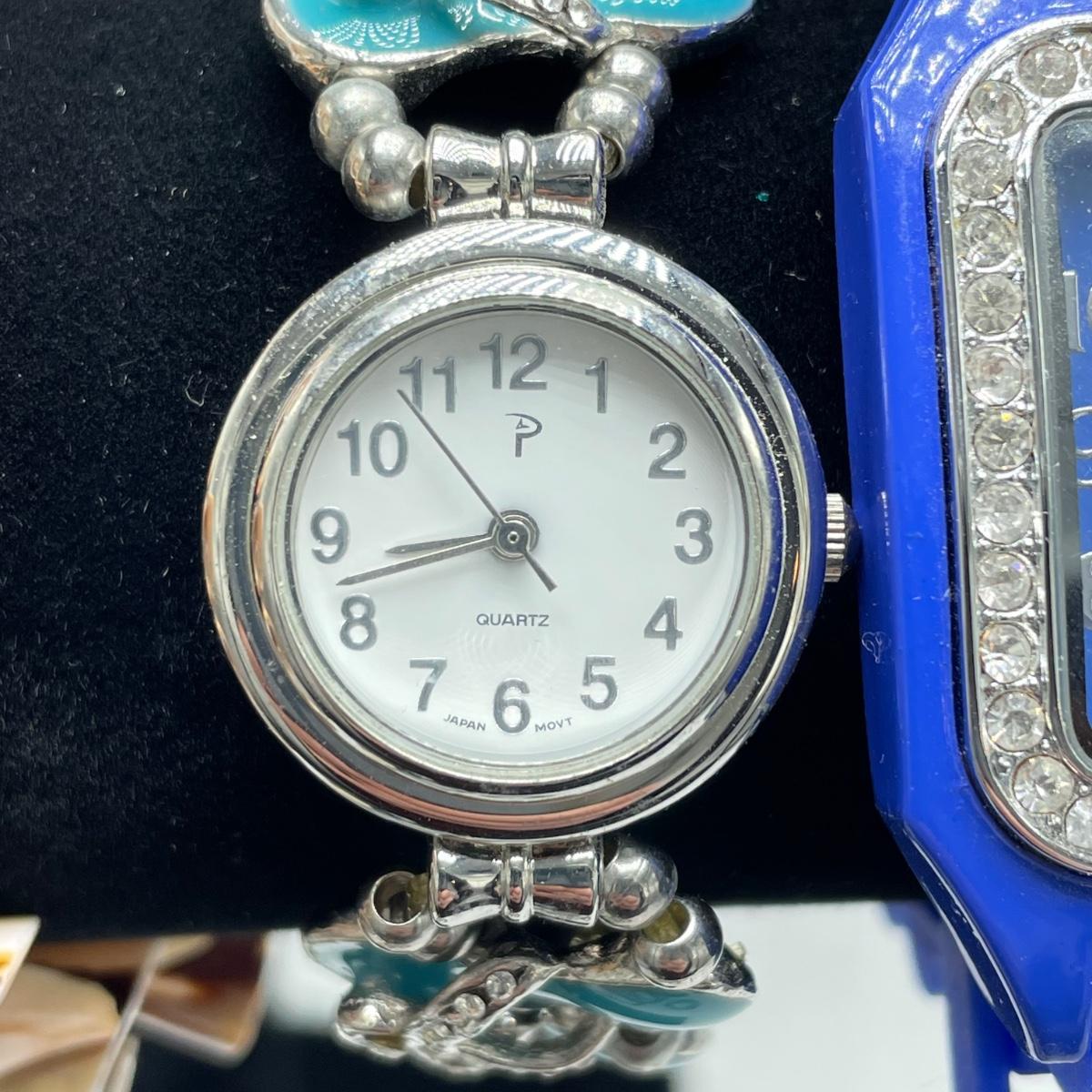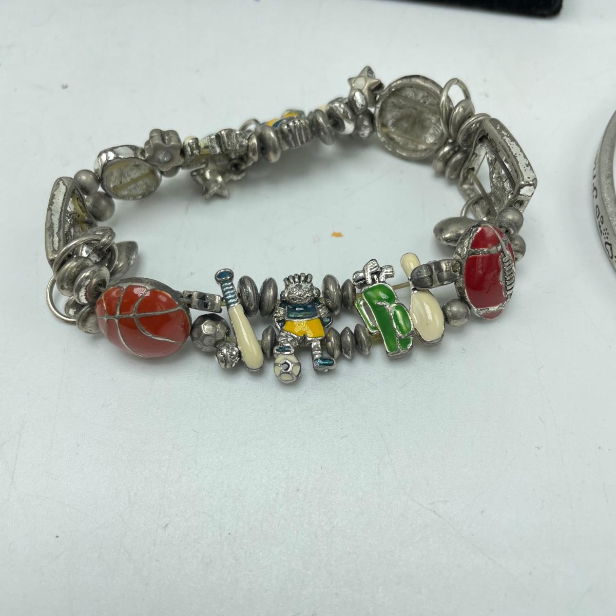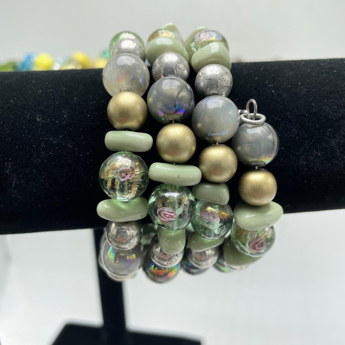 Twenty six bracelets, mostly elastic bands with some bangles and cuffs in the mix. All of the bangles and cuffs are made of metal. The sports charm bracelet and the clear blue beaded bracelet both have loose elastic that seems like it will need to be restrung soon. Lot also includes three watches - A Geneva with a rubber wrist band, a watch marked P with an elastic and metal flip flop band and a Chicos quarts watch with hinged band. See images. Shipping available.