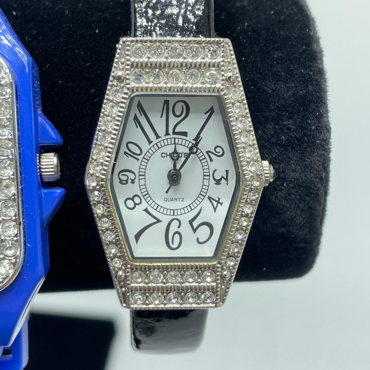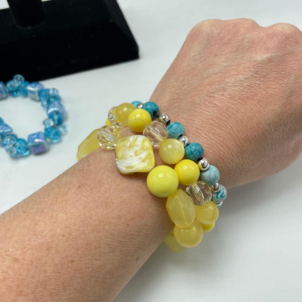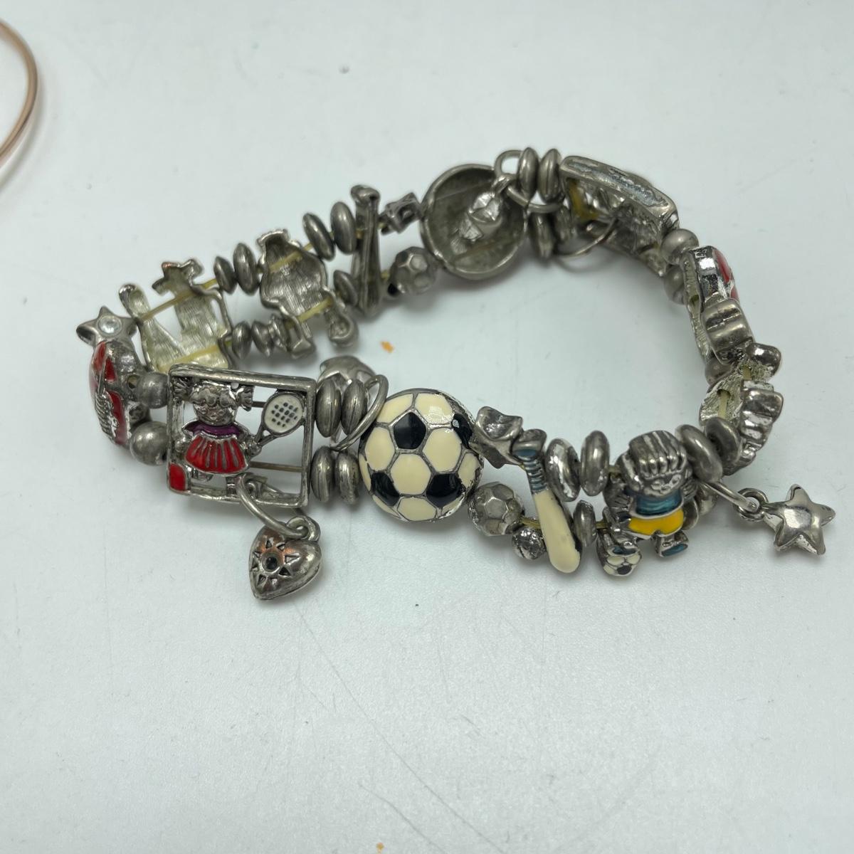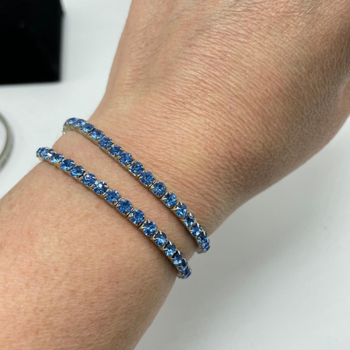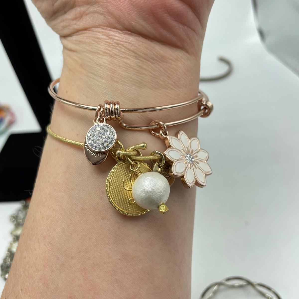 Twenty six bracelets, mostly elastic bands with some bangles and cuffs in the mix. All of the bangles and cuffs are made of metal. The sports charm bracelet and the clear blue beaded bracelet both have loose elastic that seems like it will need to be restrung soon. Lot also includes three watches - A Geneva with a rubber wrist band, a watch marked P with an elastic and metal flip flop band and a Chicos quarts watch with hinged band. See images. Shipping available.